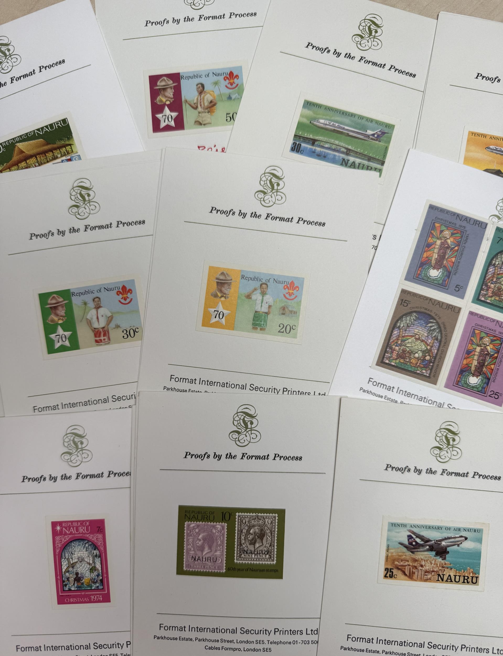 A small collection of mint 1970s Tuvalu’s Specimen sets and 1970s Nauru imperforate colour proof stamps affixed to x22 Format International cards