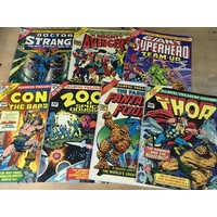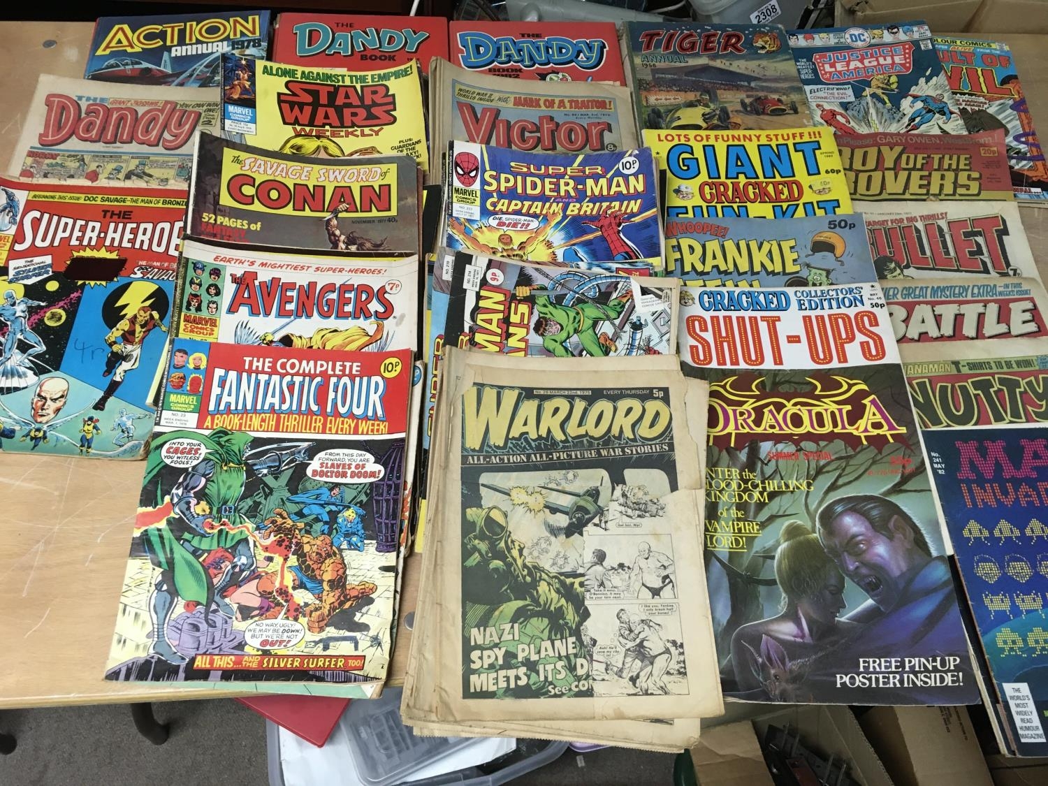 A box containing a collection of UK comics, including Marvel Superheroes, Avengers, Spider-Man and Star Wars, also Dandy, Warlord, Victor Etc
