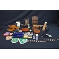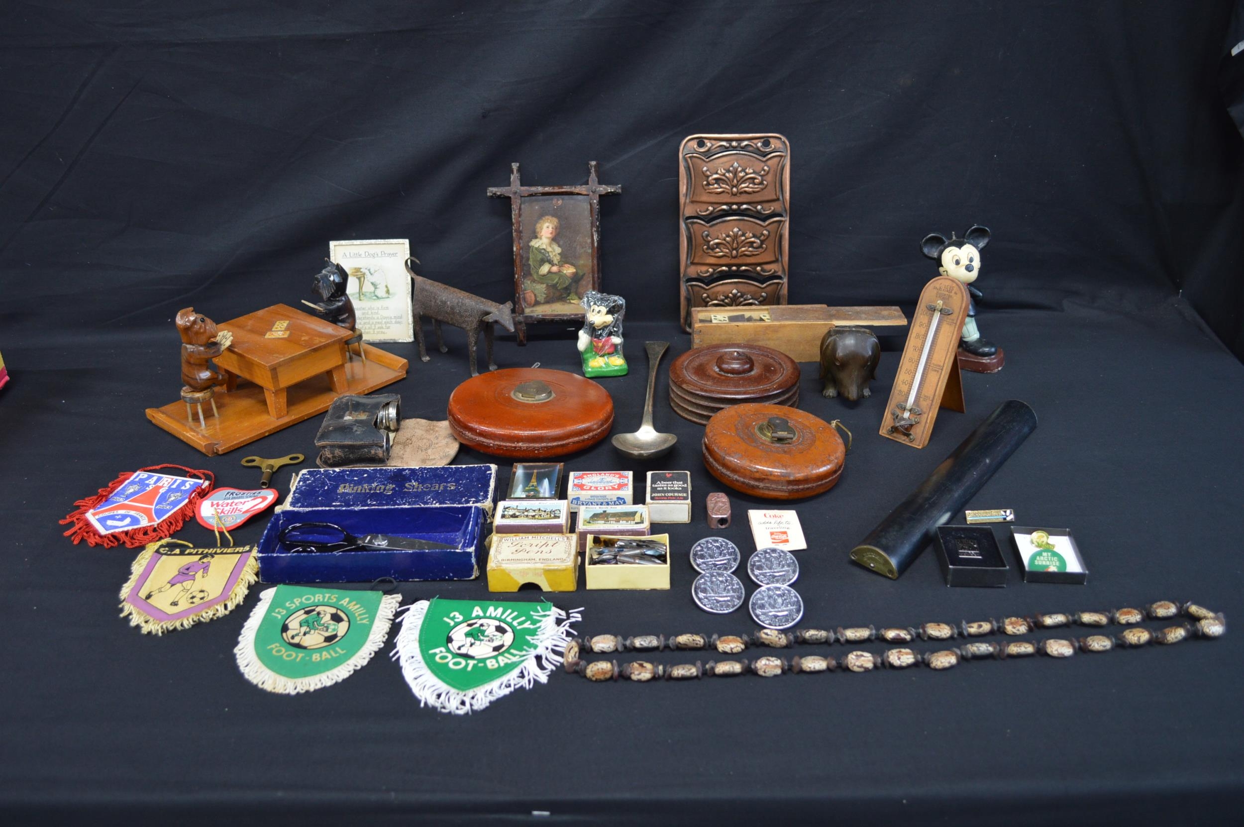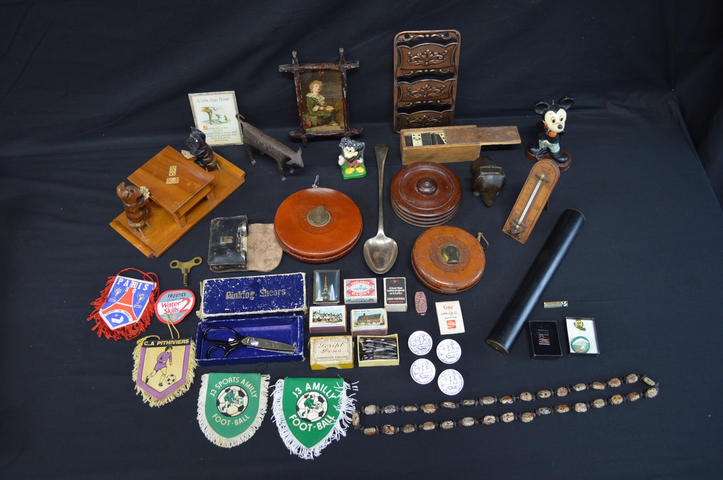 Collection of sundry items to include: two leather tape measures, opera glasses, Mickey Mouse candles, Domino's and letter rack etc