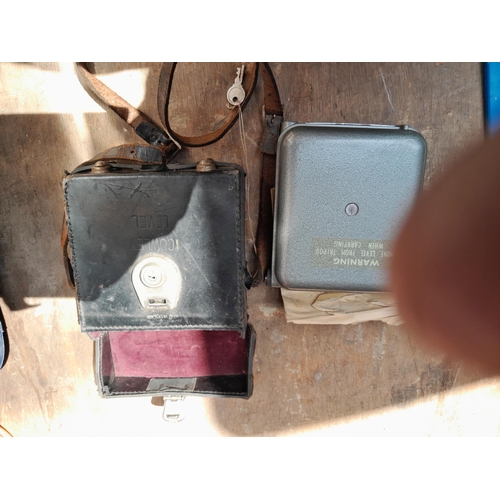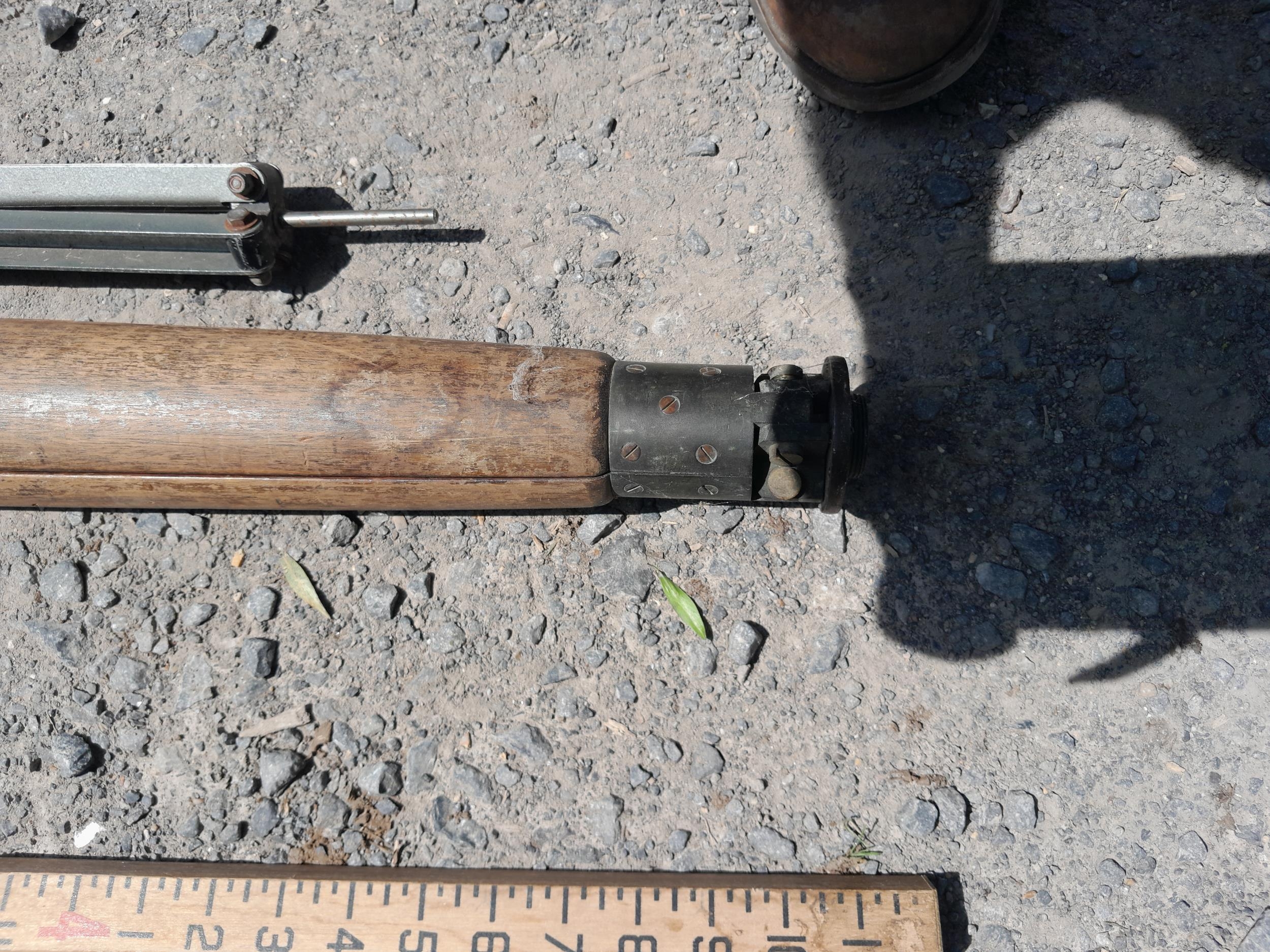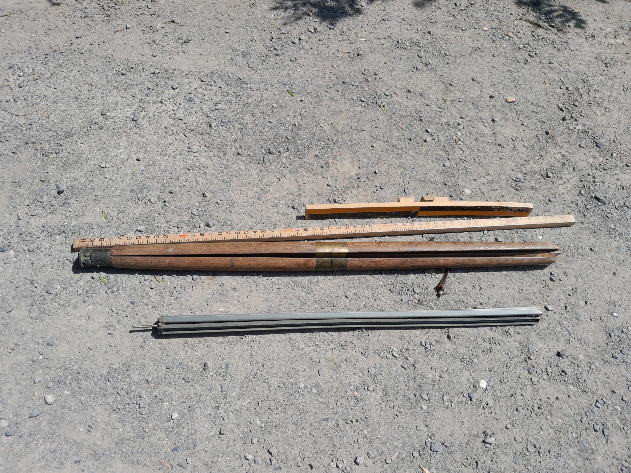 Early 20th century hardwood surveyors tripod and one other, measuring stick etc.