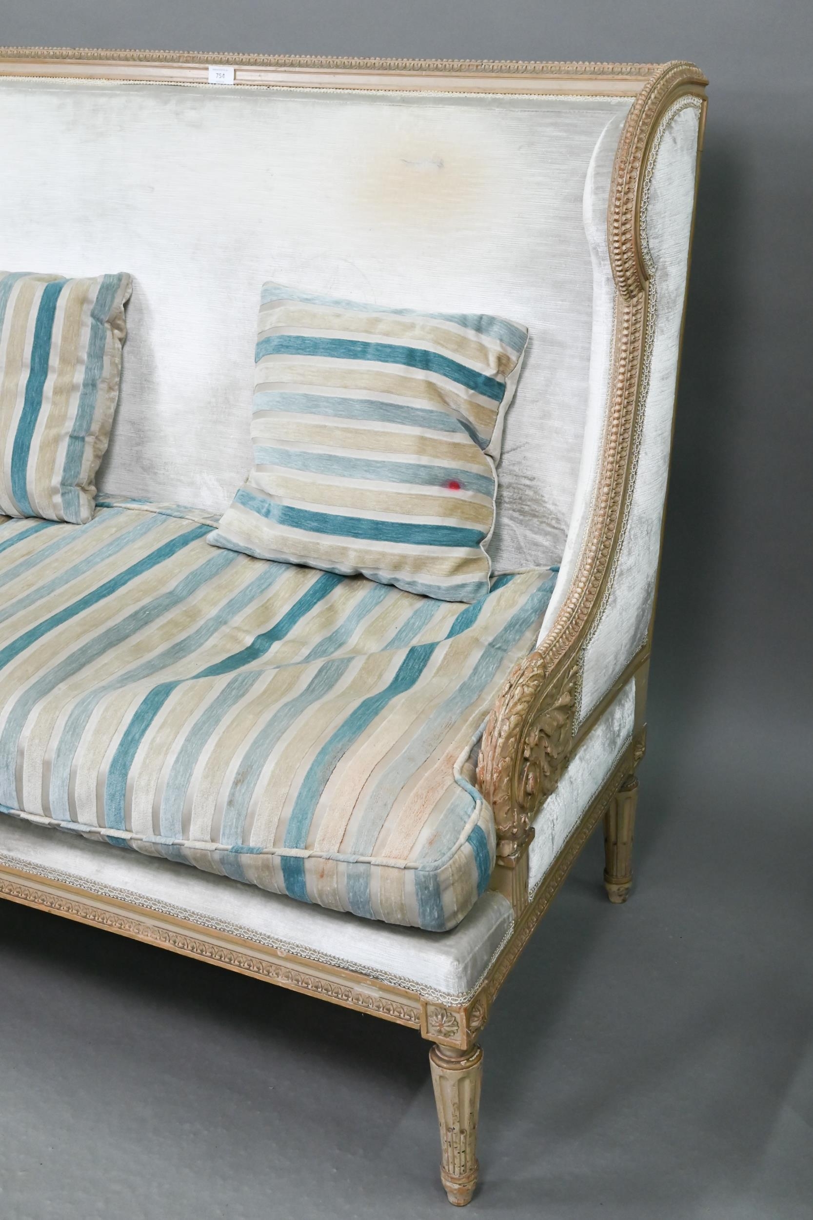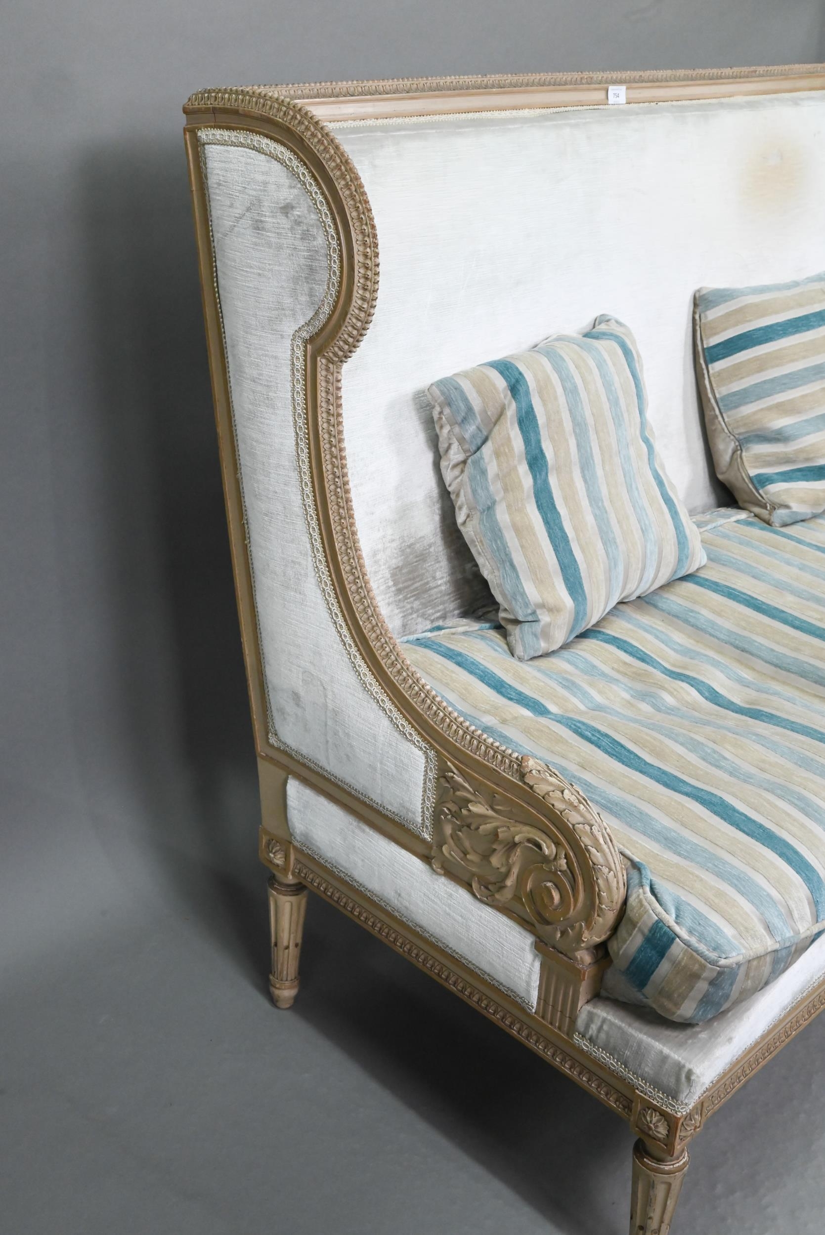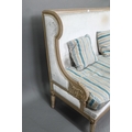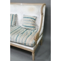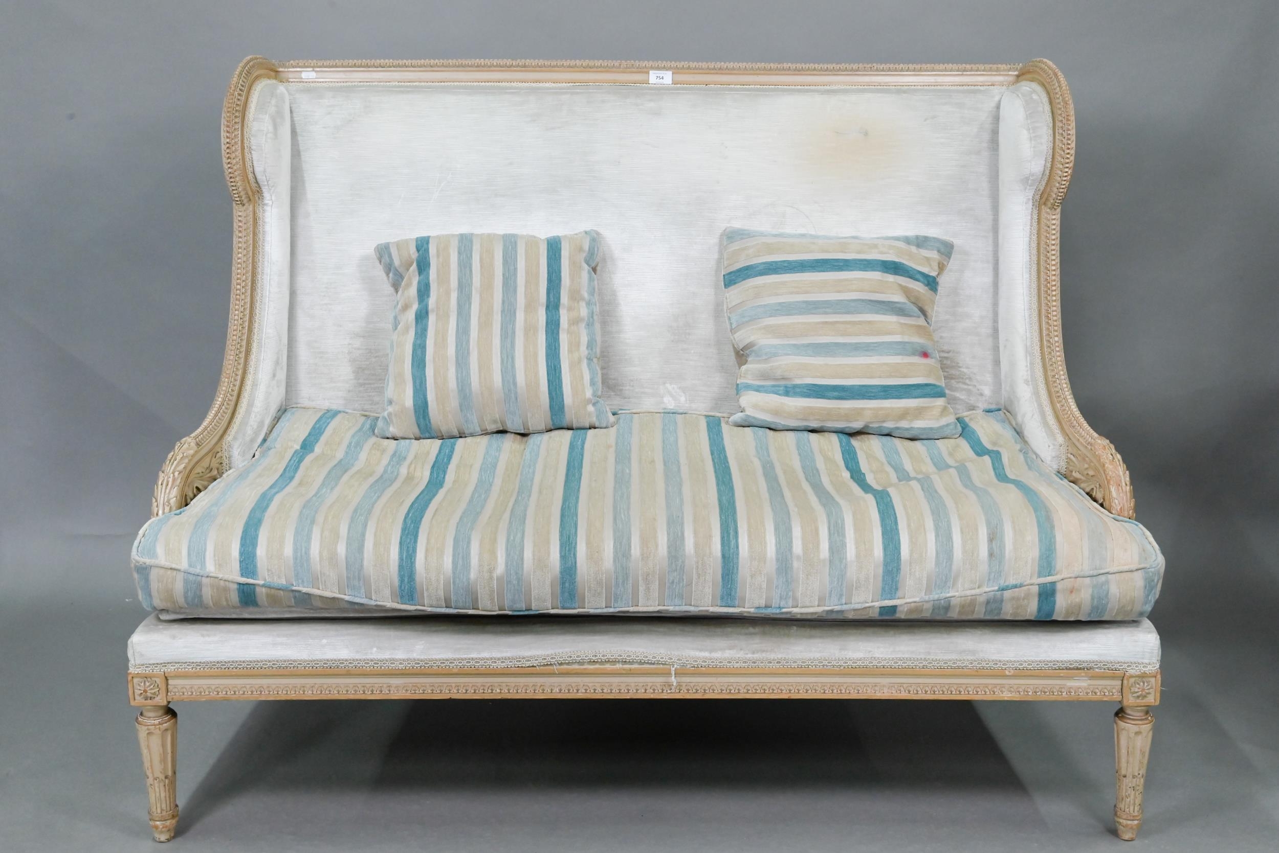 A French Empire style two seater sofa, the carved and moulded frame washed off-white, having a fabric upholstered high back over a striped loose seat cushion, raised on turned fluted front legs, 134 cm w x 70 cm x 106 cm h (the seat approx. 60 cm deep x 45 cm h)