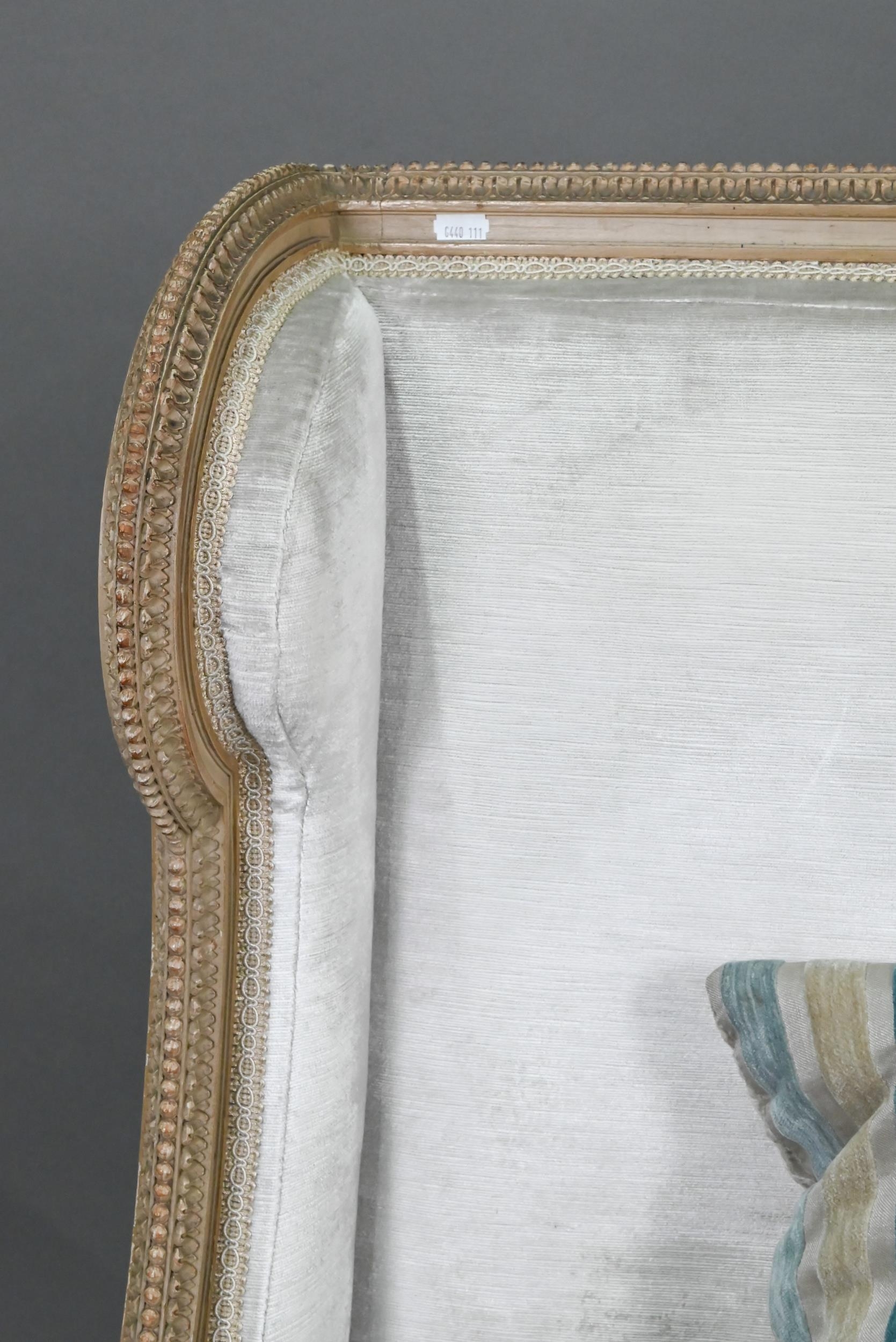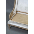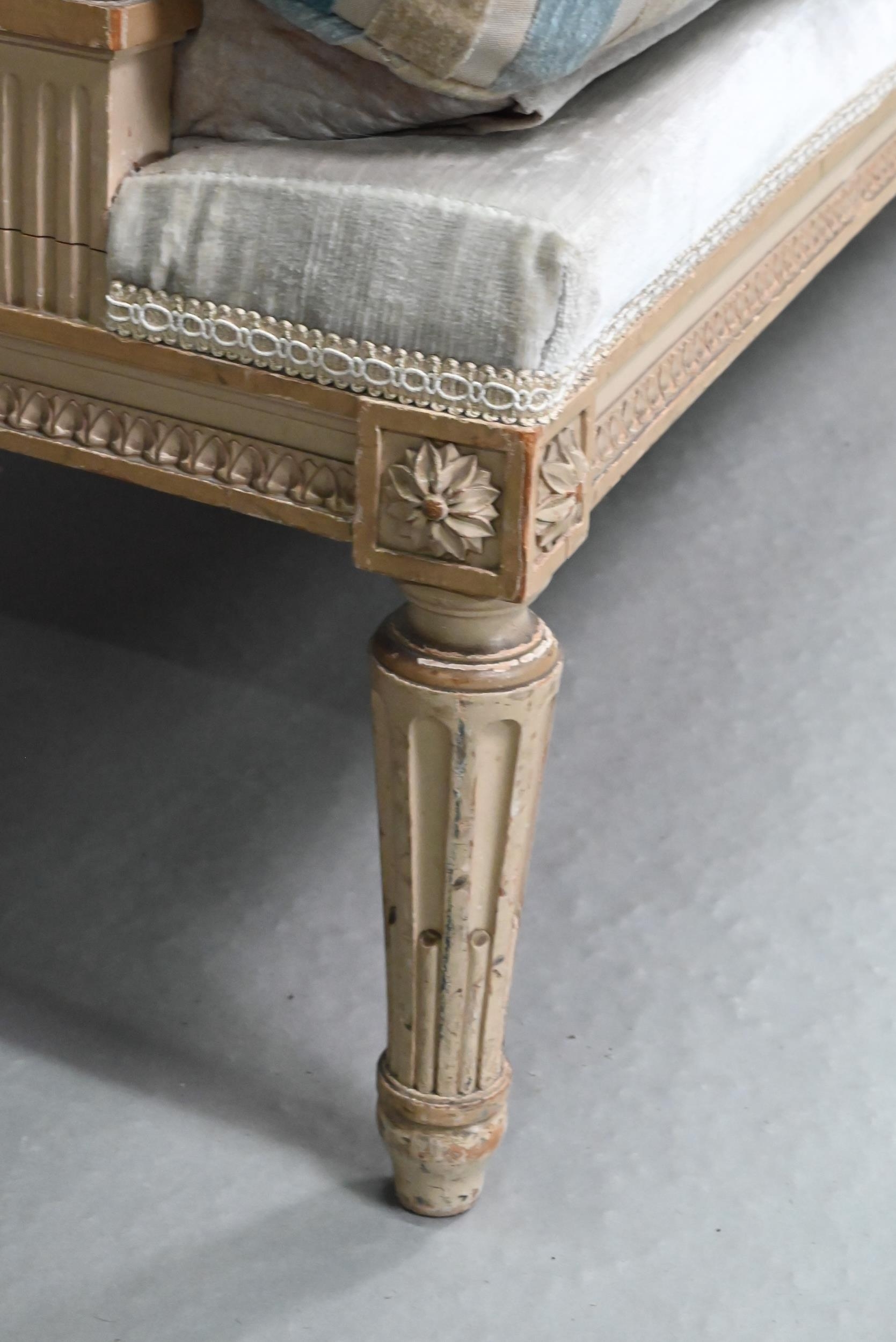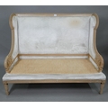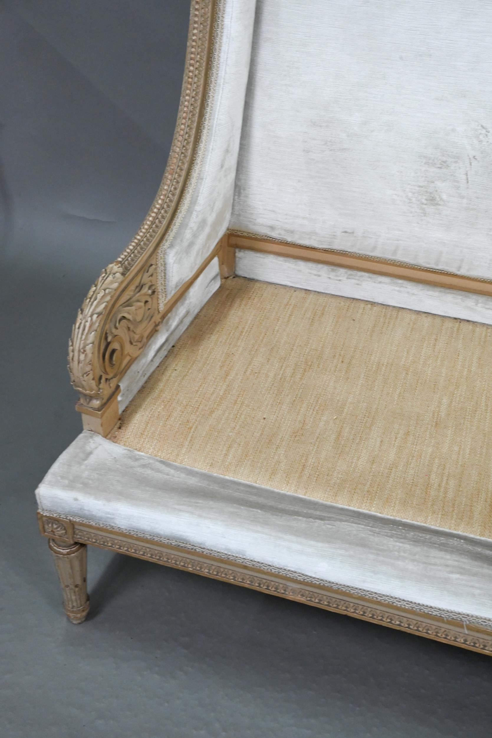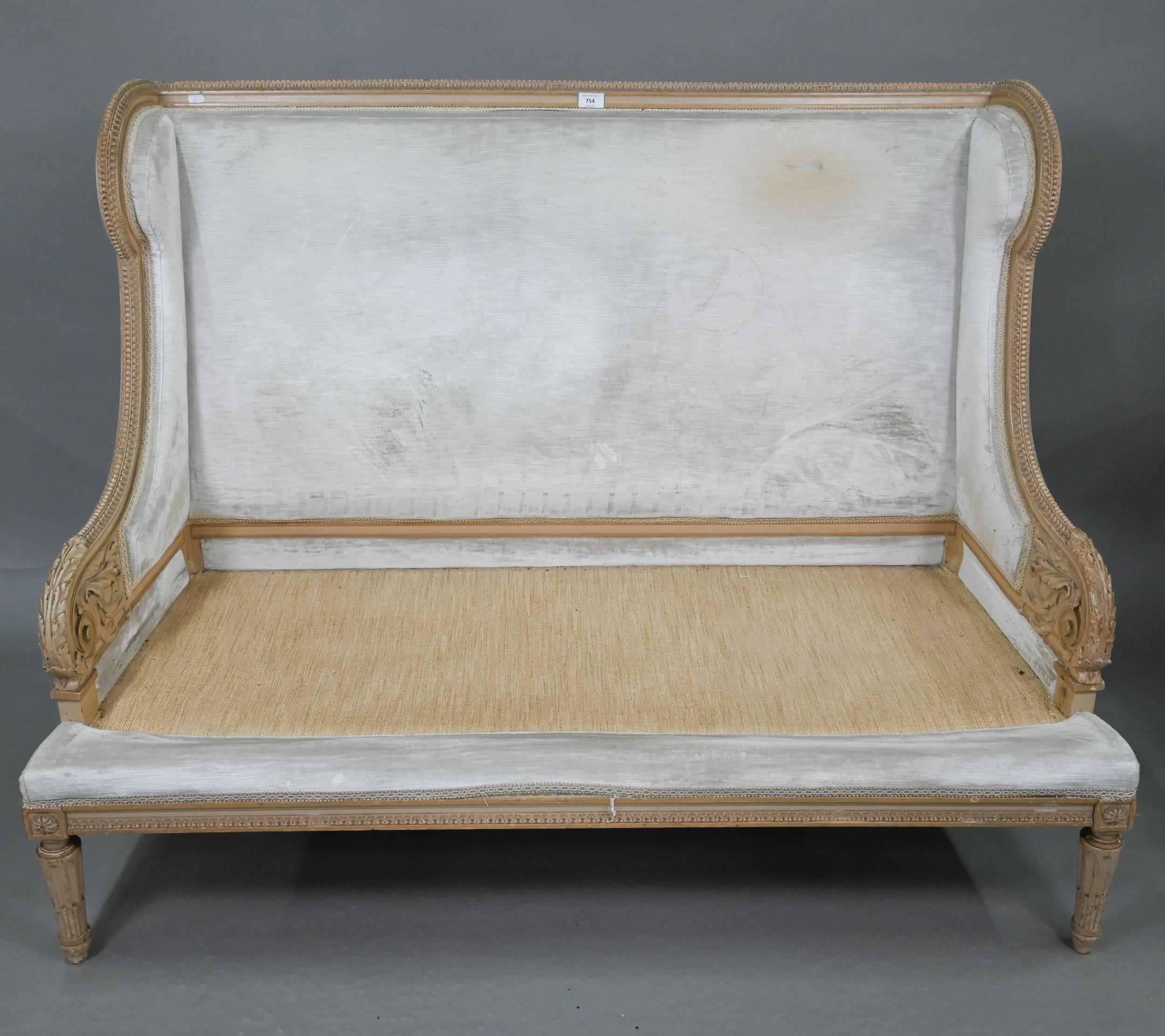 A French Empire style two seater sofa, the carved and moulded frame washed off-white, having a fabric upholstered high back over a striped loose seat cushion, raised on turned fluted front legs, 134 cm w x 70 cm x 106 cm h (the seat approx. 60 cm deep x 45 cm h)