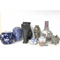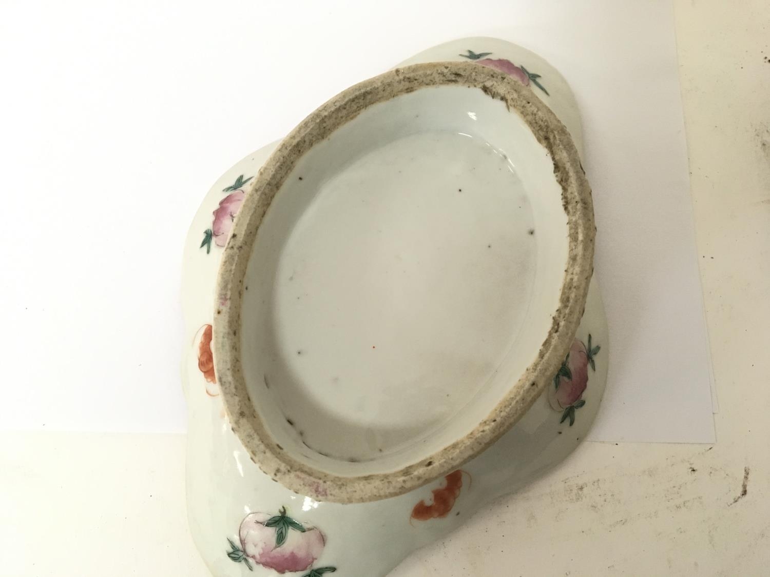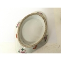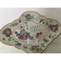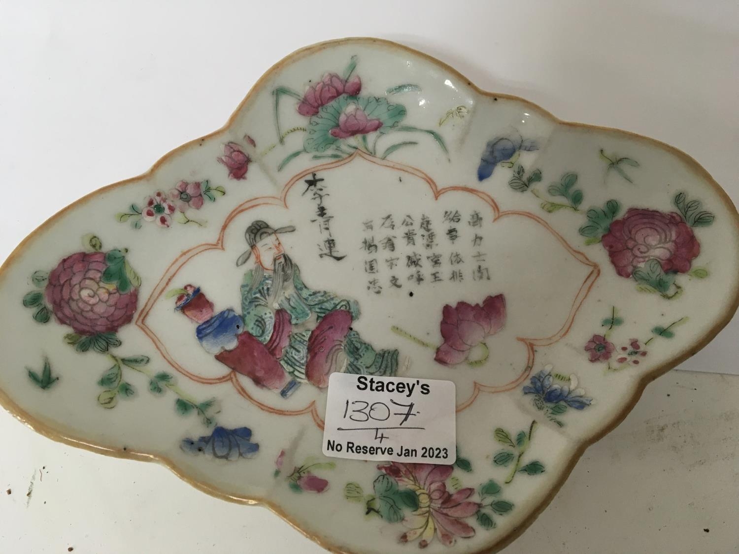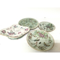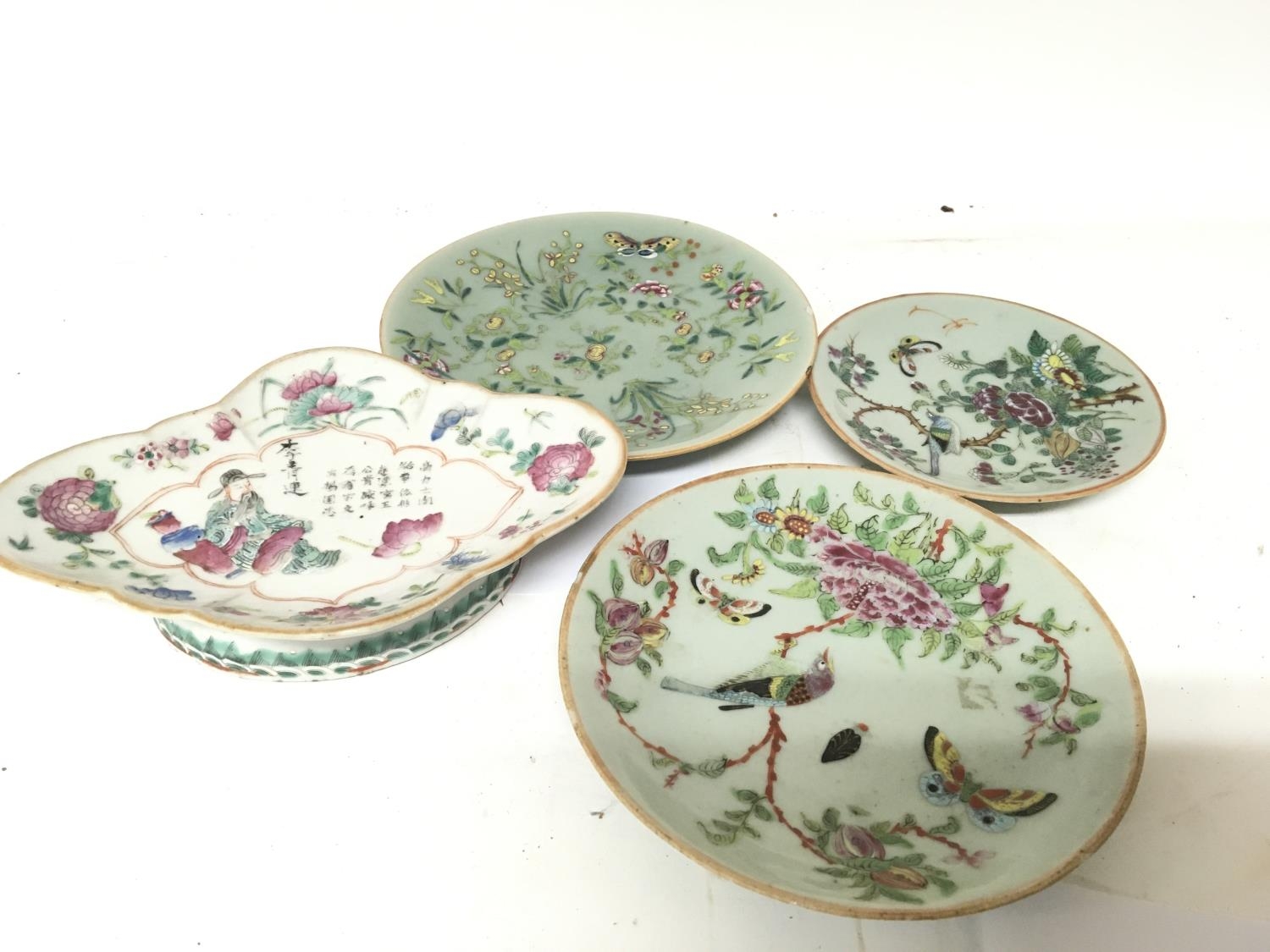 A 19th century Chinese export porcelain dish with hand painted inscriptions and three celadon plates some chips to edges hairline cracks (4)