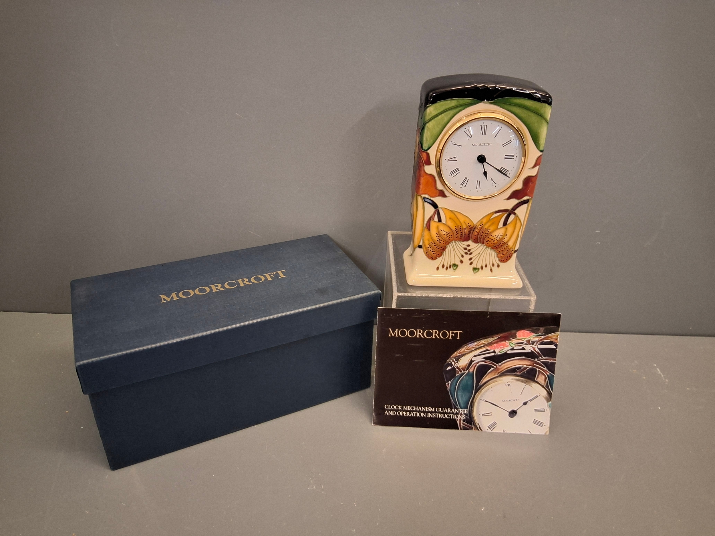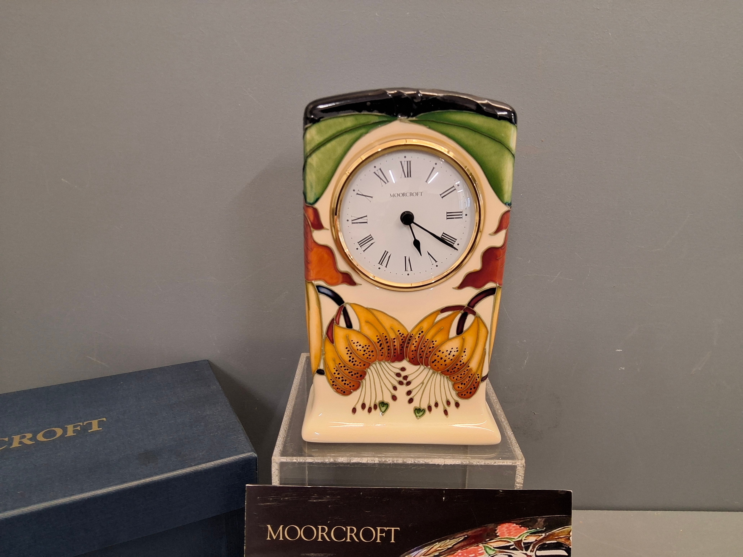 Moorcroft Anna Lily clock with box.Red mark to base. Not tested.