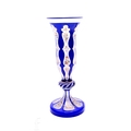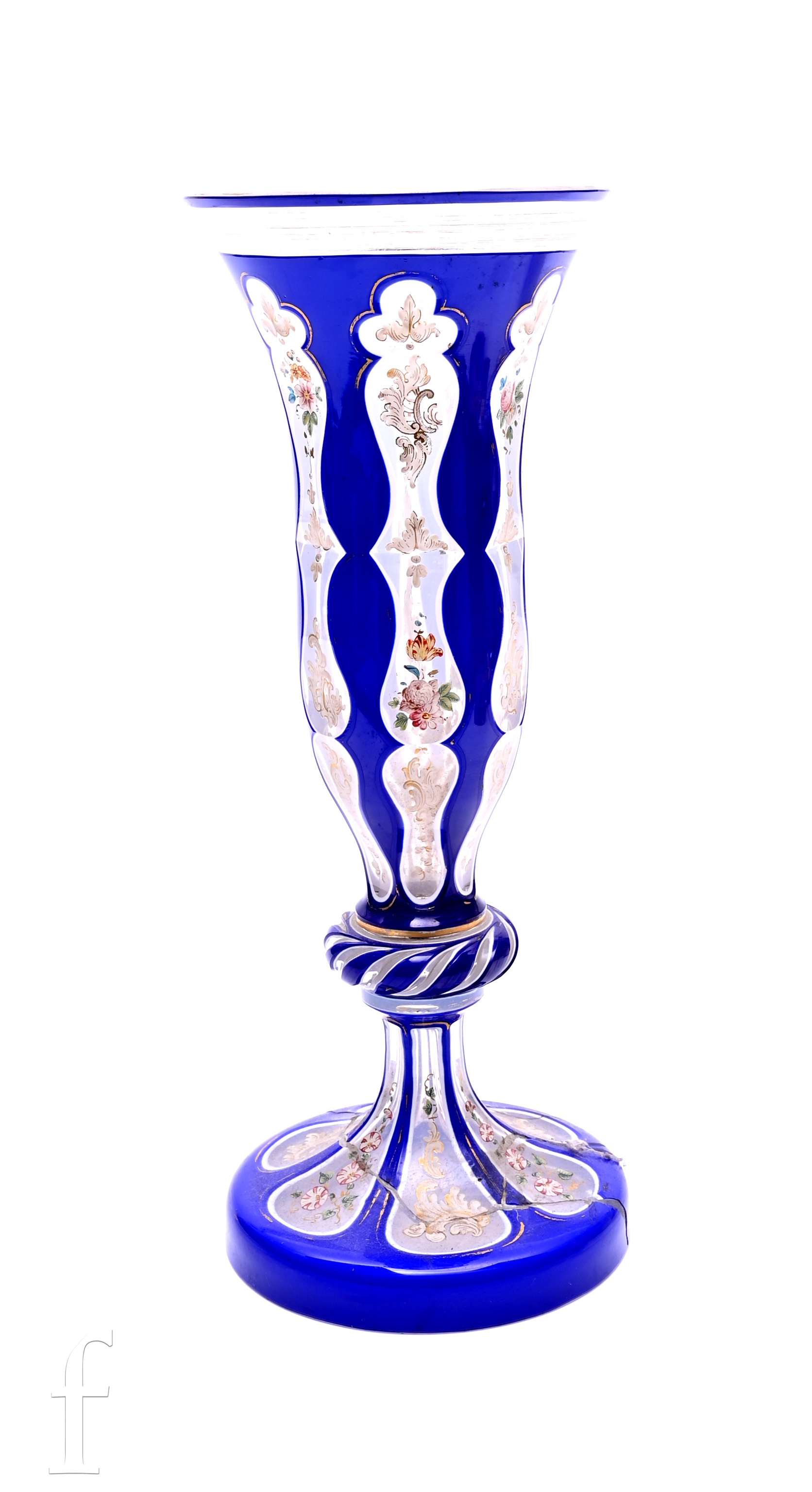 A late 19th Century Bohemian vase of trumpet form, raised to a knopped stem above a domed foot, cased in blue and white and flash cut, the clean panels decorated with flowers and foliate scrolls, height 30cm, damaged.