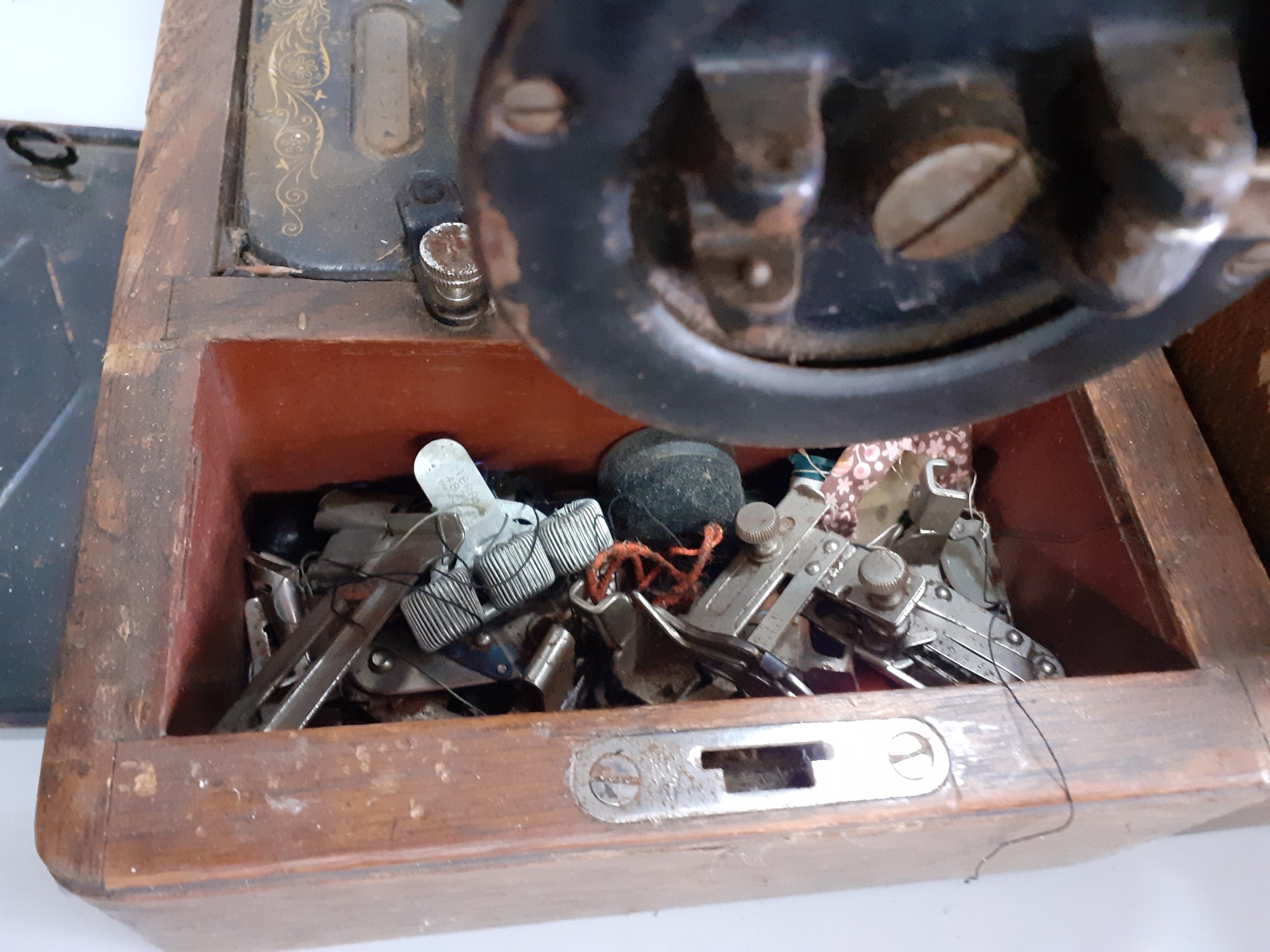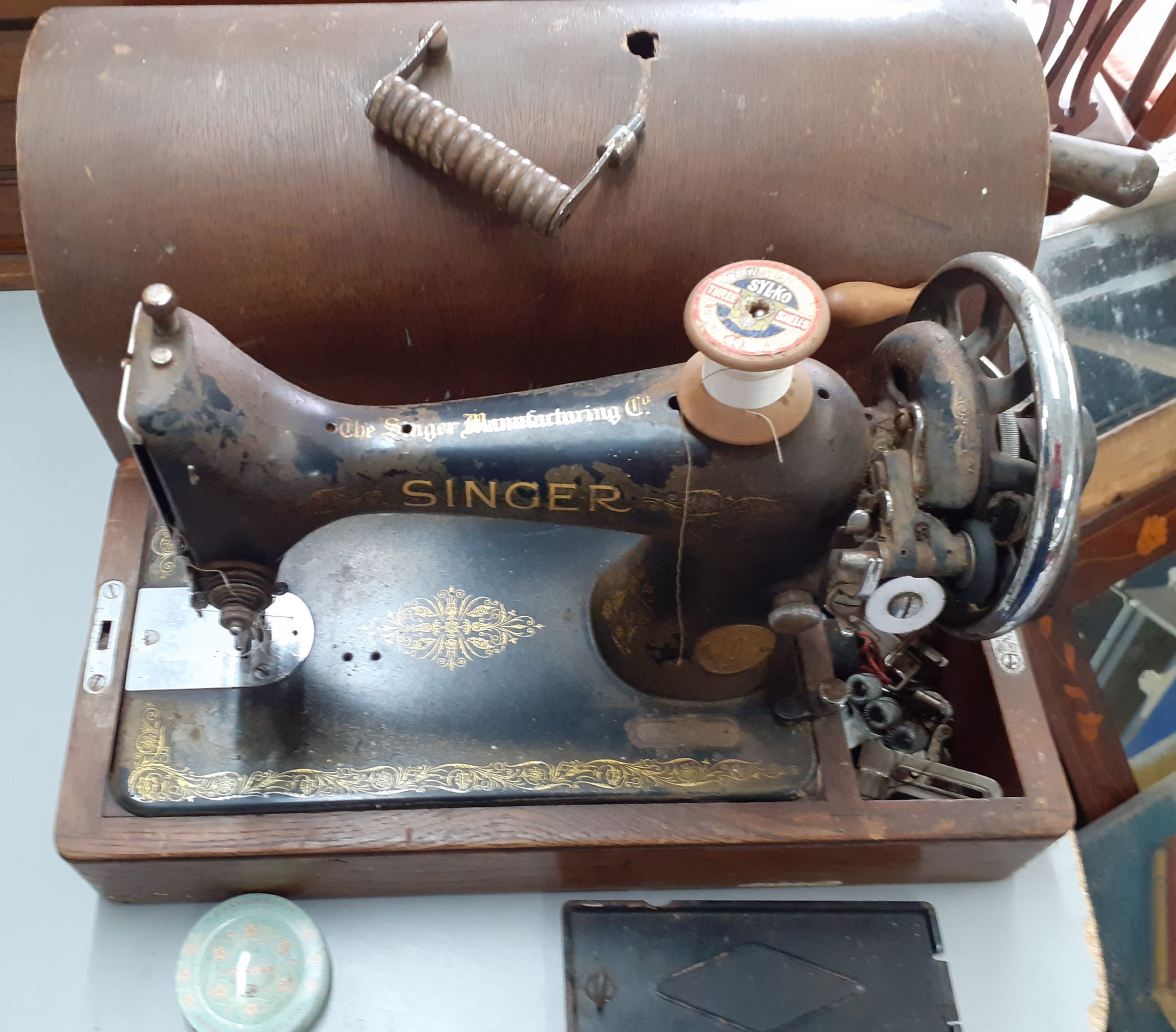 Three ostrich eggs A/F, together with an oak dome cased singer sewing machine, serial no Y8917673 and accessories.