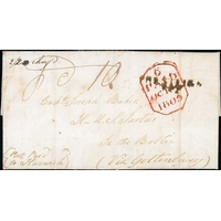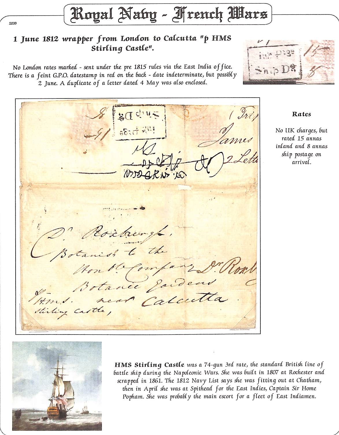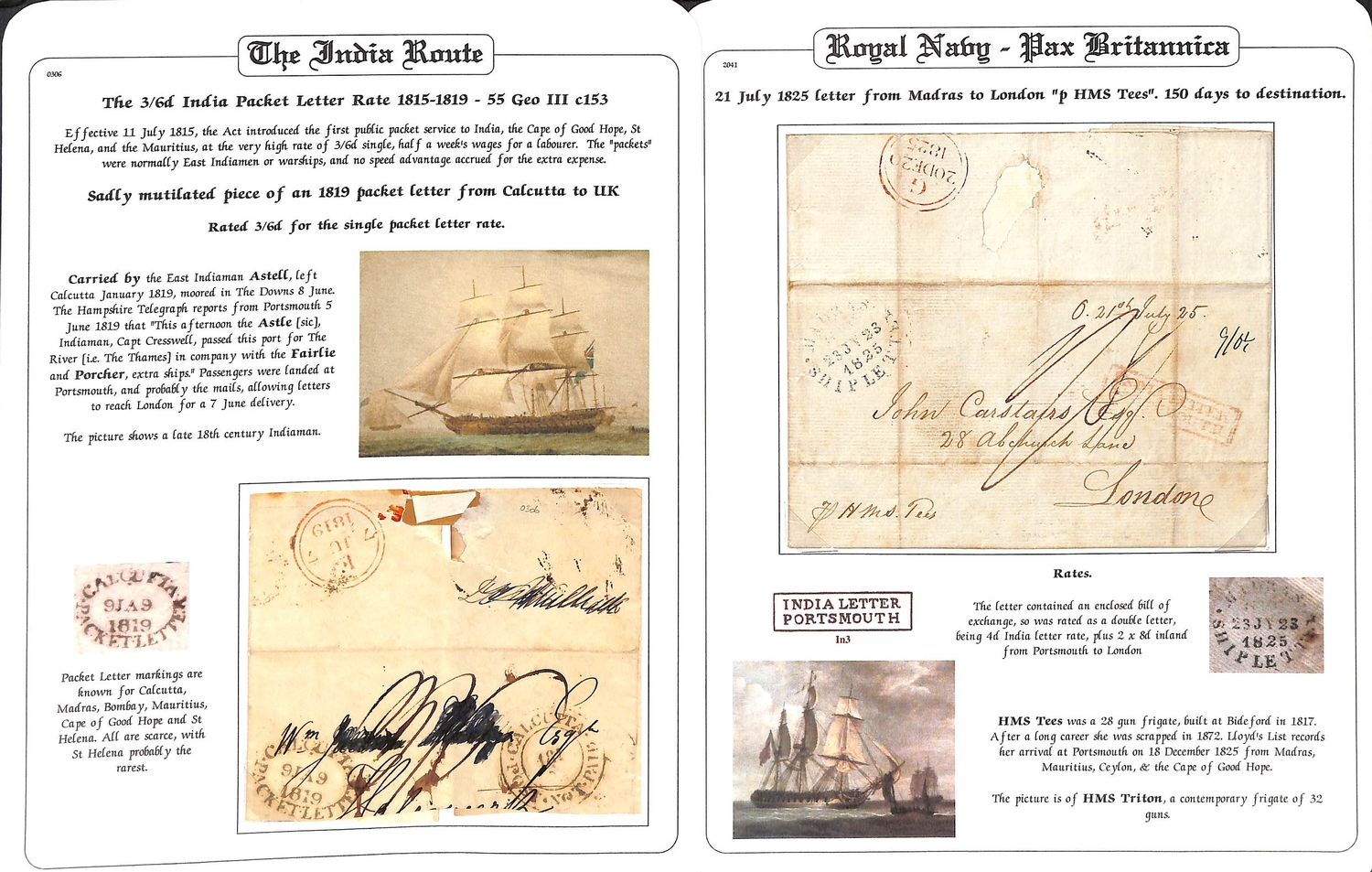 India. 1812 (June 1) Entire from London to "Dr Roxburgh, Botanist to Hon. Company, Botanic Gardens near Calcutta, p. H.M.S Stirling Castle", sent free of British postage, backstamped boxed "Inld Ptge (15) / Ship Do (8)"; and 1825 (July 21) entire letter from Madras to London "p. H.M.S Tees" with oval "MADRAS / SHIP LETTER" datestamp and red boxed India Letter Portsmouth, file folds. (2).