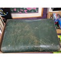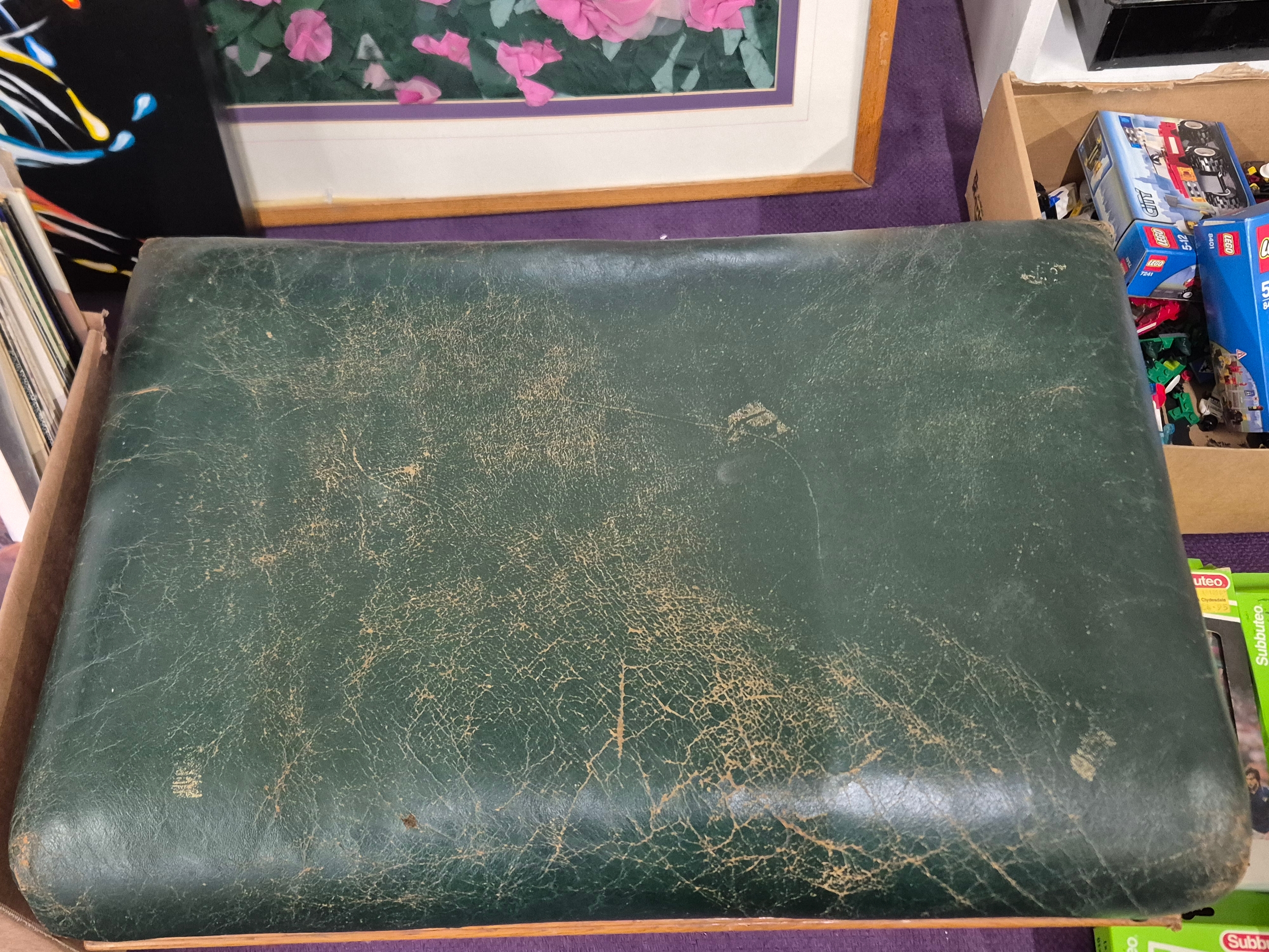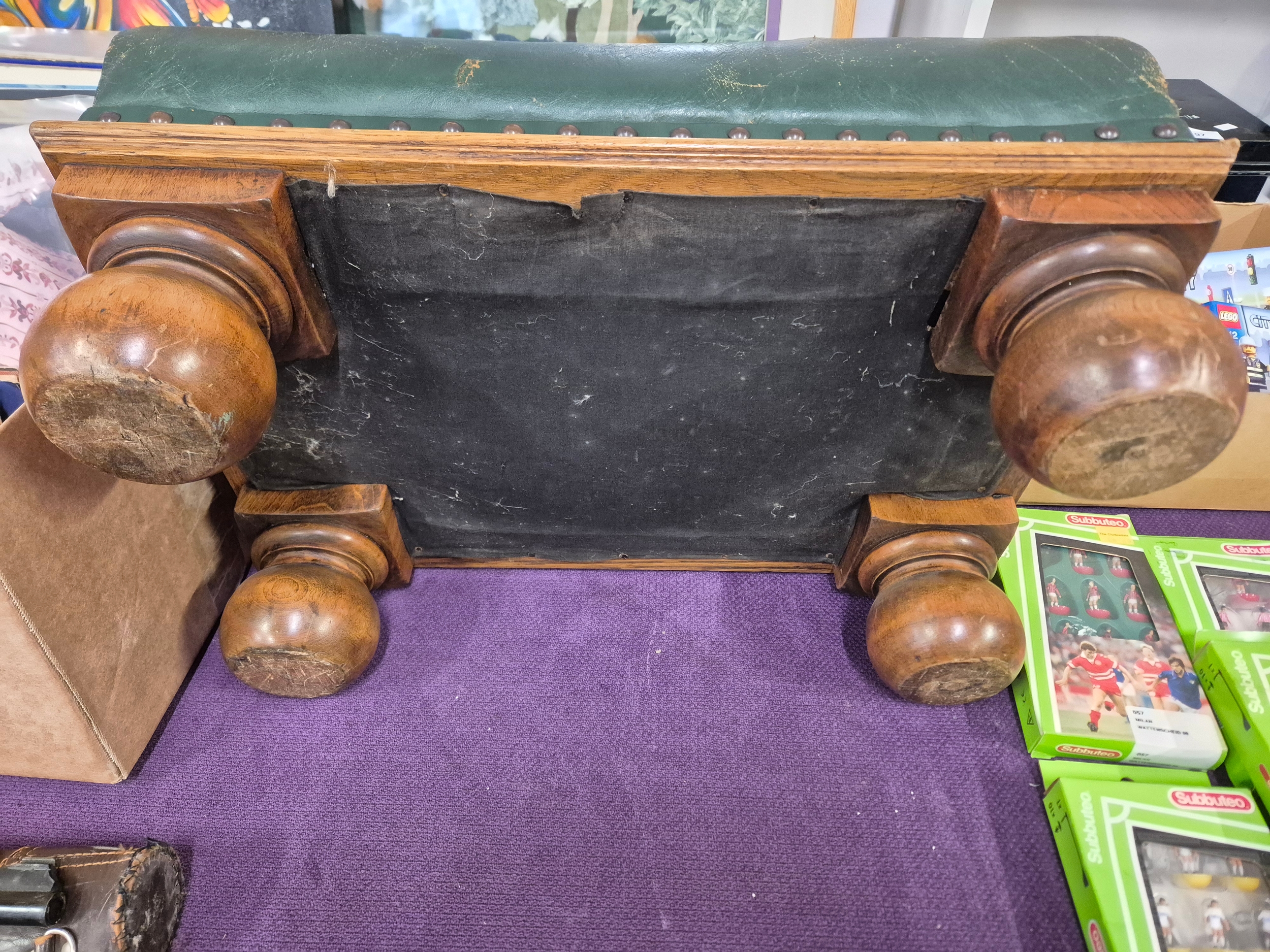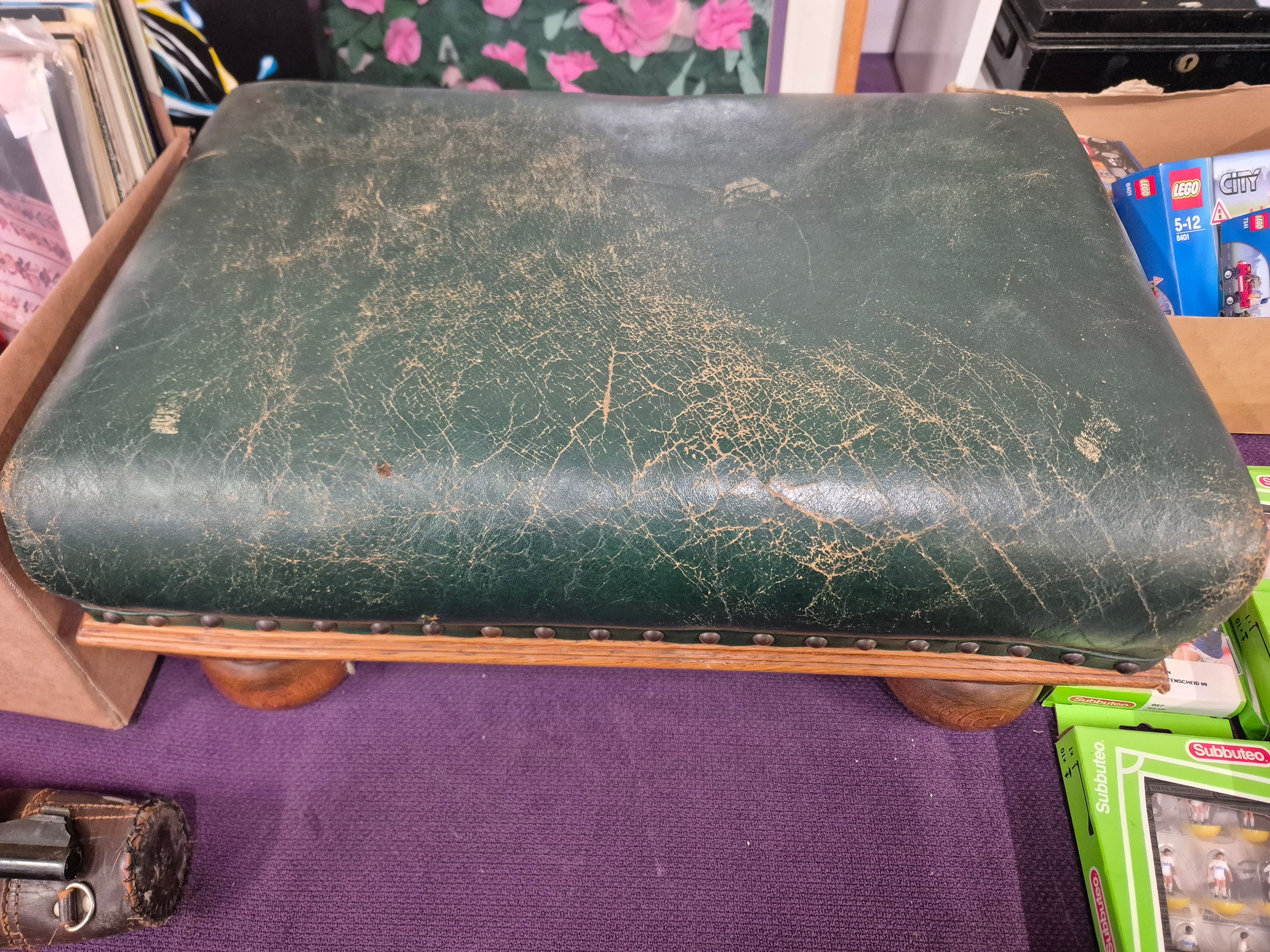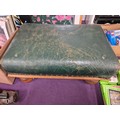Large footstool with green distressed leather top and solid oak bun feet