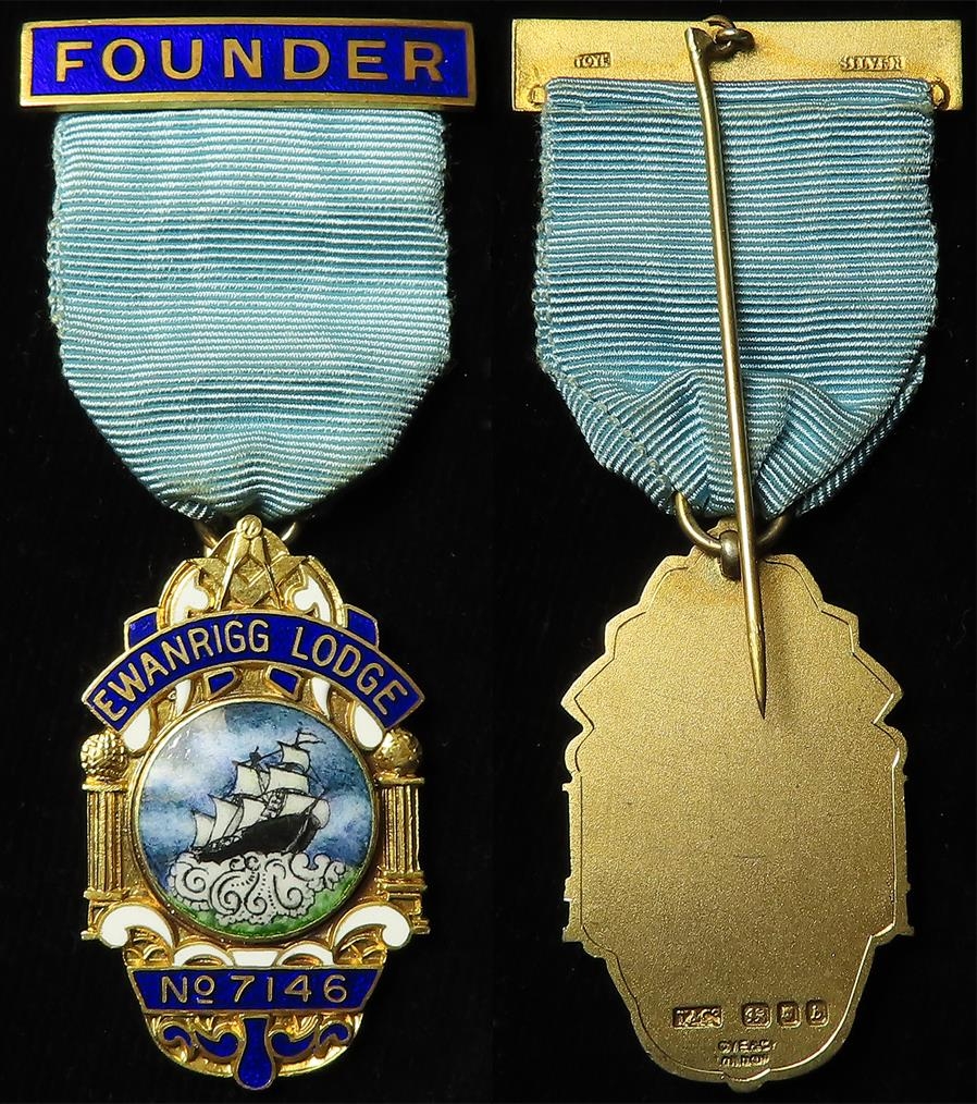 Masonic silver gilt Founder's Medal, Ewanrigg Lodge No. 7146, hallmarked T & Co., London, 1957. Weighs 26.7gms. Including ribbon
