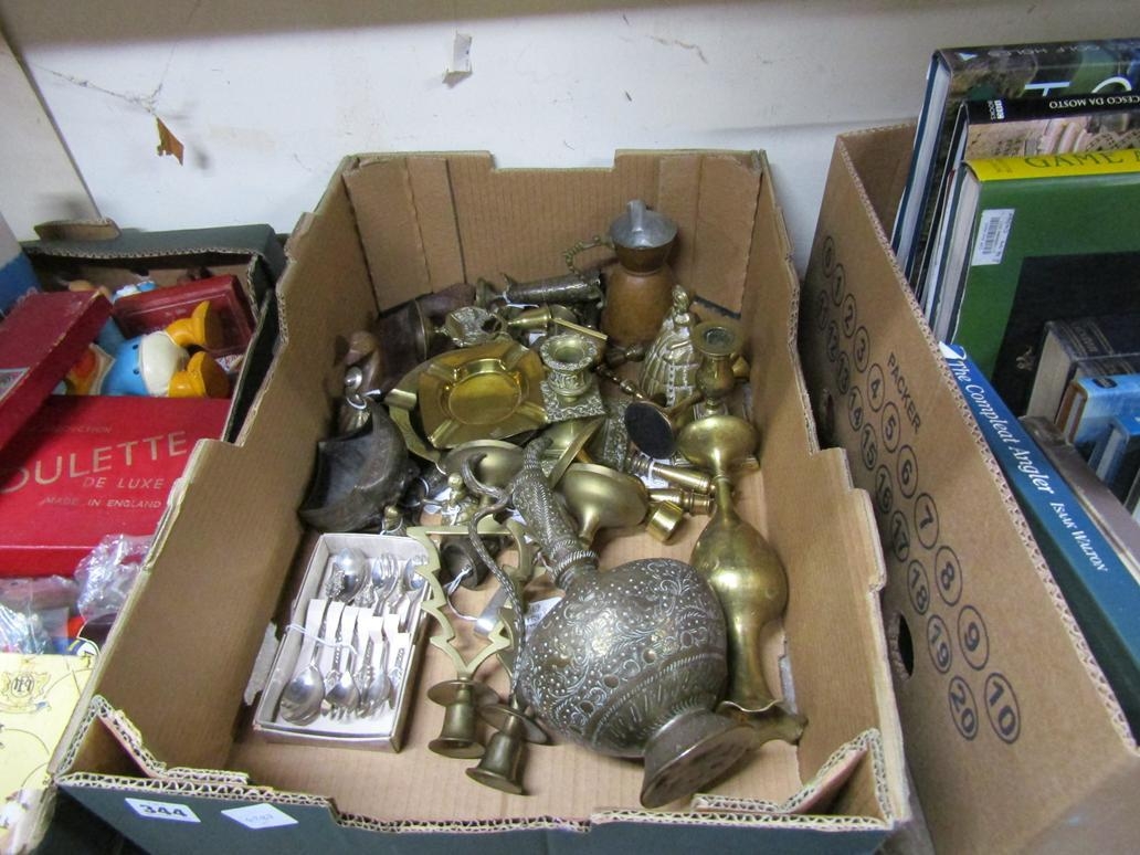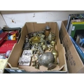 BOX OF BRASSWARE, SILVER PLATE