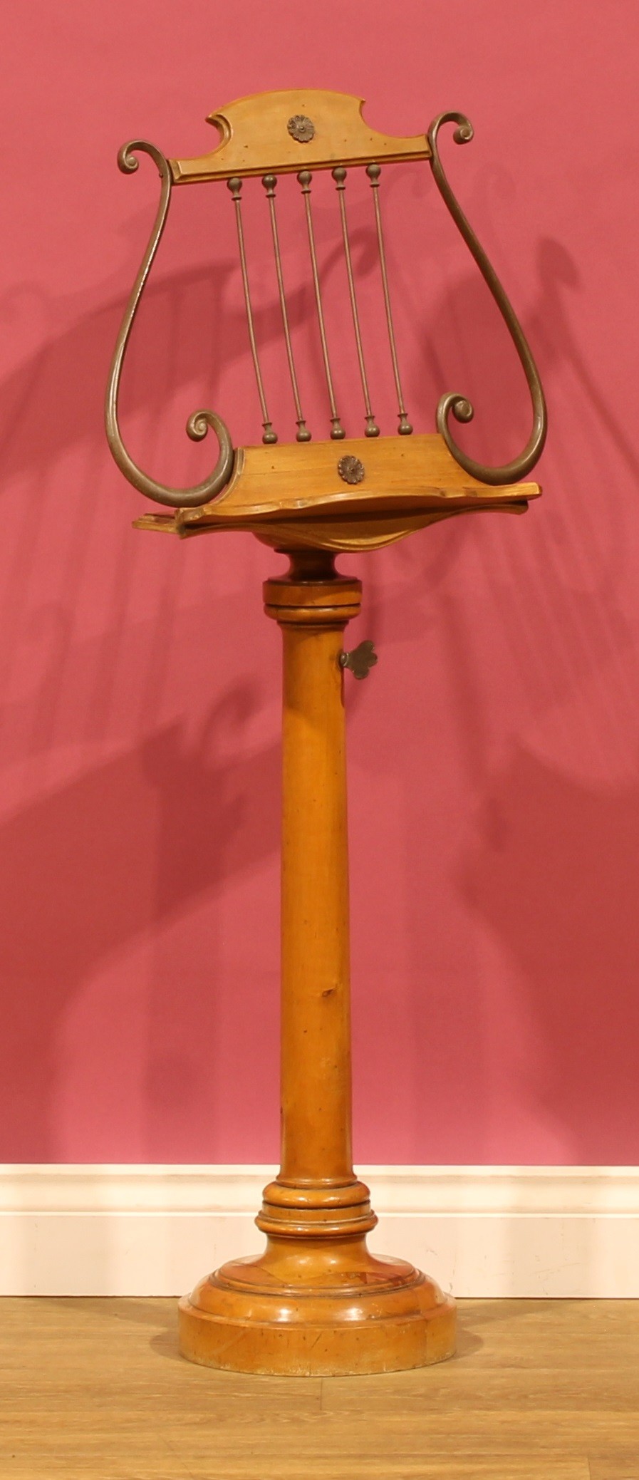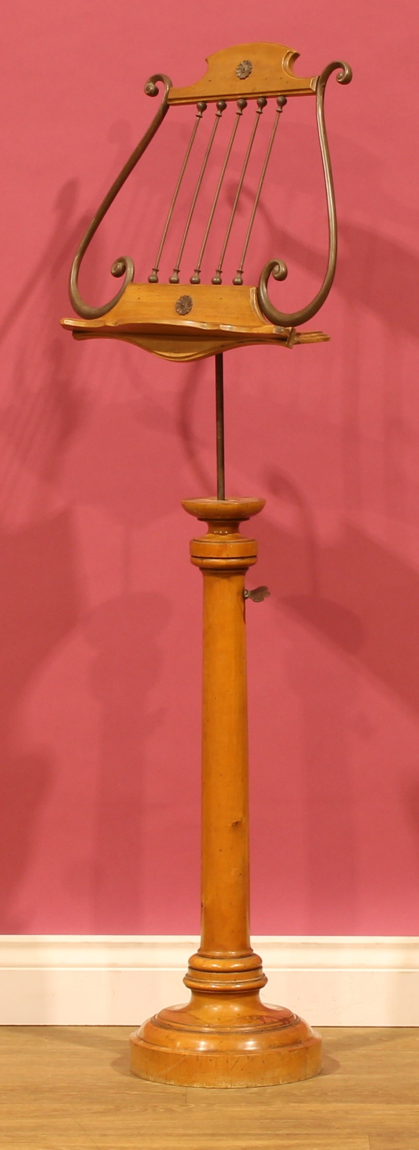 A Biedermeier Revival birch telescopic music stand, lyre-shaped rest, 111.5cm raising to 136cm high, 45cm wide