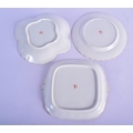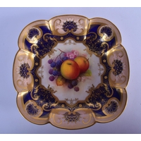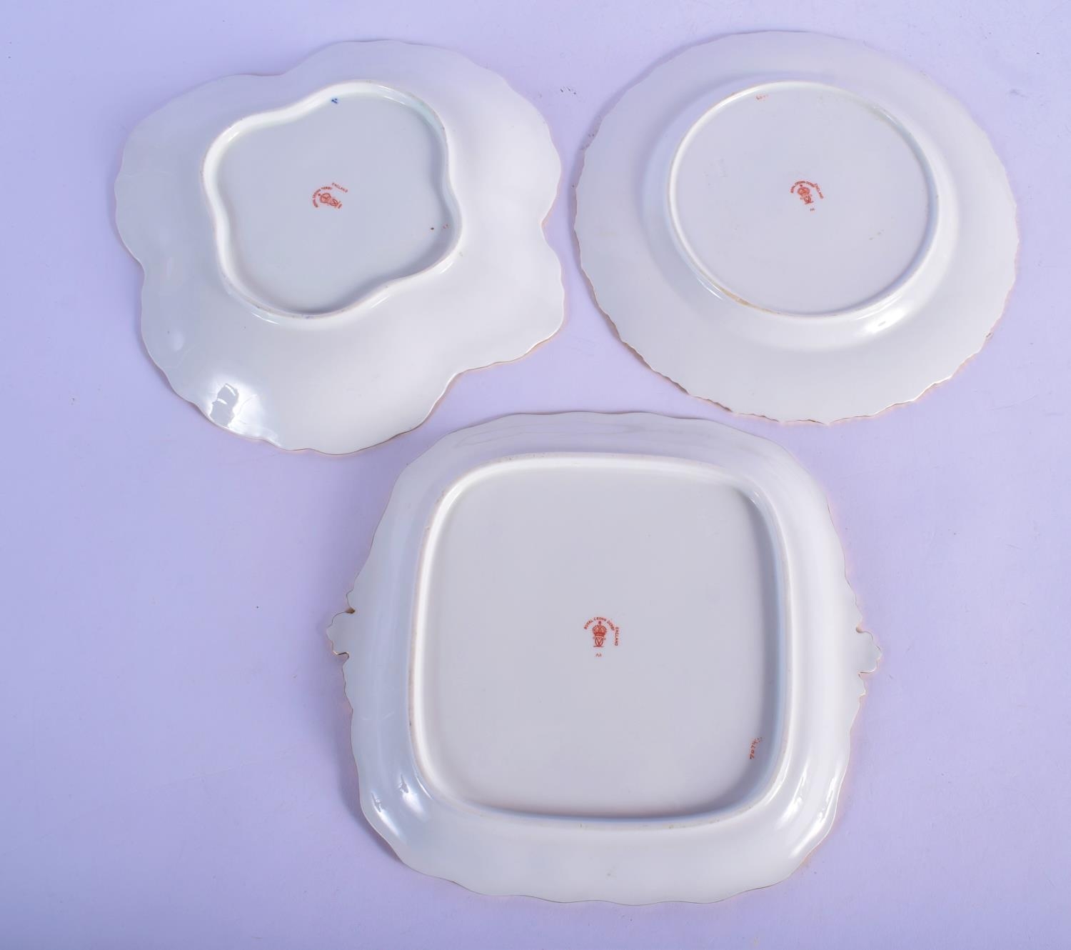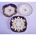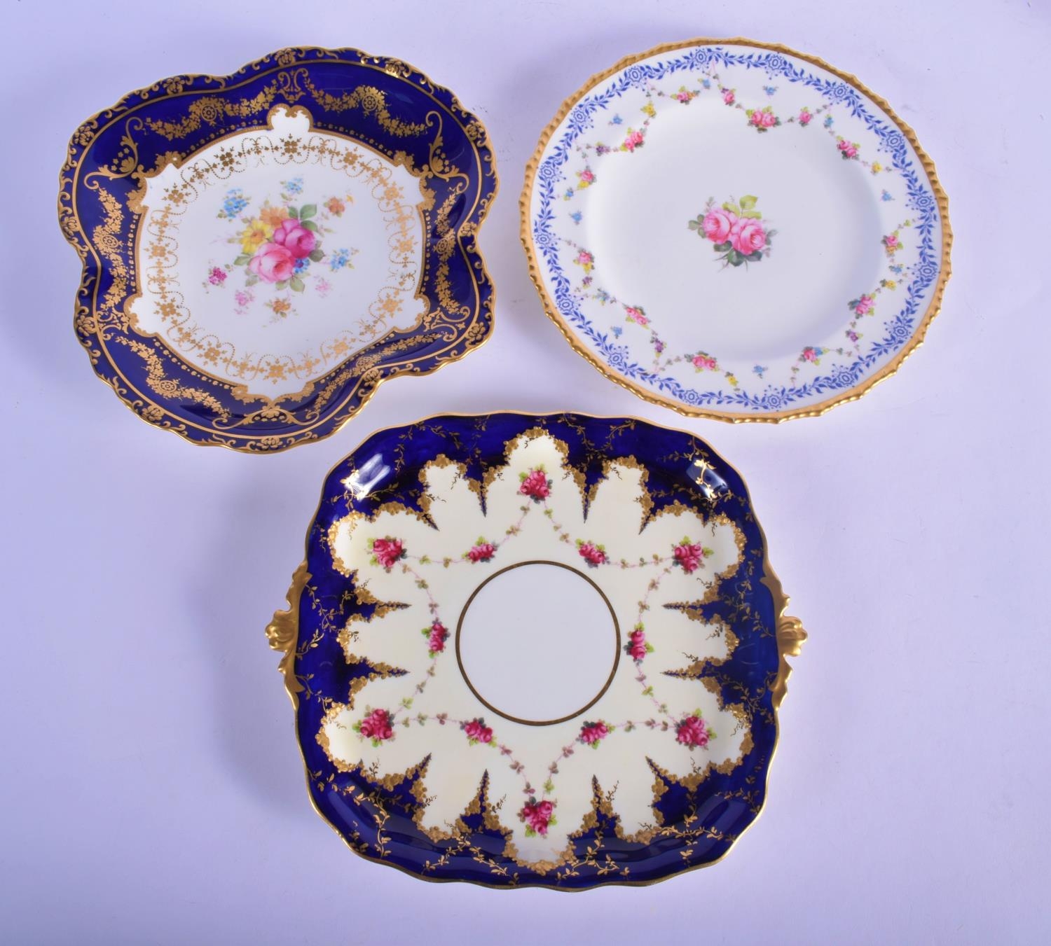 Royal Crown Derby blue ground dish painted with flowers date code 1901, a Royal Crown Derby loded handled square shaped dish with rose garlands, raised tooled gilding and a blue border date code for 1907, and a RCD gadroon bordered plate painted with two roses, rose garlands and a blue leafy border date code for 1907. 23cm Diameter