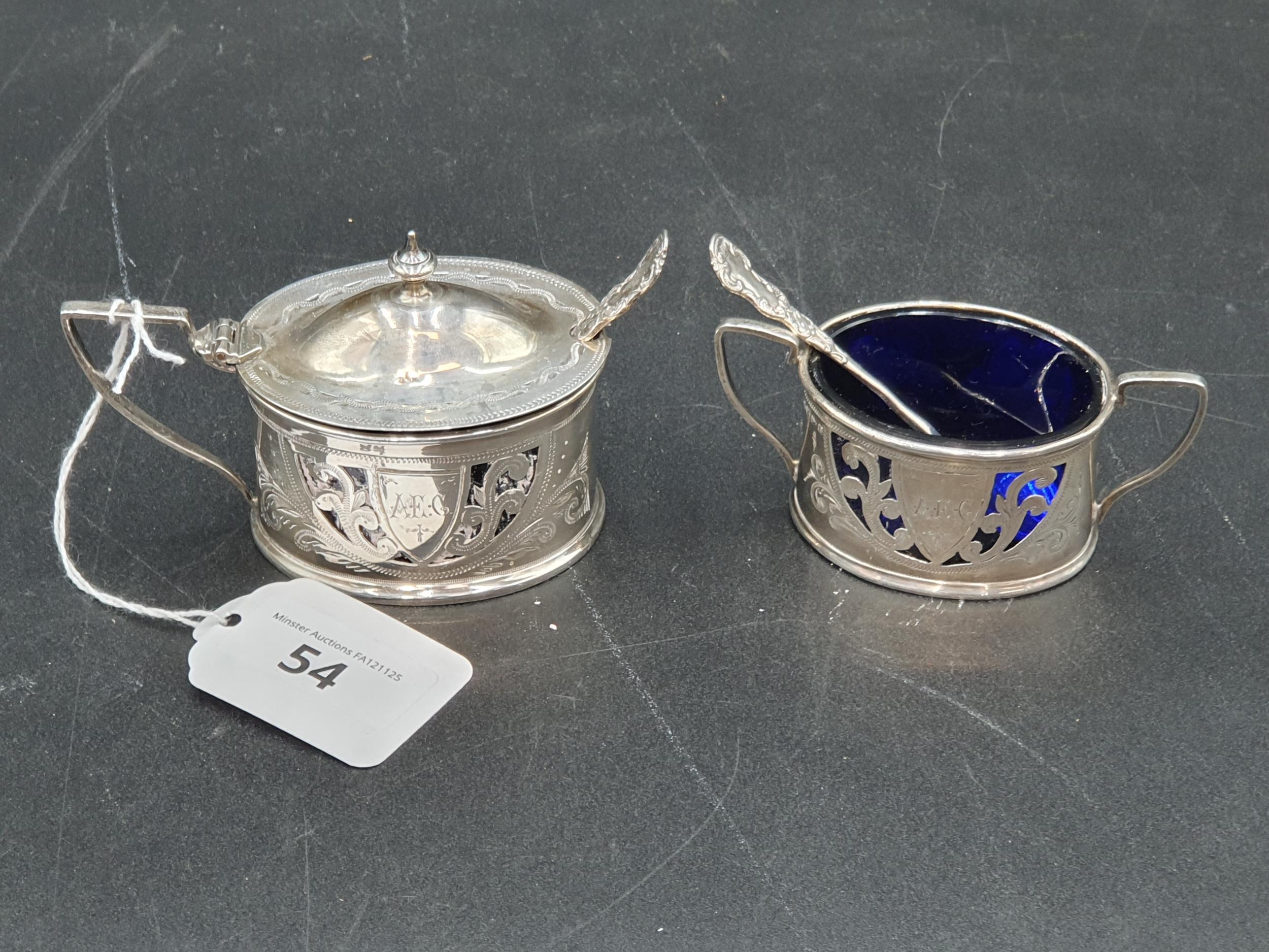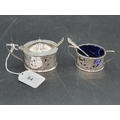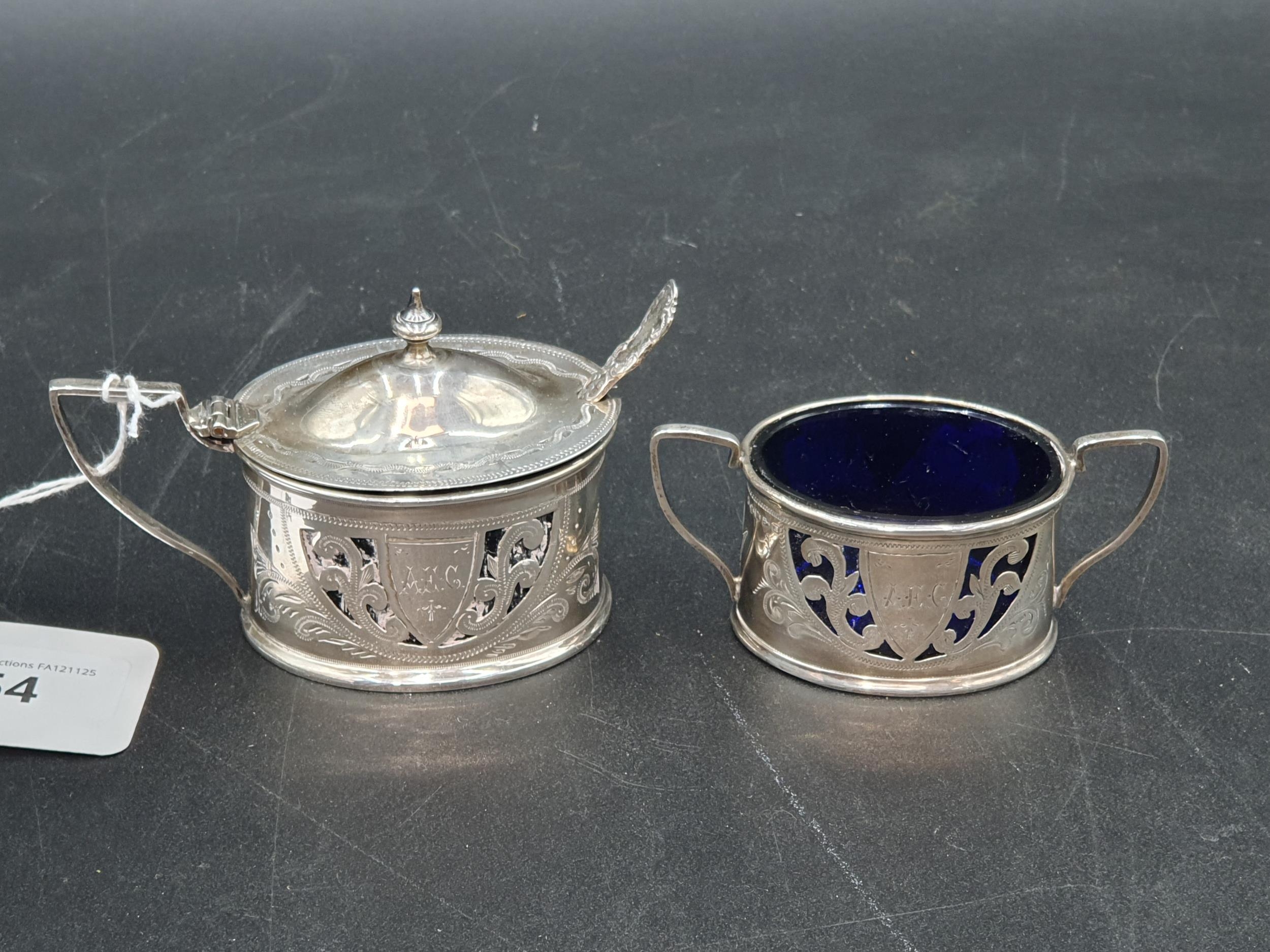 A Victorian silver pierced oval Mustard Pot and Salt with bright cut engraving, blue glass liners, Birmingham 1900, and two Spoons, Chester 1901, 94gms