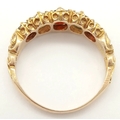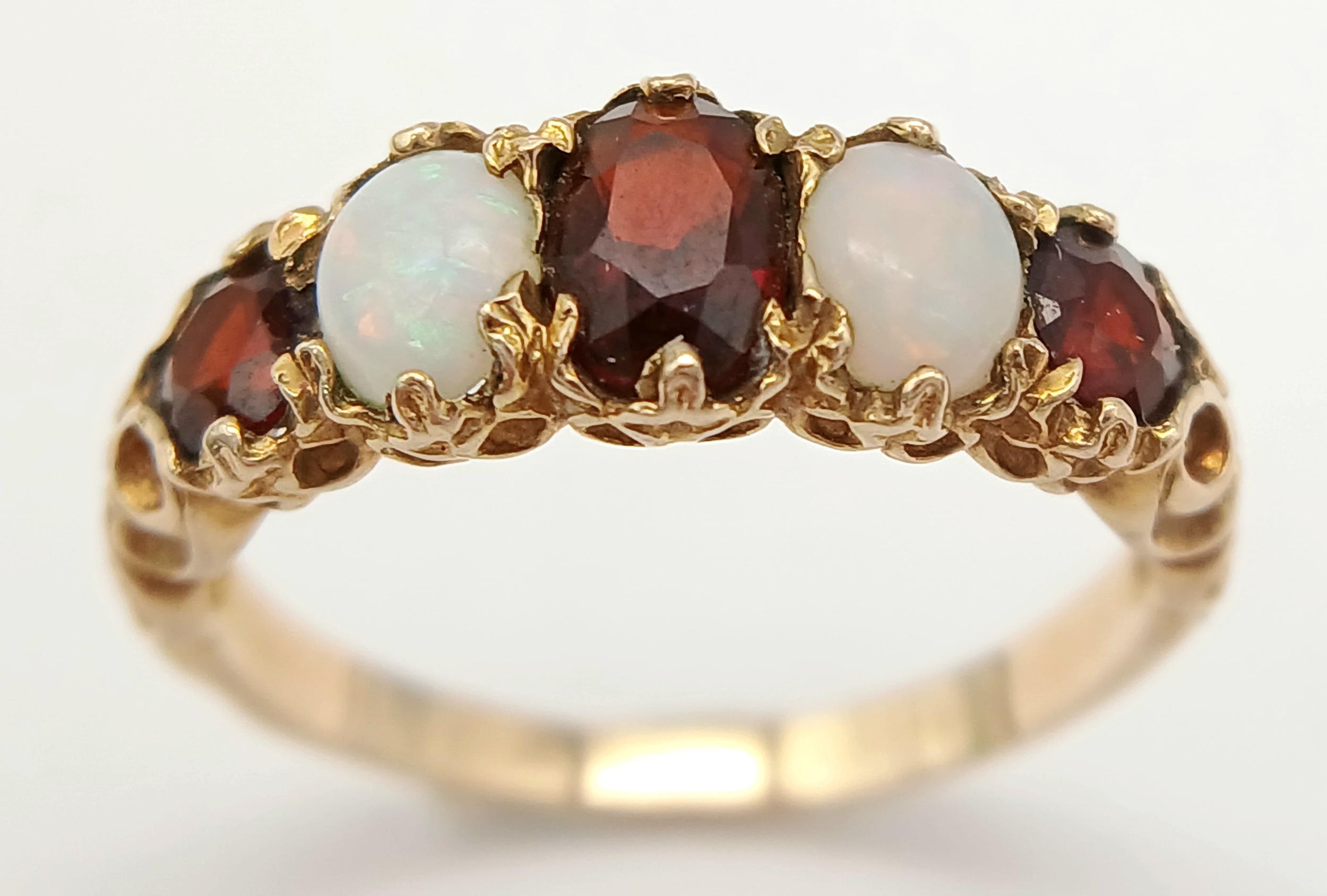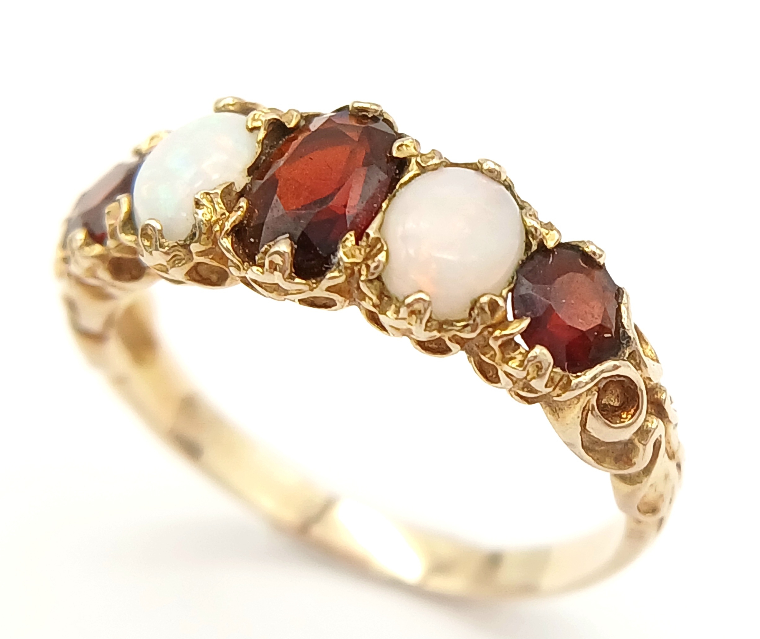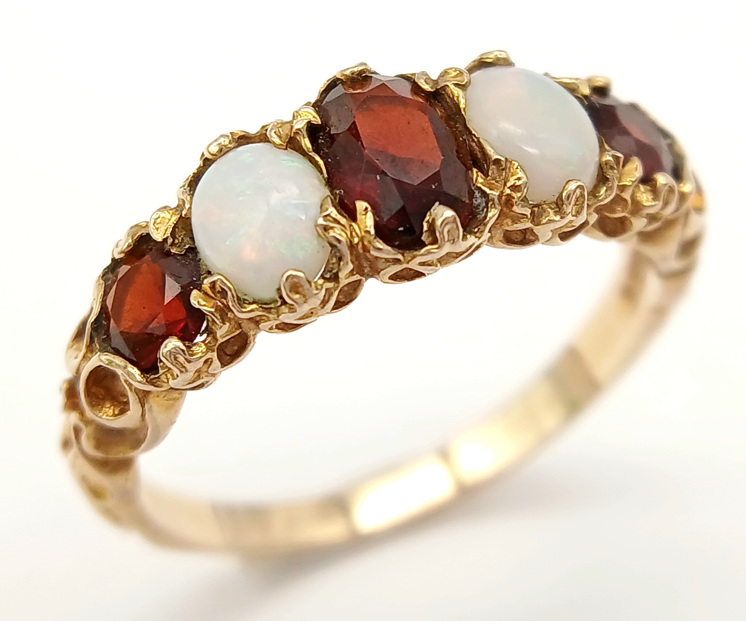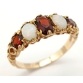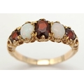 Beautiful vintage 9 CARAT GOLD, OPAL and GARNET RING. Having 2 x FIRE OPALS set to top with 3 x Round and Oval Cut GARNETS. 2.5 grams. Size N 1/2. Stunning Ring , please see pictures.