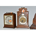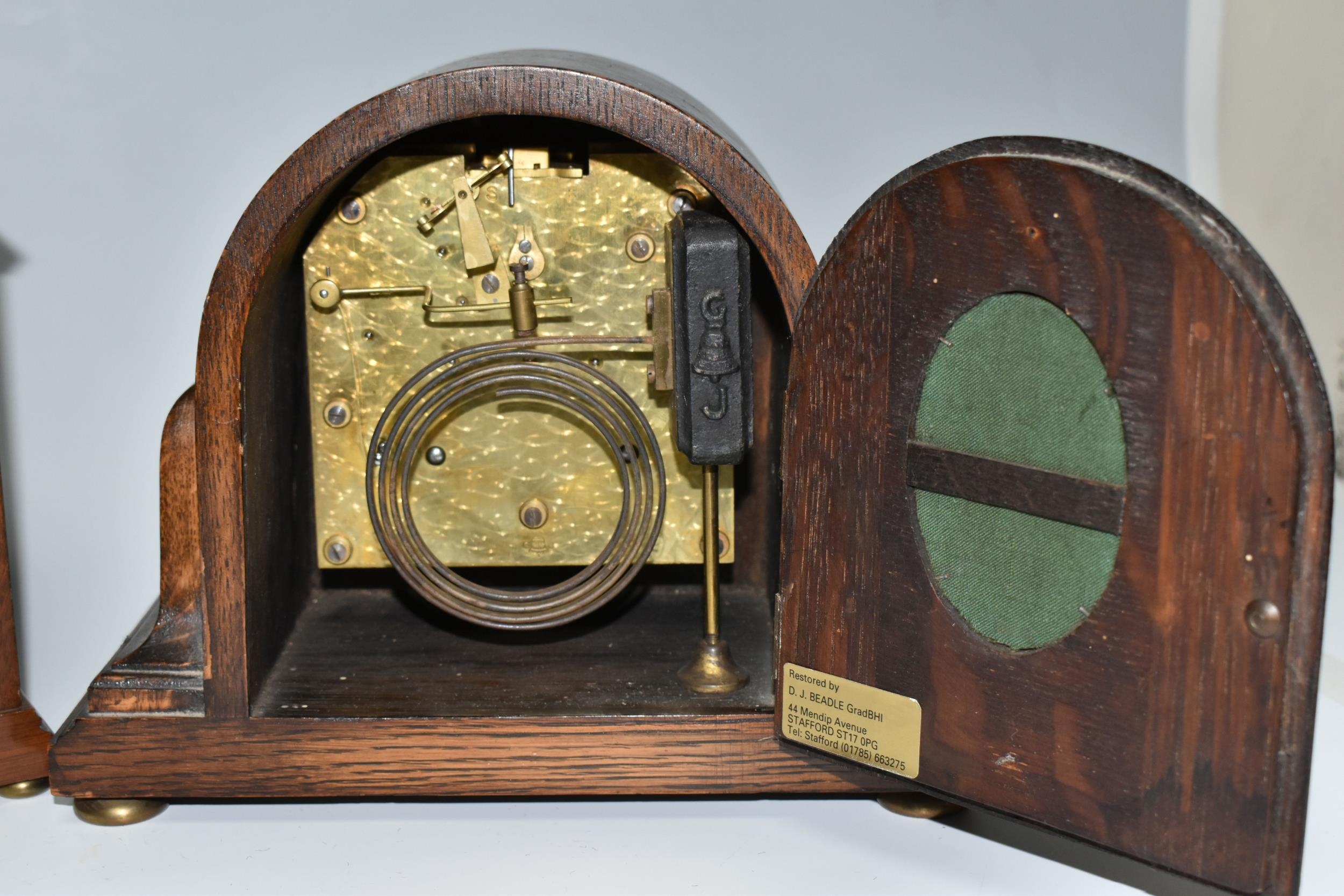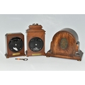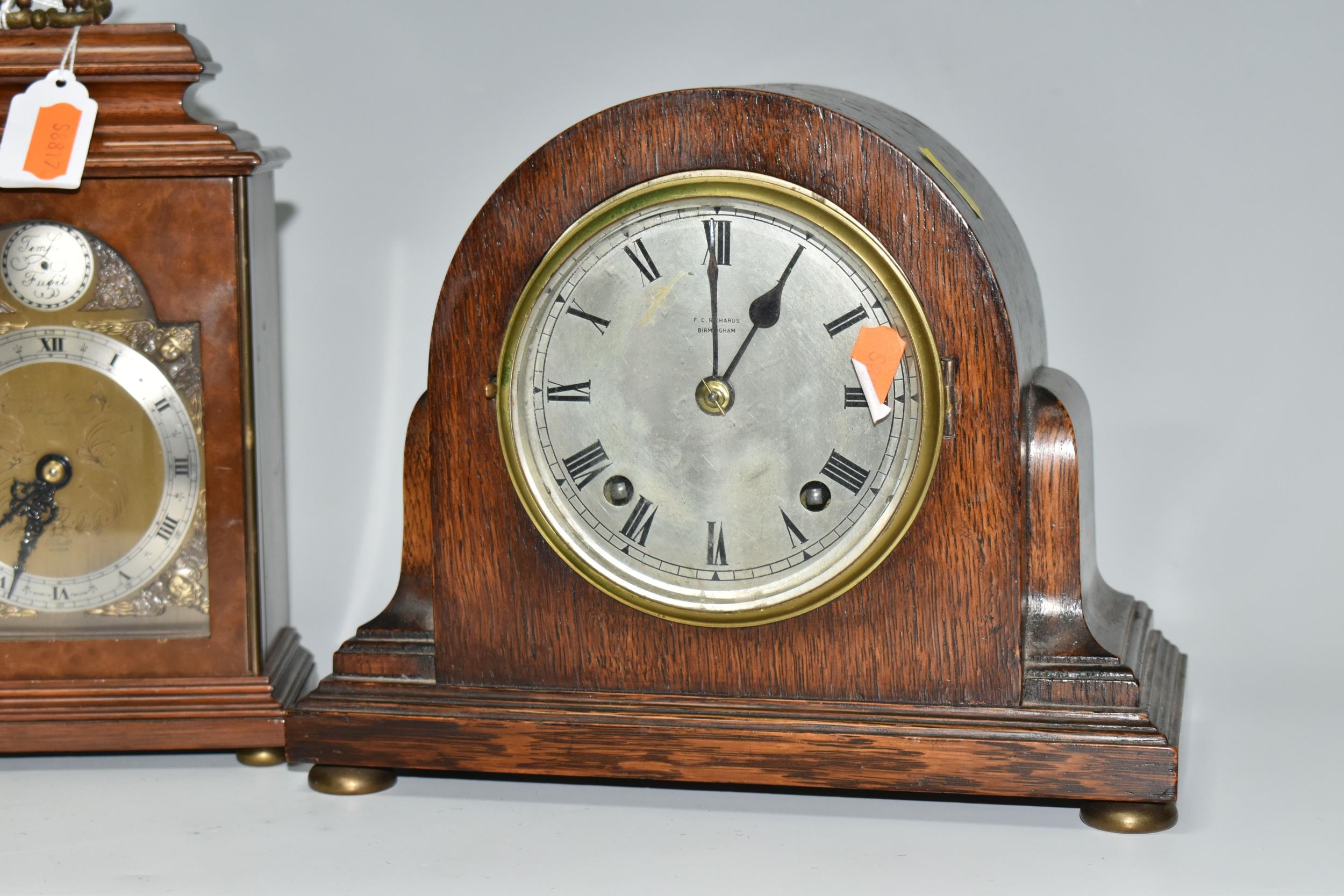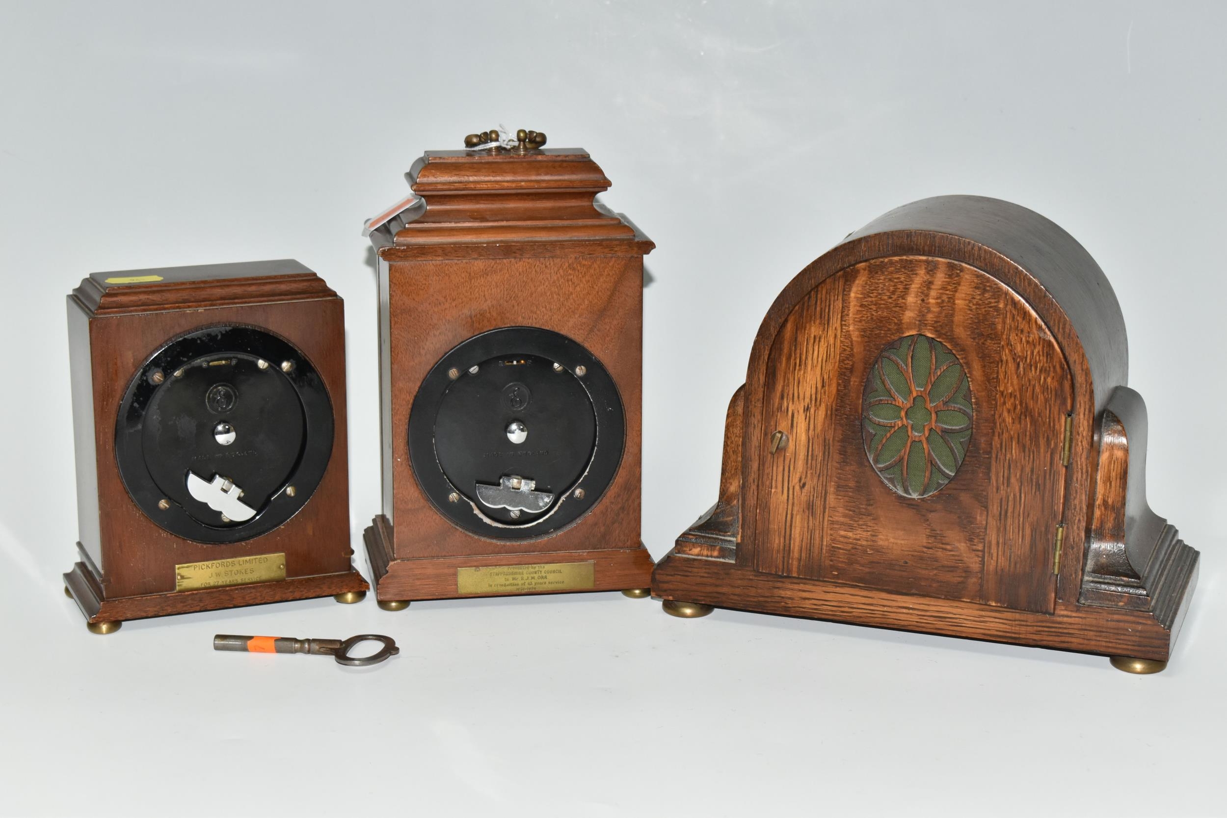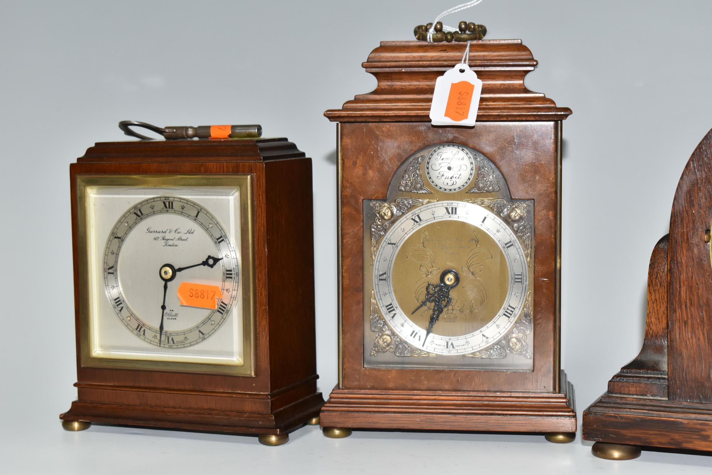 THREE WOODEN CASED MANTEL CLOCKS, comprising an Art Deco style Elliot clock retailed by Garrard & Co, presentation plaque to the back, tradition style Elliot clock retailed By Garrard & Co, presentation plaque to the back, and an oak cased mantel clock marked F.C. Richards to the silvered dial, movement is possibly by George Jenkins, Condition Report: all run when wound, Richards clock chimes when wound