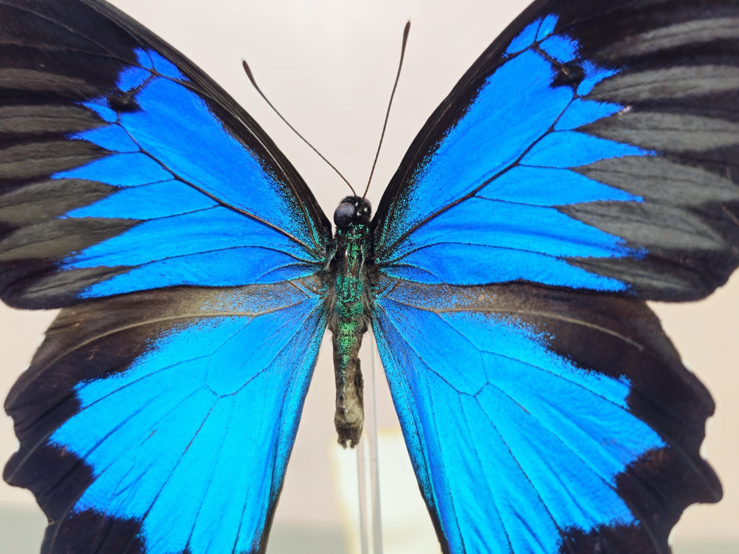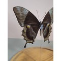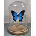A good quality butterfly specimen in a glass dome in the form of a Ulysses butterfly in striking blue colours with black edging, this is a genuine specimen the dome has an old repair to the side the specimen measures 10cm high the dome measures 22cm high