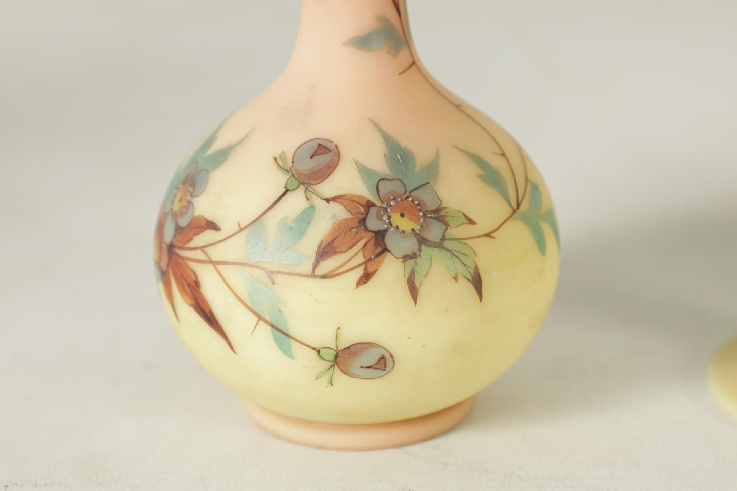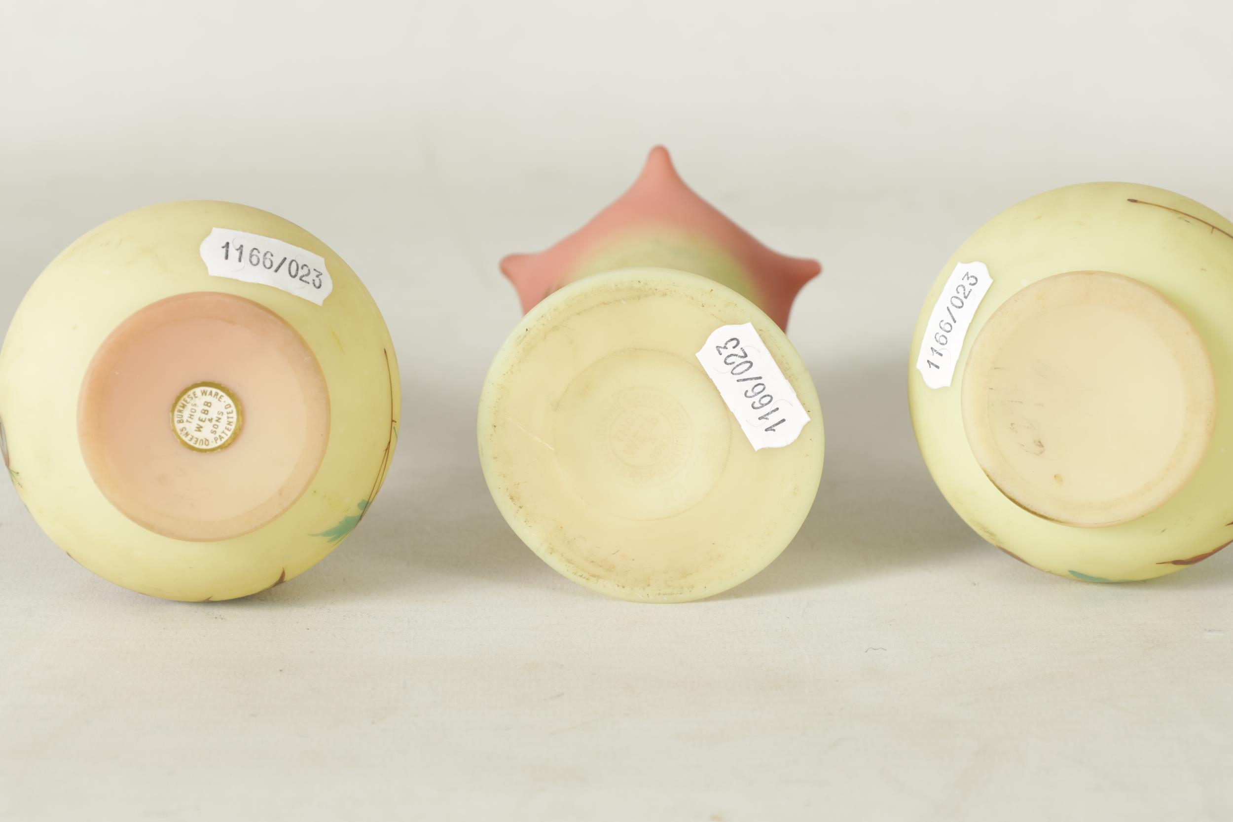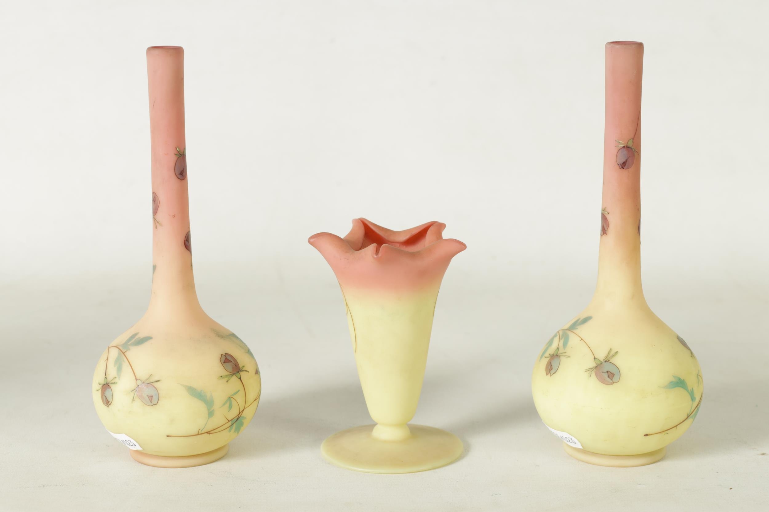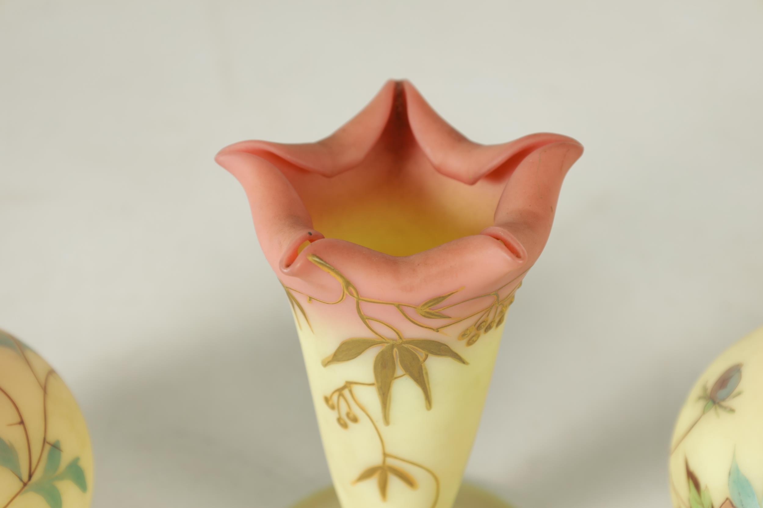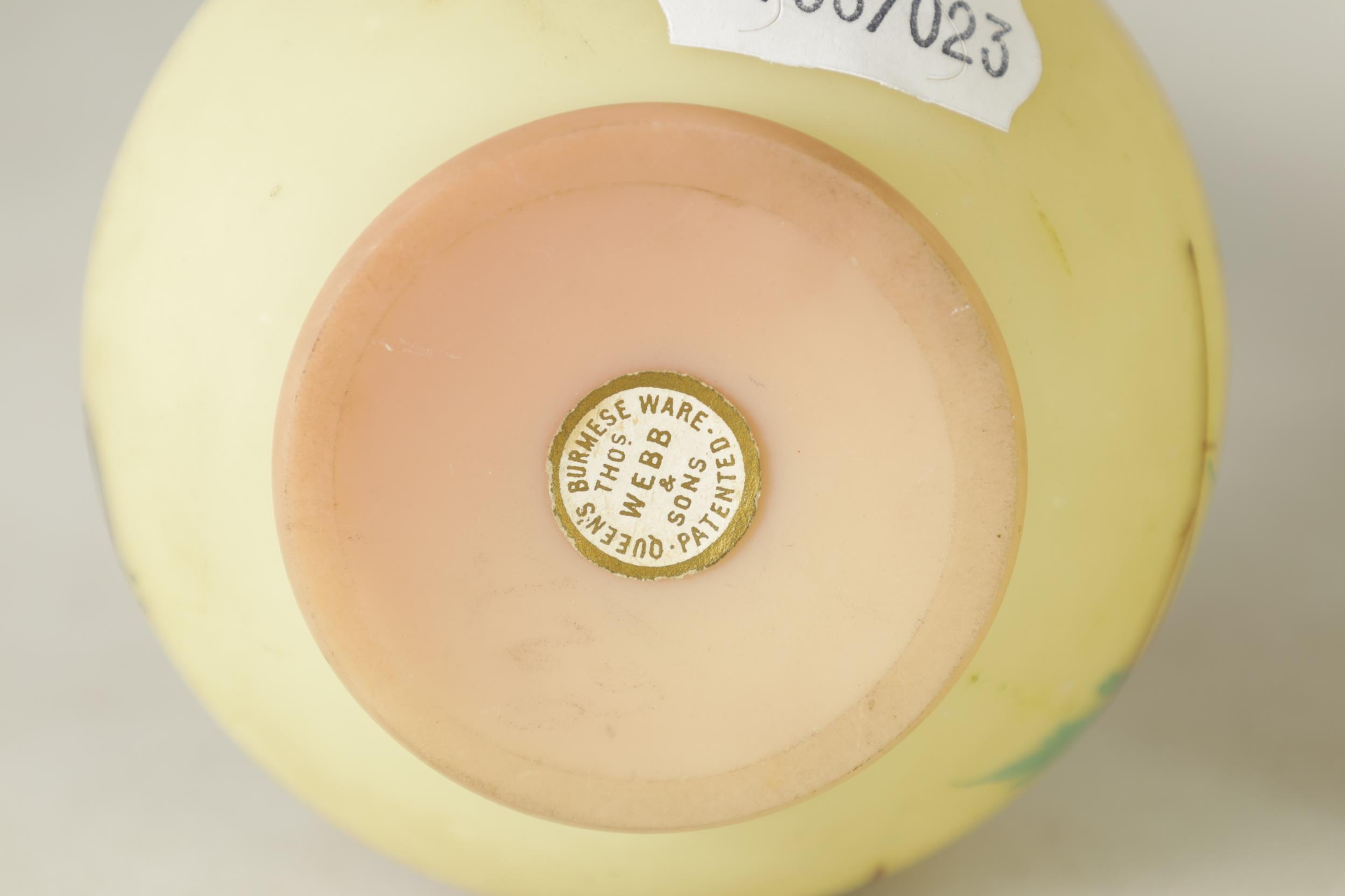 A COLLECTION OF 20TH CENTURY THOMAS WEBB BURMESE OPAQUE GLASS VASES with painted and gilt floral overlays - stamped and paper labels beneath (19cm and 10cm high )