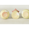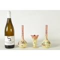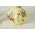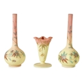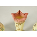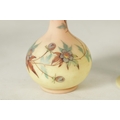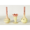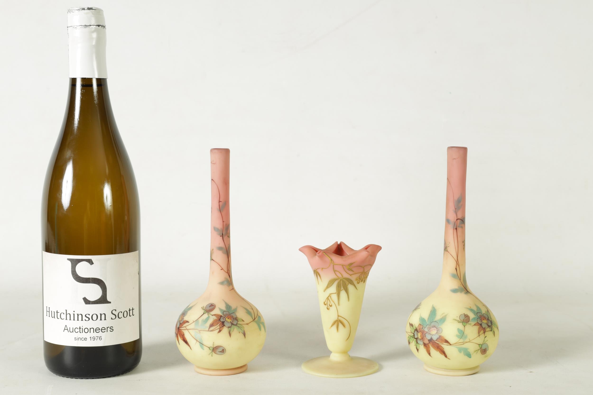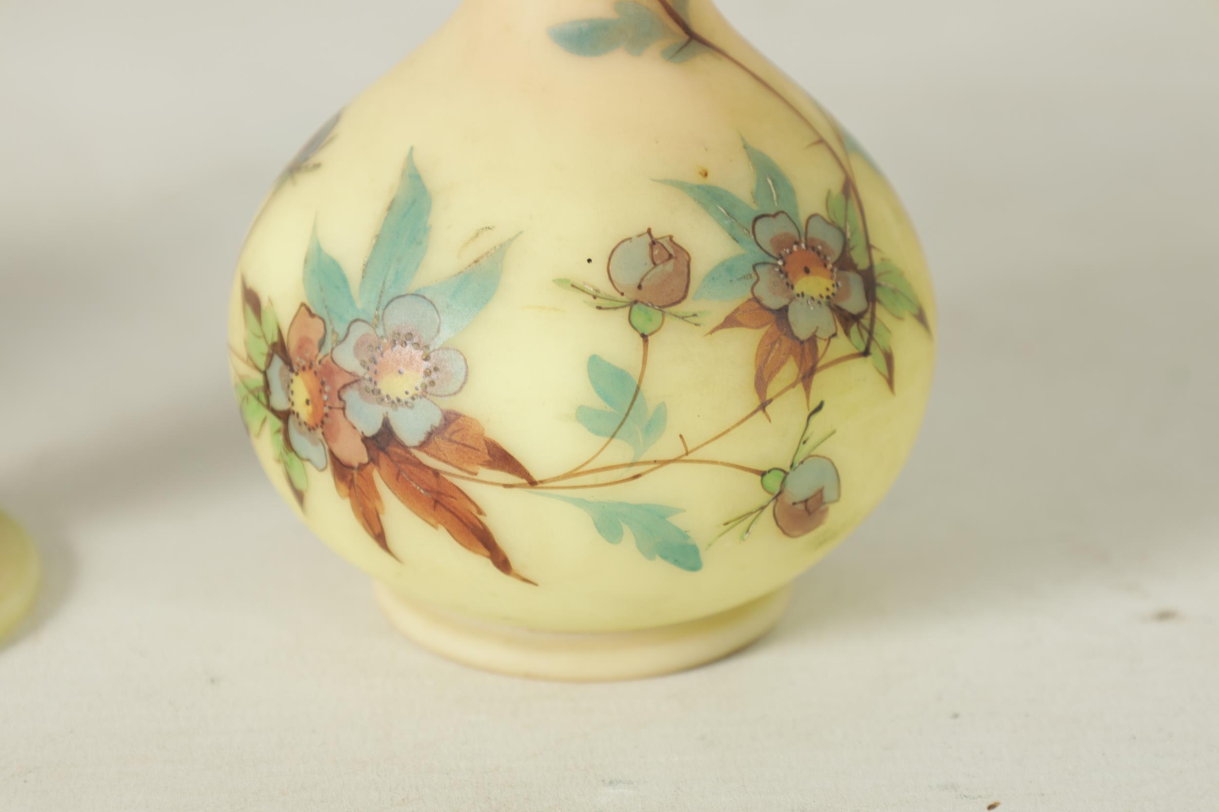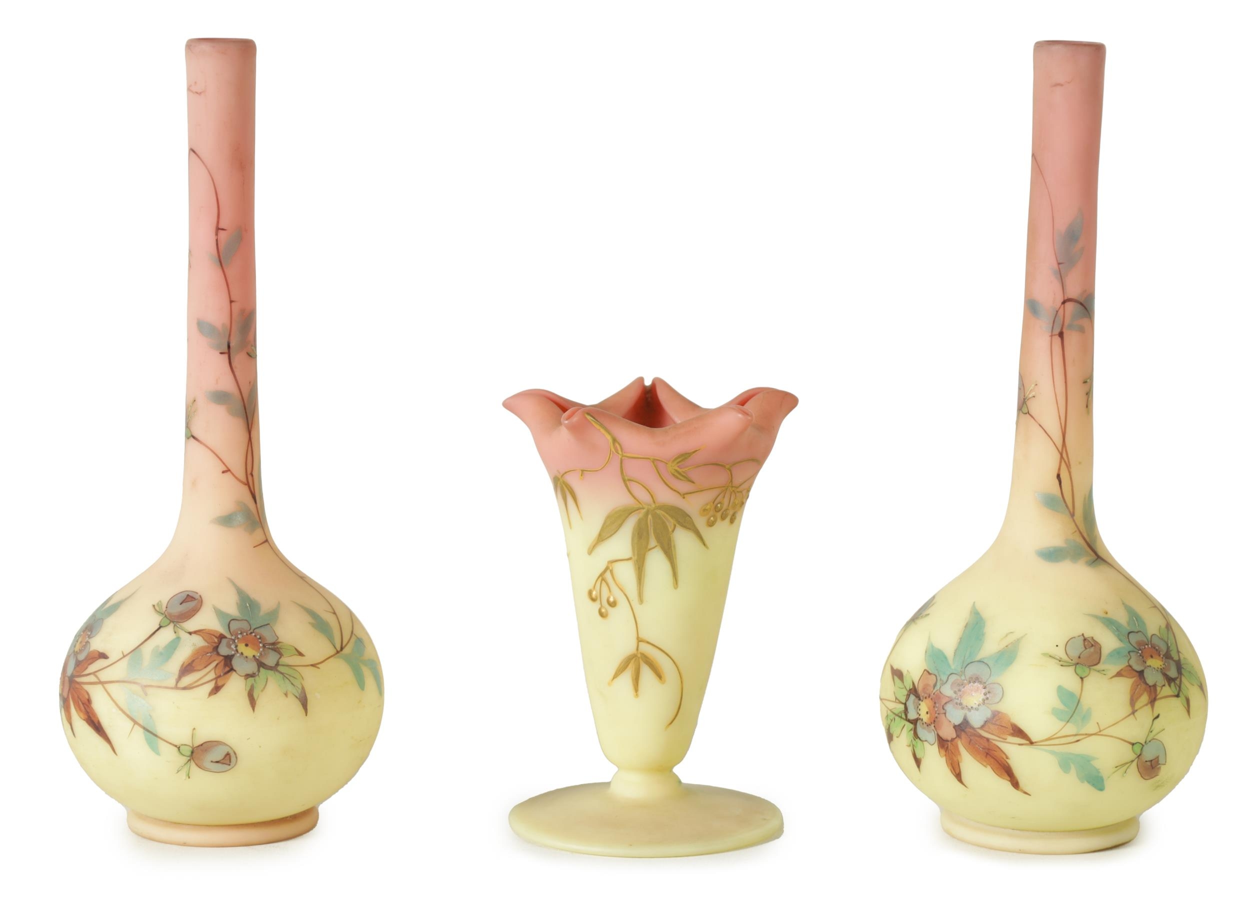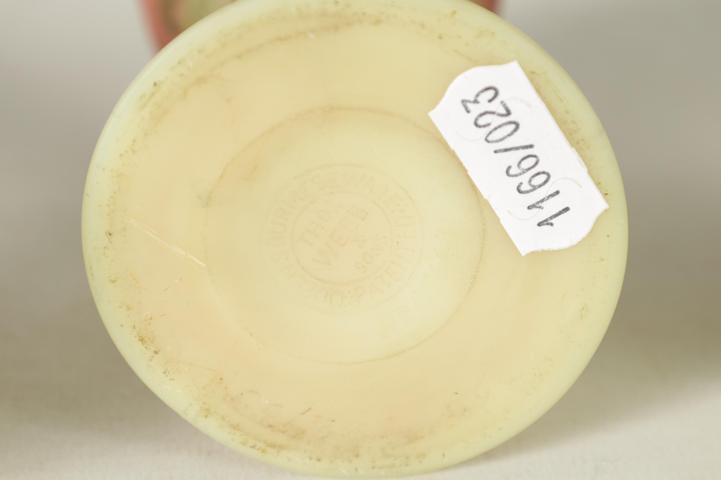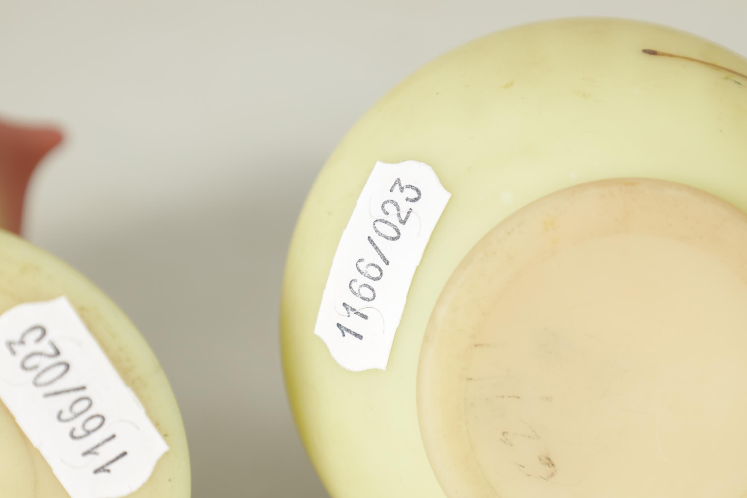 A COLLECTION OF 20TH CENTURY THOMAS WEBB BURMESE OPAQUE GLASS VASES with painted and gilt floral overlays - stamped and paper labels beneath (19cm and 10cm high )