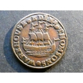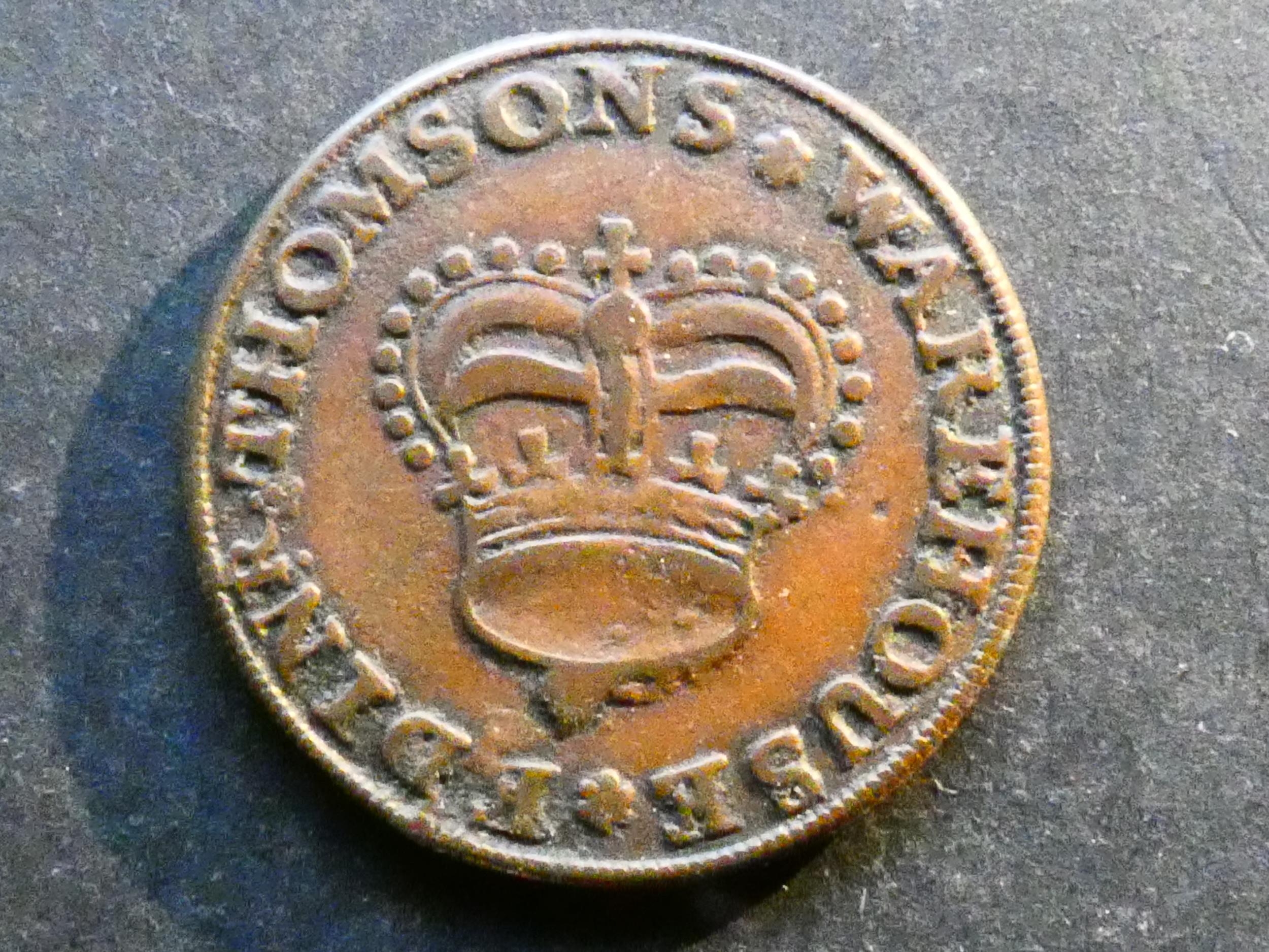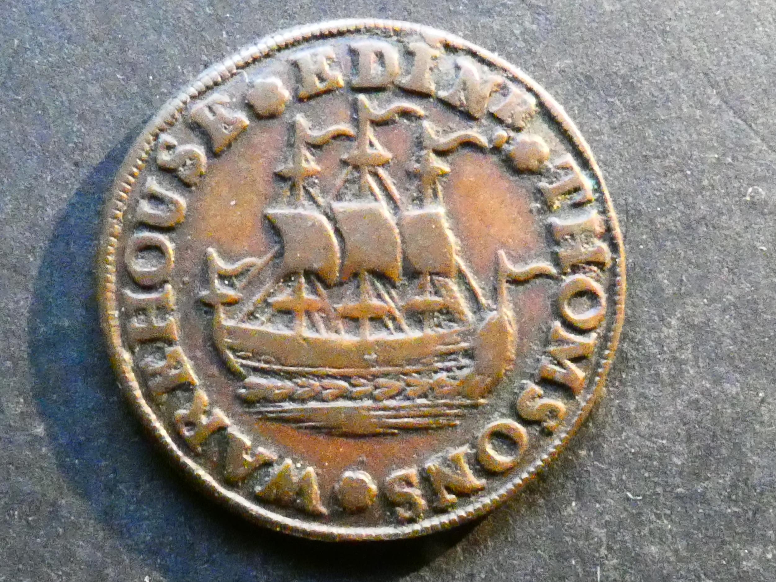 TOKENS - 18th CENTURY. Scotland, Lothian, Edinburgh, Farthing, obverse; THOMSONS WAREHOUSE EDINR, ship sailing left, legend starts at 2 o'clock, reverse; THOMSONS WAREHOUSE EDINR, crown, D&H-129, NVF.