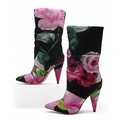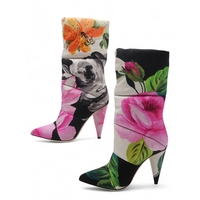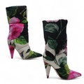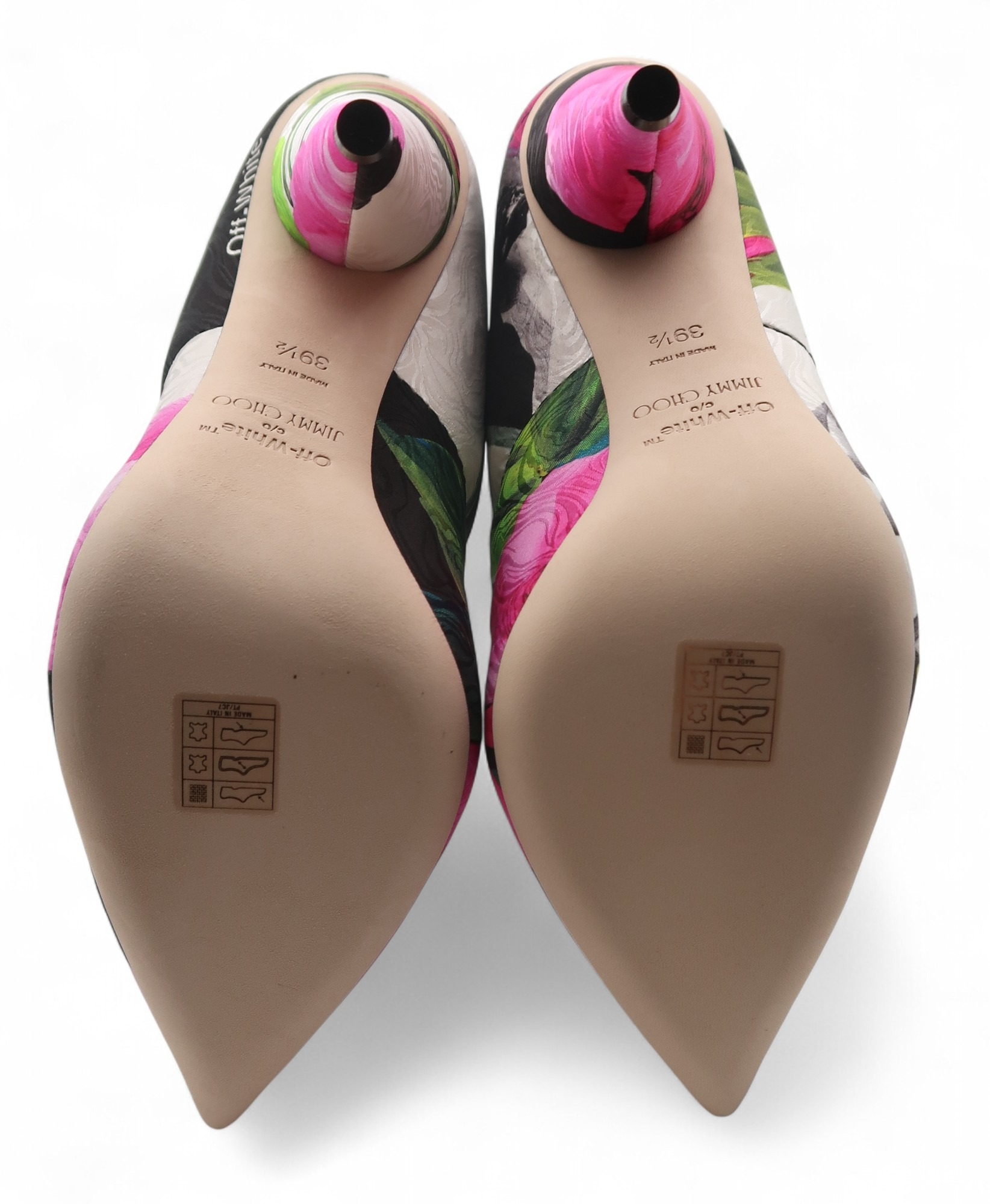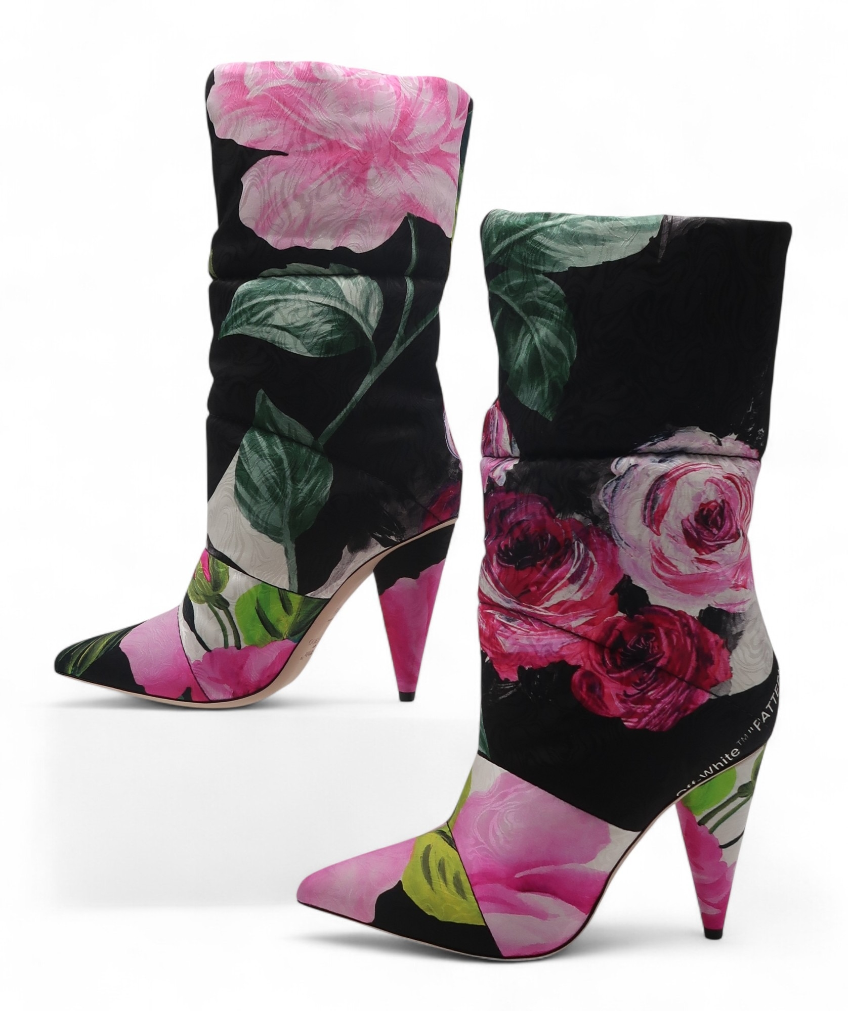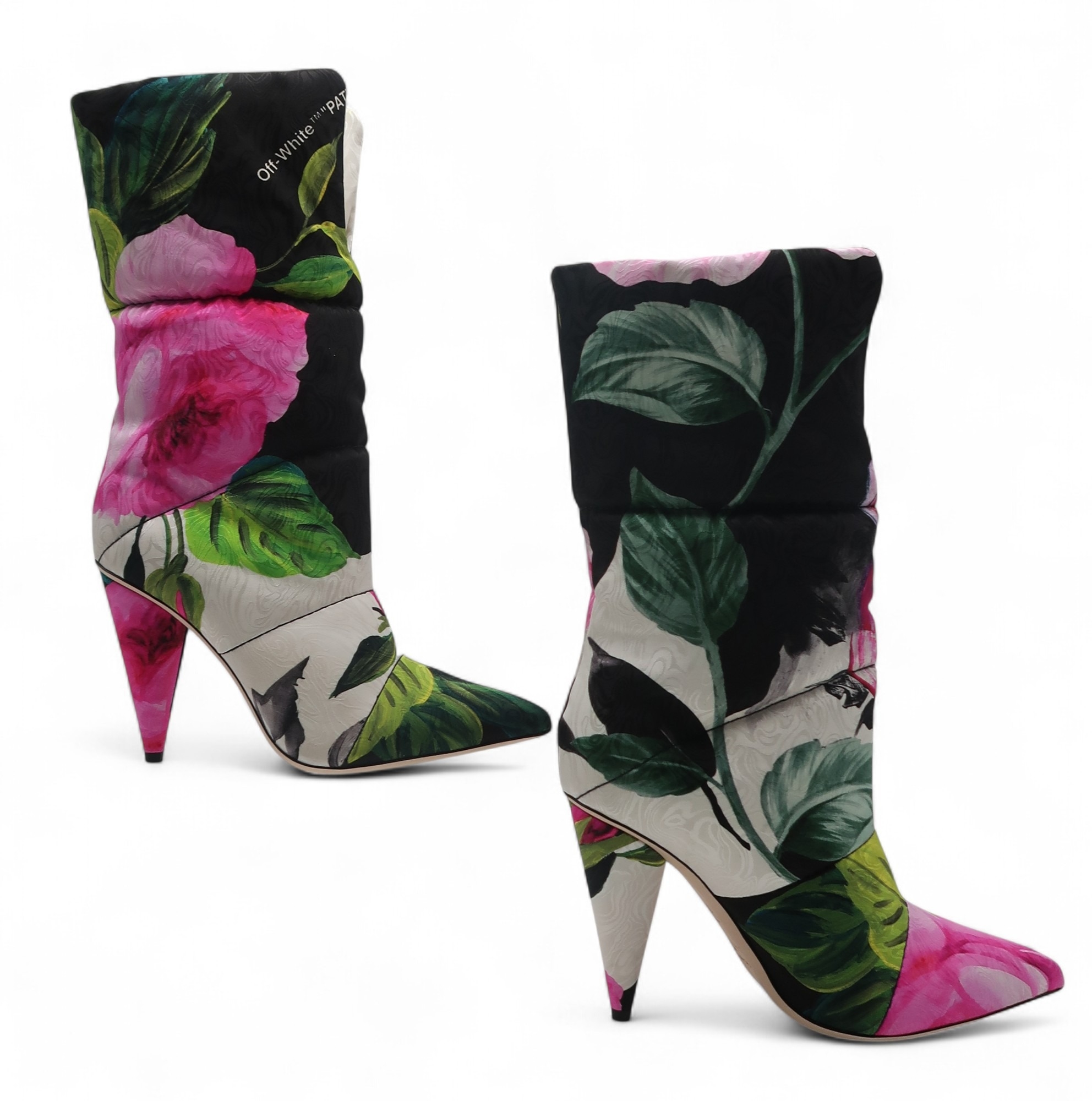 A pair of Jimmy Choo Off-White Sara 100 padded floral high heel boots, size 39.5, with bag and box
