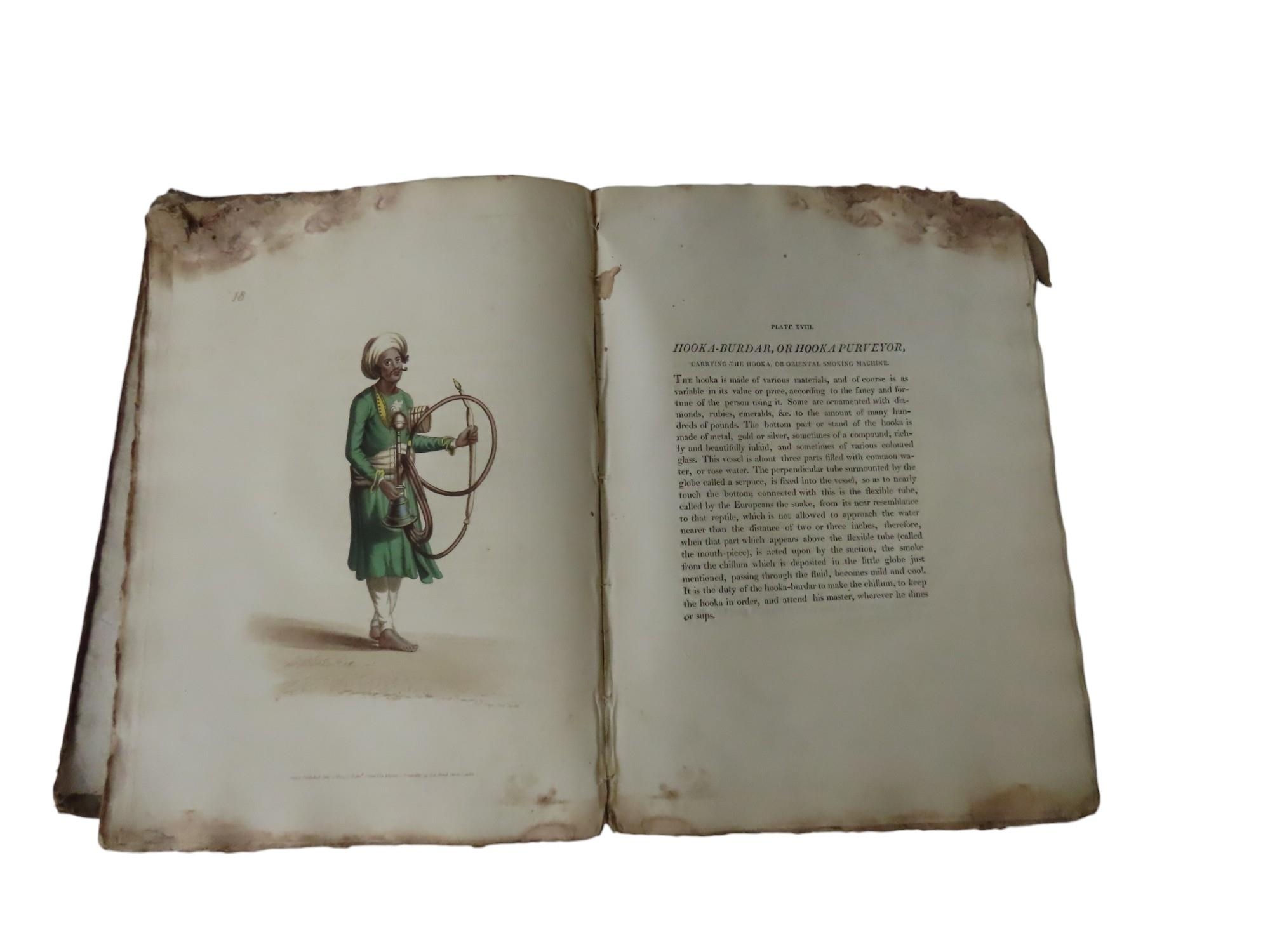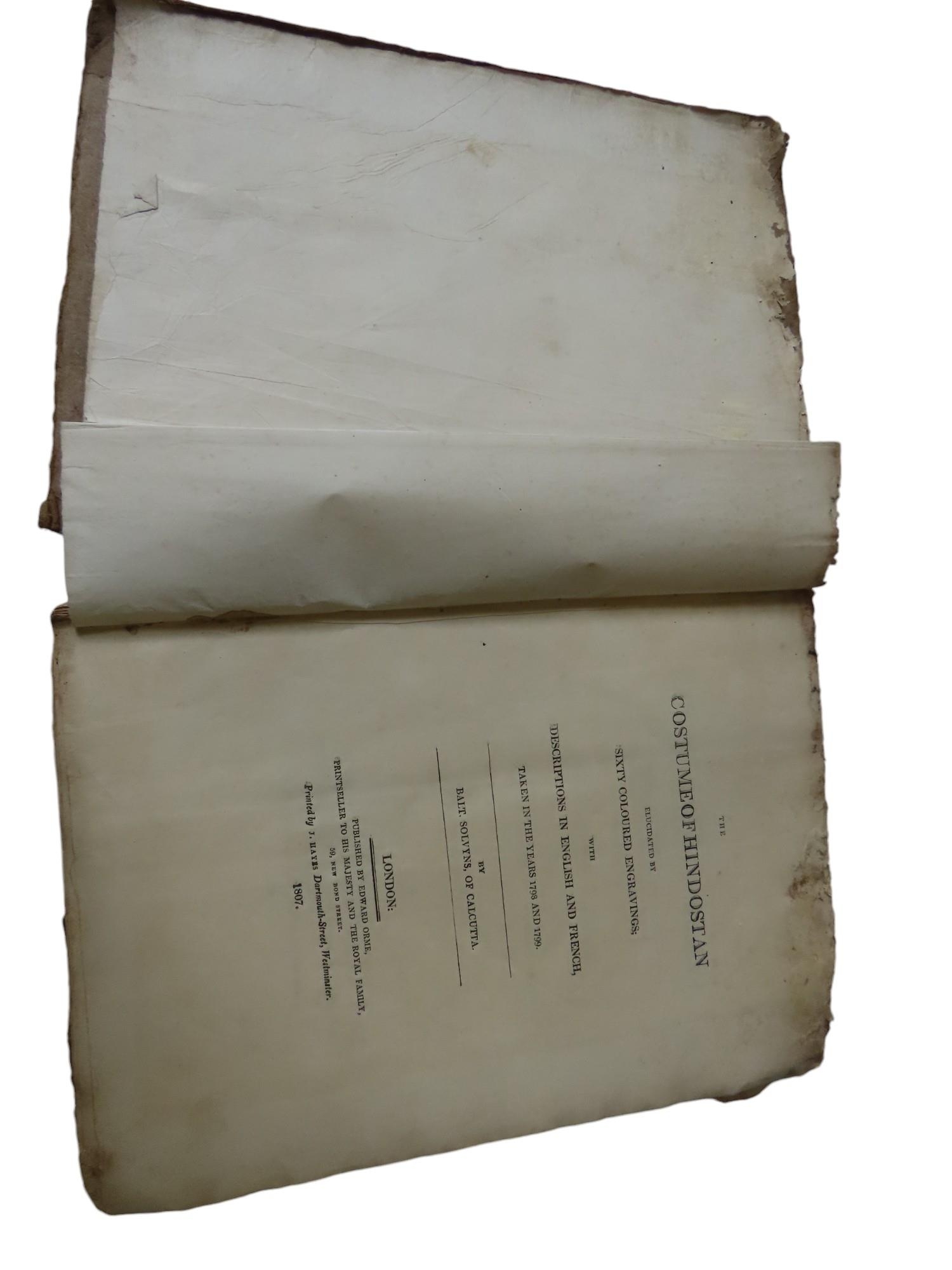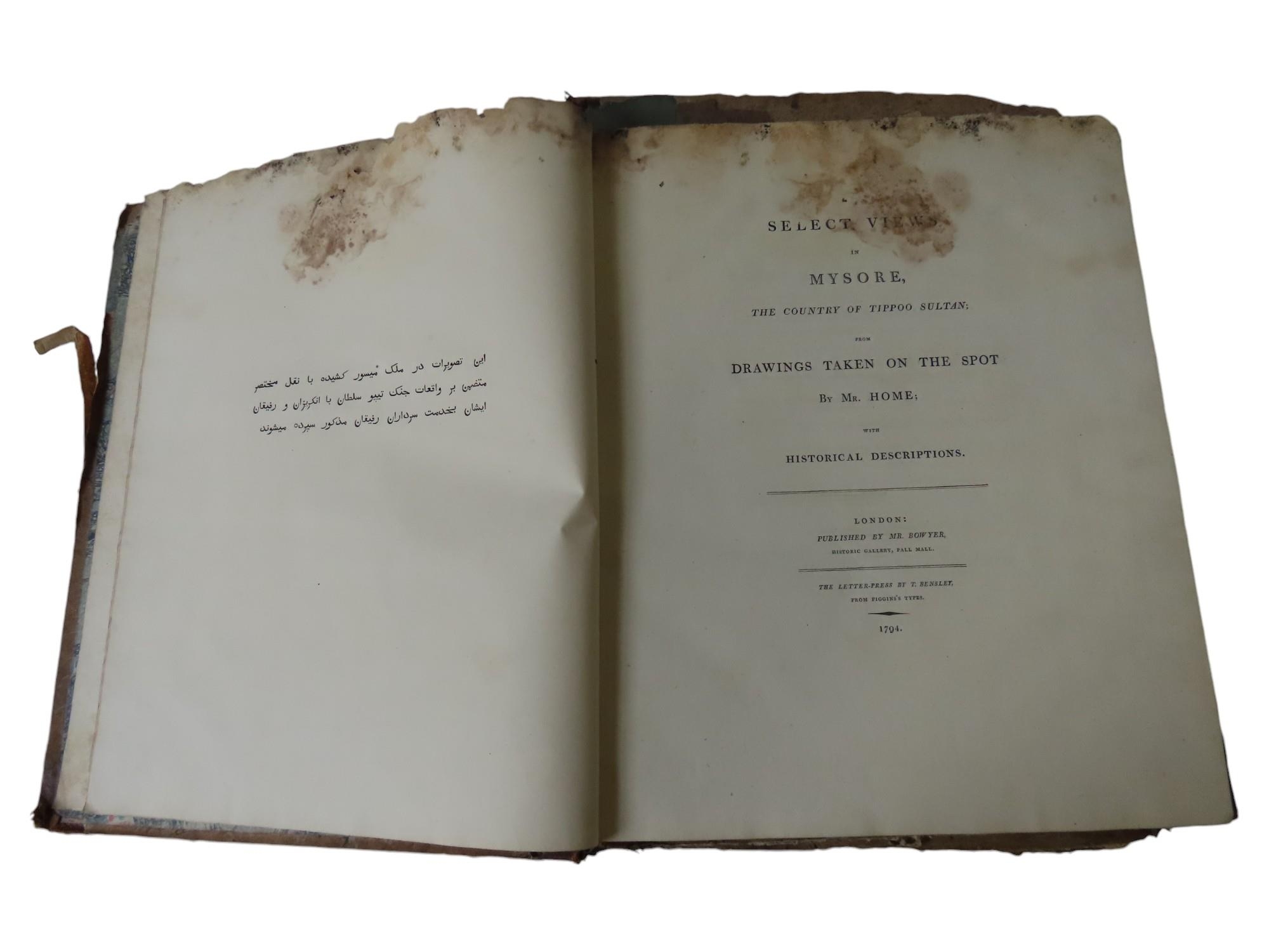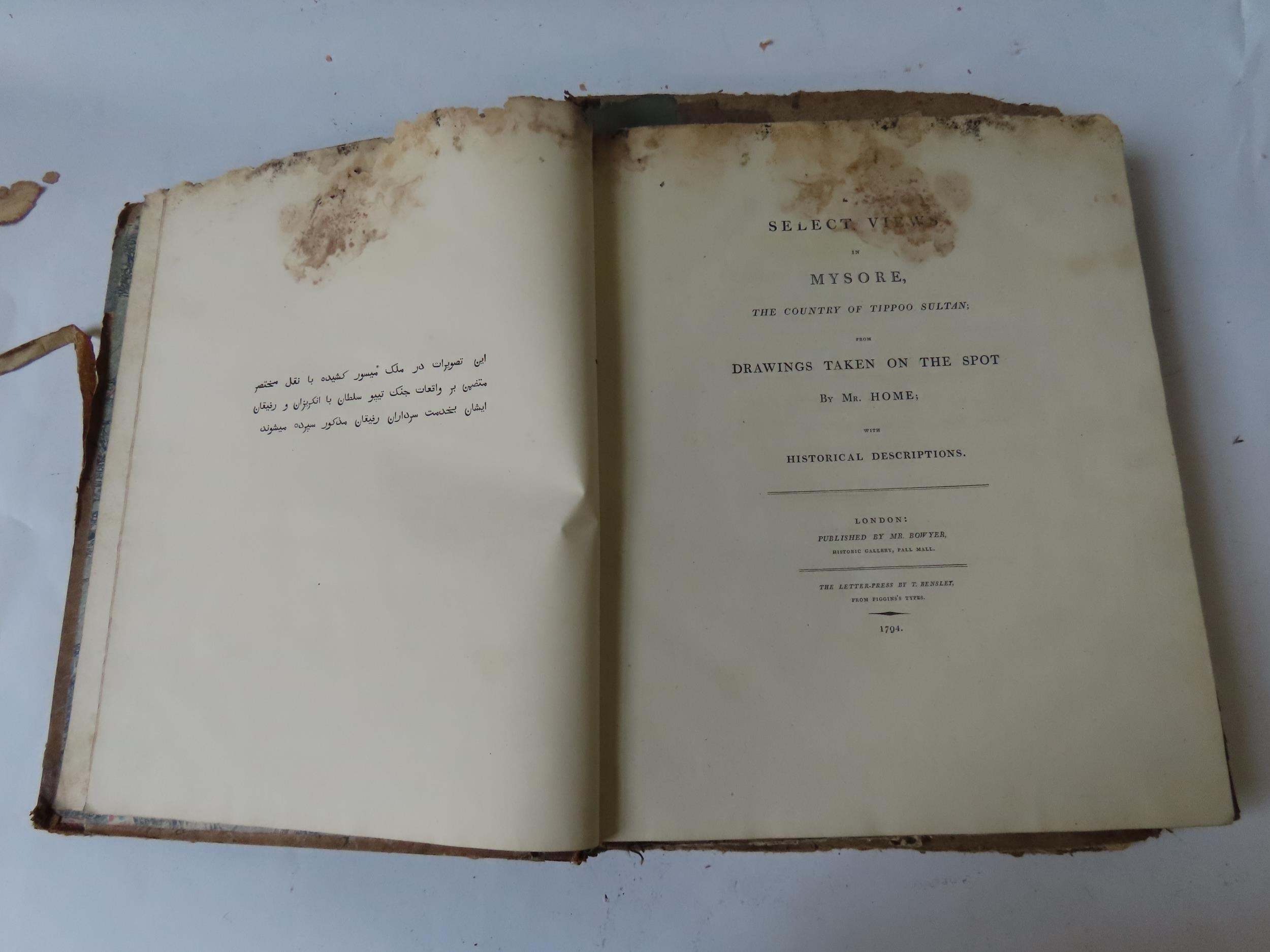 THE COSTUMES OF HINDOSTAN, Elucidated by Sixty Coloured Engravings with Descriptions in English and French, Taken in the Years 1798 and 1799 by Balt. Solvyns of Calcutta, Published by Edward Orme 1807, together with Select Views of Mysore, The Country of Tippoo Sultan, Drawings Taken on the Spot by Mr Home, Published by Mr Bowyer, 1794, both degraded with damp damage and distressed covers and spines.
