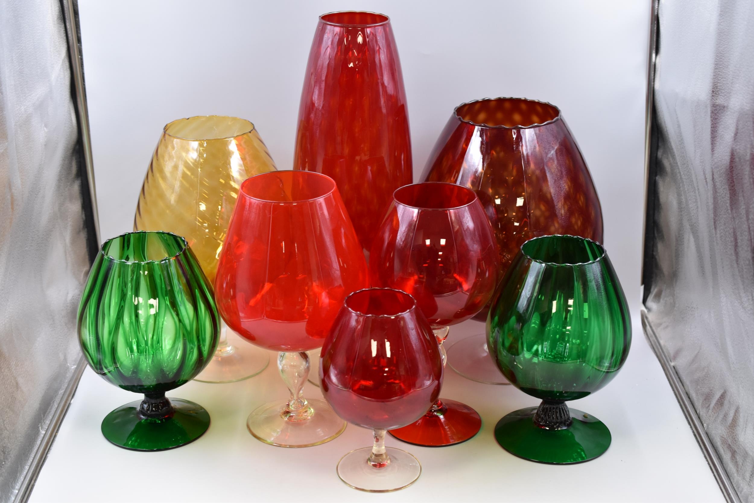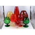 Selection of 8 vintage coloured Brandy glass vases (tallest 19 1/2")