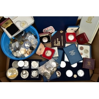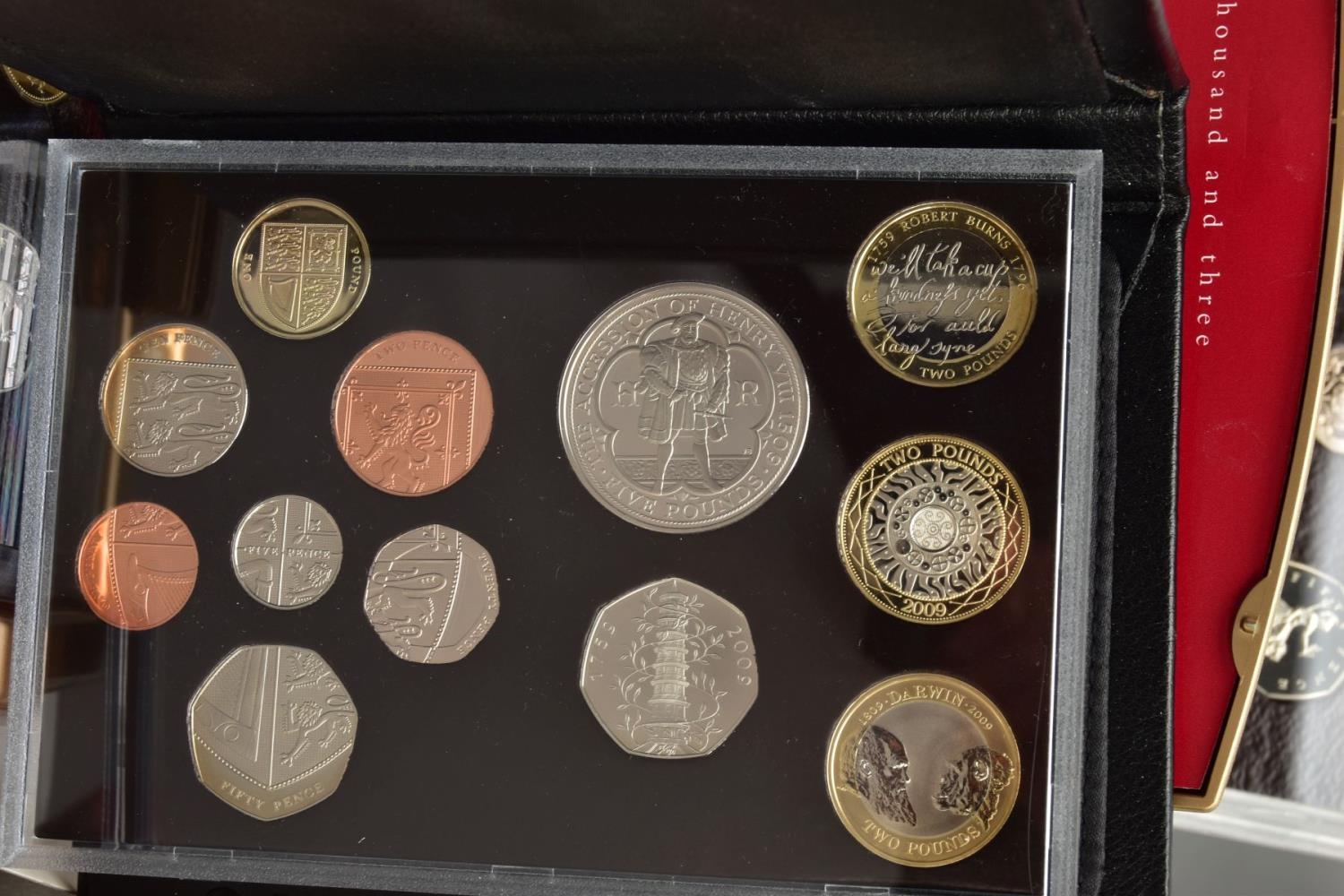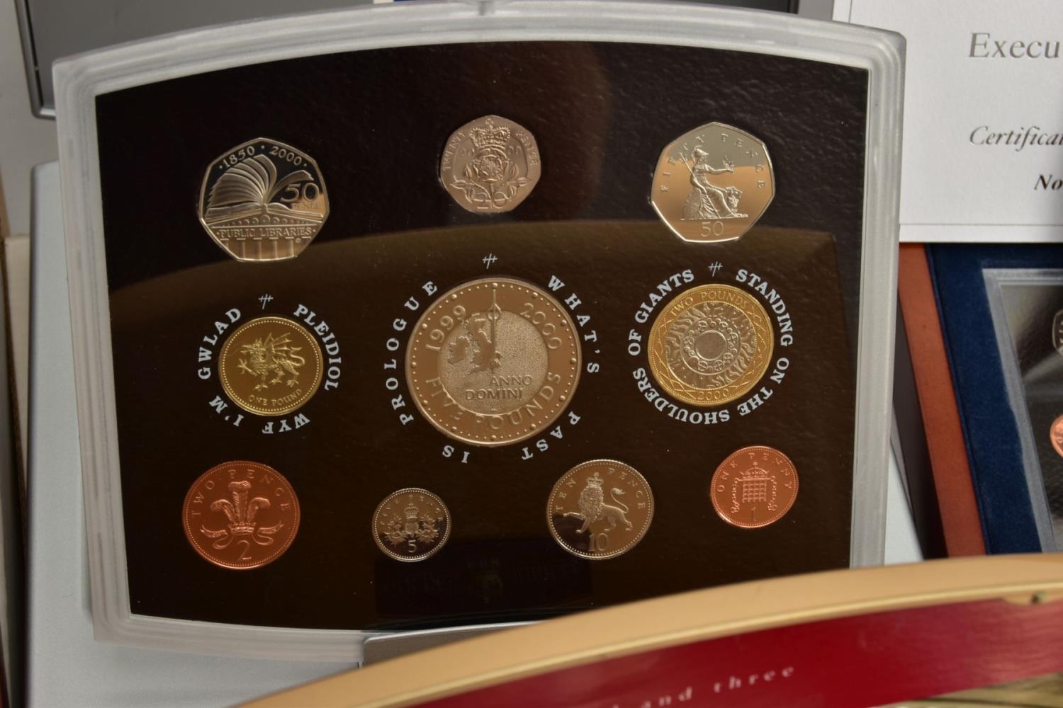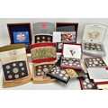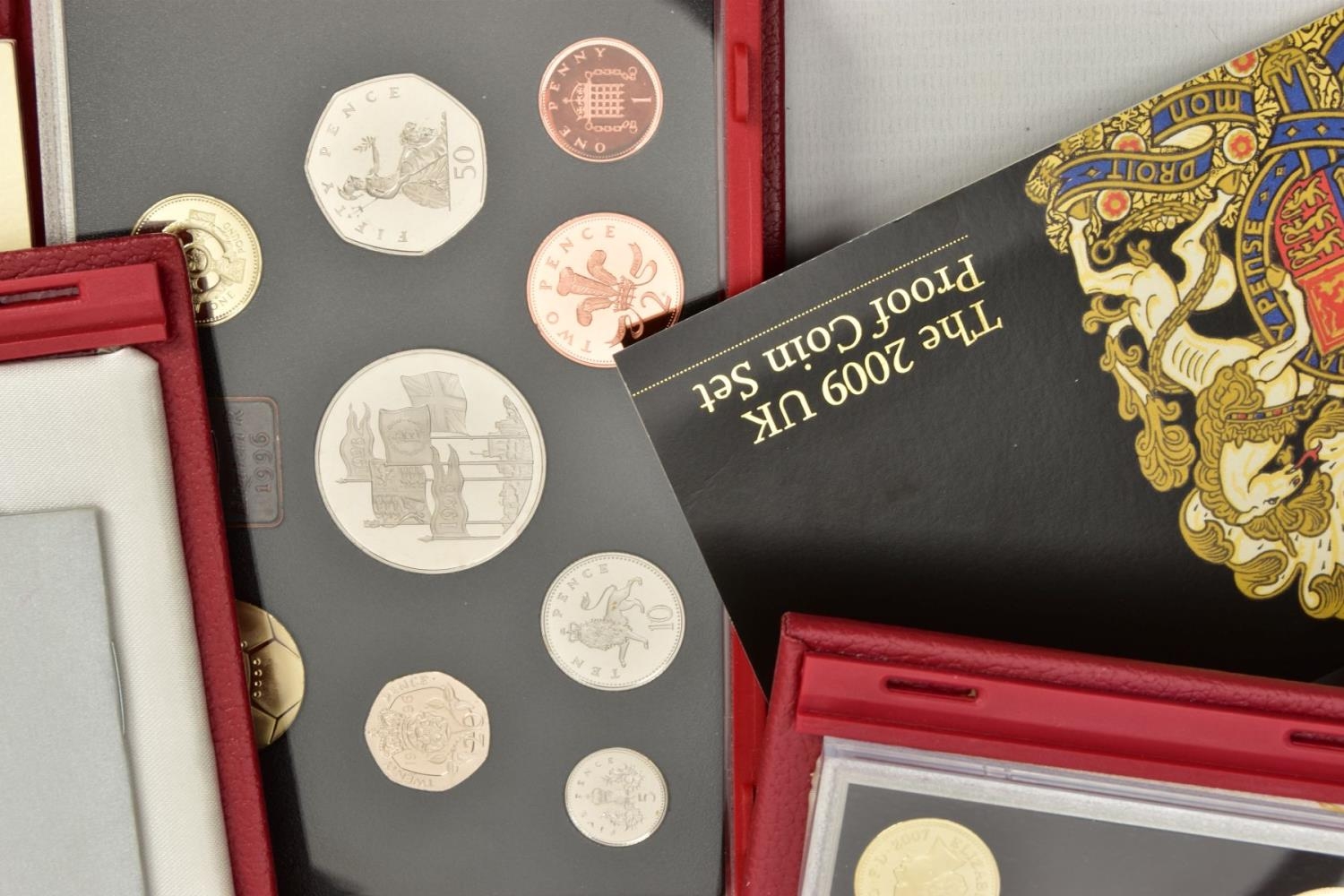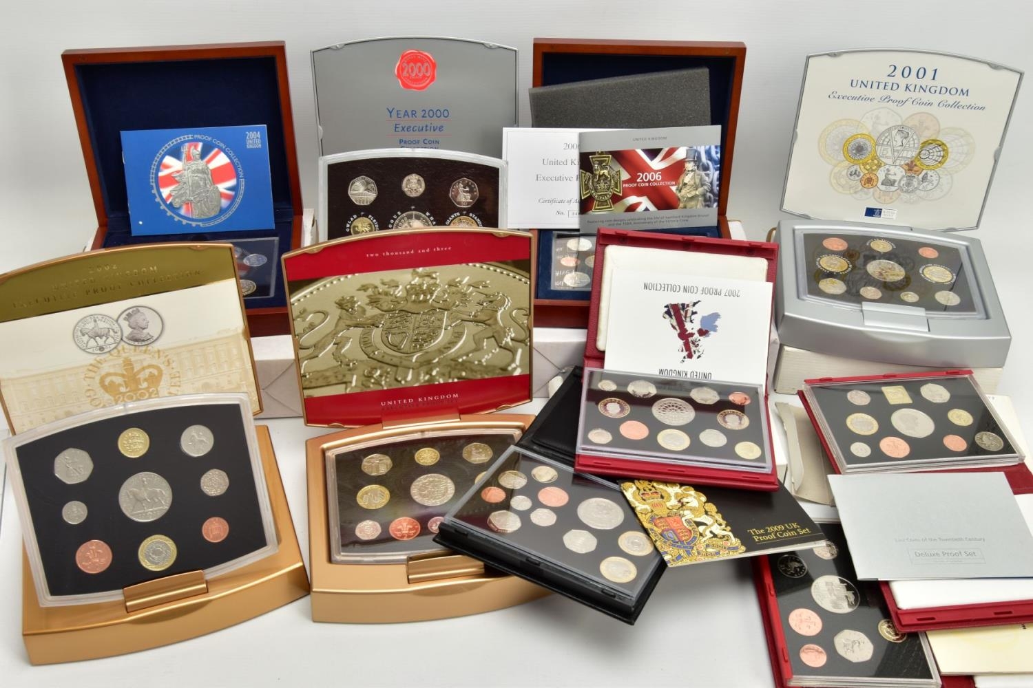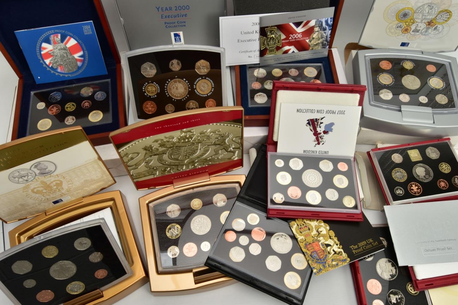 A LARGE PLASTIC BOX CONTAINING COIN SETS, to include 6 x united kingdom executive proof coin collections 2000, 2001, 2002, 2003, 2004, 2006, includes 4 x proof year sets 1996, 1999, 2007, and 2009 proof set that contains the sought after Kew gardens fifty pence proof, all coins sets come with certificates of authenticity (10)