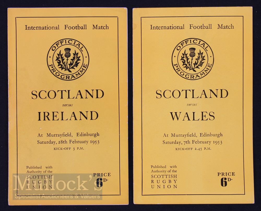 1953 Scottish Home Rugby Programmes (2): Murrayfields as-ever style for the editions against Wales (0-12) and Ireland (8-26). Excellent condition