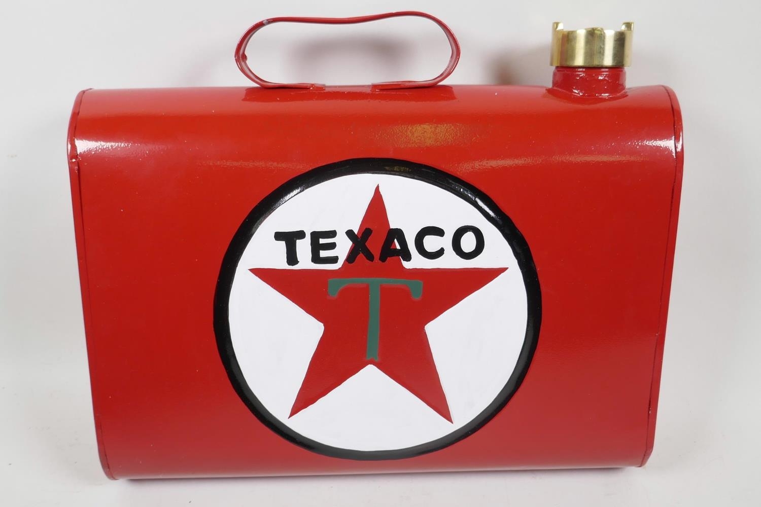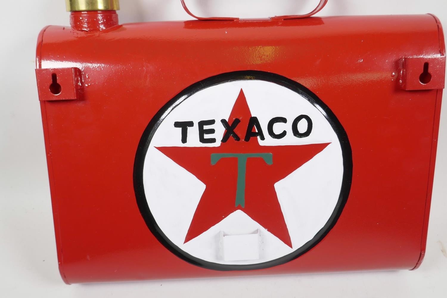 A replica vehicle mounted spare fuel can, marked Texaco, 13½" wide