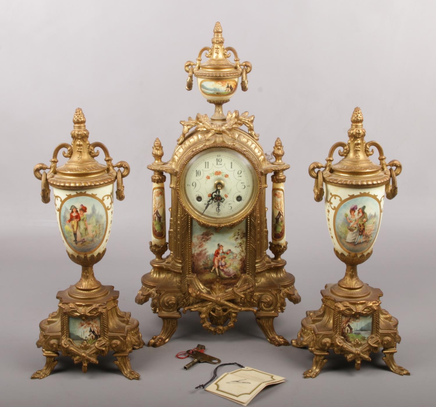A decorative brass mounted clock garniture, decorated with scenes of courting couples.