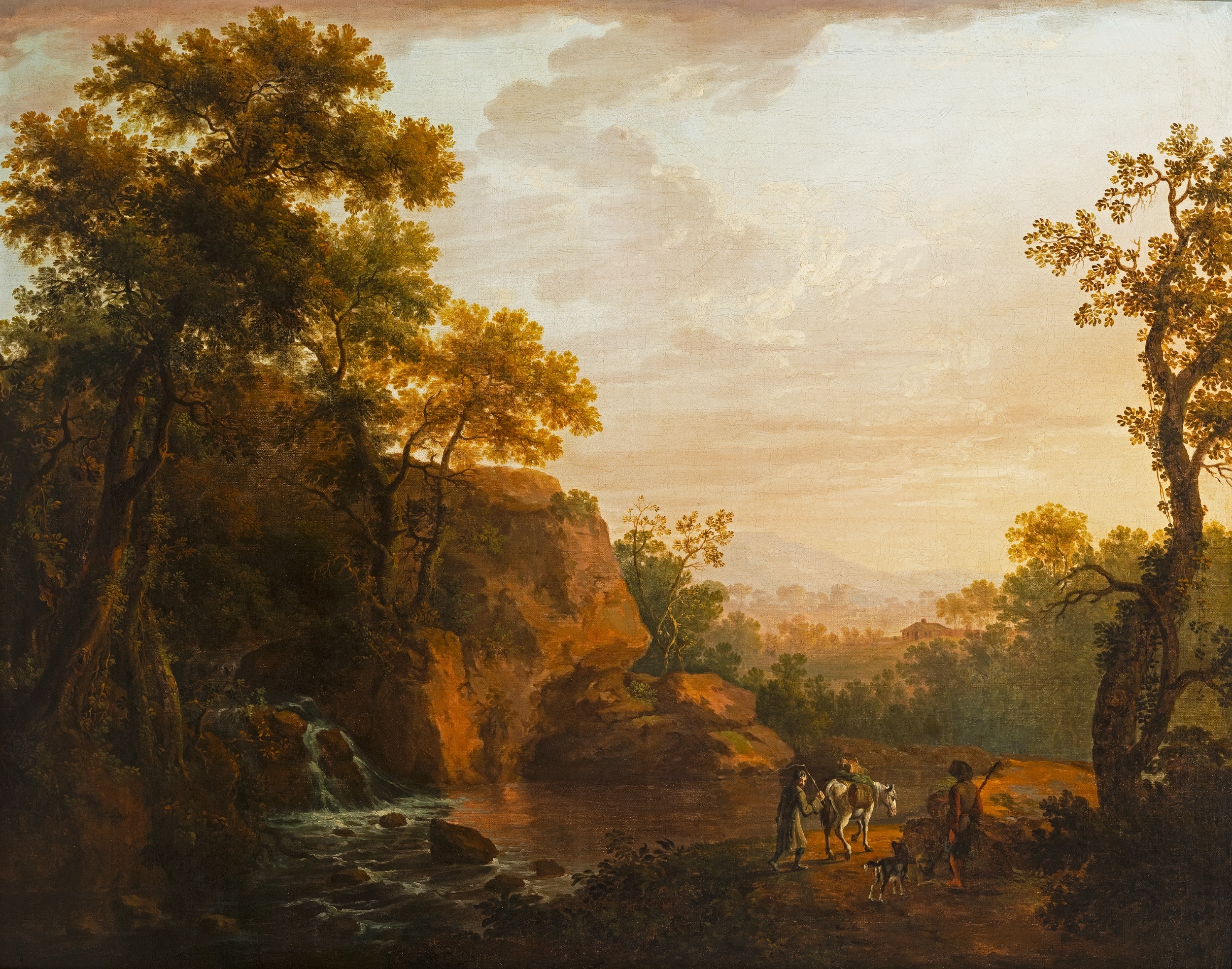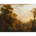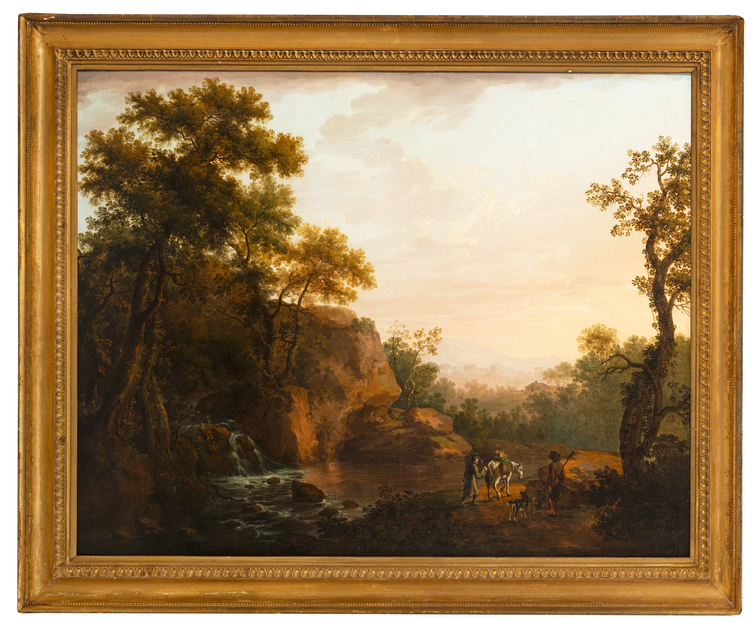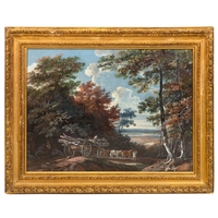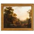 GEORGE BARRET (1732 -1784) Classical River Landscape with Travellers and a White Horse Oil on canvas, 97 x 123cm Provenance: Parker Gallery, London label verso Together with Thomas Roberts (see lot 40), George Barret is the towering figure among the Irish-born landscape painters, sometimes called the Dublin Group, who brought the art to such a notable peak in the second half of the eighteenth century. In 1778, Thomas Campbell (1733-95) noted the ‘general excellence of Irish artists in landscape’ and, elsewhere, he suggested that Irish artists had ‘no competitors’ in the genre. Barret who made his career in London and was honoured as one of the foundation members of the Royal Academy in 1768, would have provided a crucial role model for the younger generation, such as Roberts, back home in Dublin. Barret is an endlessly inventive artist and, while he never repeats himself verbatim, he enjoys ringing the changes by playing with the different elements within his landscape syntax – figures, animals, trees, water, architecture – to produce what are perhaps best seen as ‘variations on a theme’, in which the component parts may vary, but the idiom is recognisably – and distinctively – Barret. Indicating, how he composed his work by a process of continuously shuffling different motifs, which he had observed individually and sketched directly from nature, to create different, and often very varied, compositions, the present large landscape offers an intriguing comparison with a work in the National Gallery of Ireland. The left hand side of the composition of both pictures is largely the same, as large trees grow out of a rocky escarpment from which a natural cascade flows into a river. As often, here Barret’s handling of flowing water is masterly, adding a dynamic sense of movement to this portion of the composition. The right hand sides of the two pictures are, however, noticeably different. In the National Gallery of Ireland work, a fisherman casts his line, rather optimistically, into the rapids, rather than into the still pool of water where he may have had better luck. In our work, by contrast, the composition is animated by a traveller with a white packhorse progressing to the right who has encountered a rustic figure, perhaps another traveller, or shepherd, accompanied by his alert and animated dog. Throughout the whole painting, the palette is controlled in a relatively low key and with none of the chromatic highlights – flicks of red in costumes – that can sometimes distract. Instead landscape and figures blend into a harmonious and very pleasing unity, which is emphasised by the subtly portrayed, even fall of light throughout the painting. This is a classical landscape certainly, but one based on the artist’s clear study of the landscape of his native land, and, most particularly, the scenery of the Dargle Valley in County Wicklow. Barret was born in Dublin probably in 1732. Little is known of his family background except that he was born in the Liberties, the son of a clothier. At about the age of fourteen Barret entered the drawing school of Robert West (soon to be taken over the Dublin Society), which exclusively taught drawing through the copying of prints, drawings and casts. In 1747 the young Barret came to public attention for the first time when as a young student at the Drawing School he was awarded a premium for his proficiency. At some point in the late 1740s or very early 1750s, Barret received his first notable commission when he was employed by Joseph Leeson to paint a series of landscapes which were set into decorative plaster frames in the Library (now the Dining Room) of his newly-built house at Russborough, County Wicklow. The capriccios Barret painted for Leeson, if more classically inspired than some of his later works (particularly in the depiction of the architecture), are delightful and they set the tone for the rest of his Irish-period oeuvre. Through the 1750s, and particularly the early 1760s, Barret continued to develop his personal style. The somewhat schematic structural characteristics of the 1740s remain, but his paintings become more boldly rendered and enlivened with increasing success by diminutive figures that evolve from Rococo Italianate staffage to more substantial and convincing fishermen or wayfarers – as here. In the years immediately preceding his departure for London, Barret seems to have been exceptionally busy and he received commissions from the most exalted levels of Irish society. During his formative years in Ireland Barret enjoyed the patronage of, among others, the Peppers of Ballygarth Castle and the Bectives of Headfort, and painted accomplished, classical landscapes, capriccios, house portraits, topographical views and, on occasion, hybrid compositions that drew on all of these models. Barret moved with some degree of social proximity with his grand patrons, appearing, for example, in a letter of 7 December 1762 from Emily FitzGerald at Castletown, her sister’s house in Kildare, where his presence is noted in the company of Lord Powerscourt. In the same year that he was working at Castletown, Barret was actively engaged in painting Powerscourt’s famous County Wicklow demesne. Several views survive, including two of the great house, built to designs by Richard Castle, and at least four of the famous waterfall. Views of Powerscourt were among the works Barret showed at the Society of Artists in his first London exhibition in 1764. Barret had left for London at some point in 1762. By September of that year, an auction was held ‘of the furniture of Mr. George Barret’s house in Leeson Street, near Donnybrook corner at Stephen’s Green’, rather appropriately just across the Green from where this work will be auctioned. Barret thrived in London, winning honours, patronage from the great of Georgian England, and, occasionally, wealth too. However, it is for his Irish landscapes such as the present wor