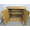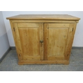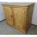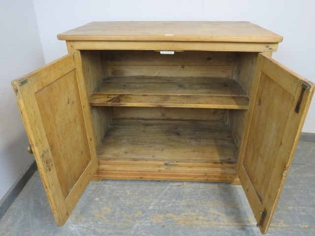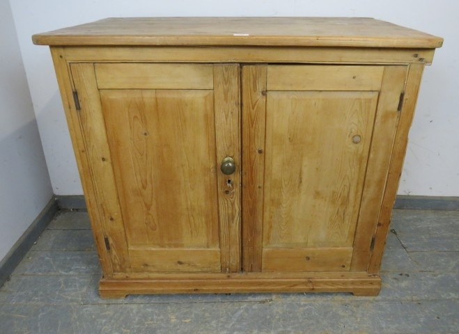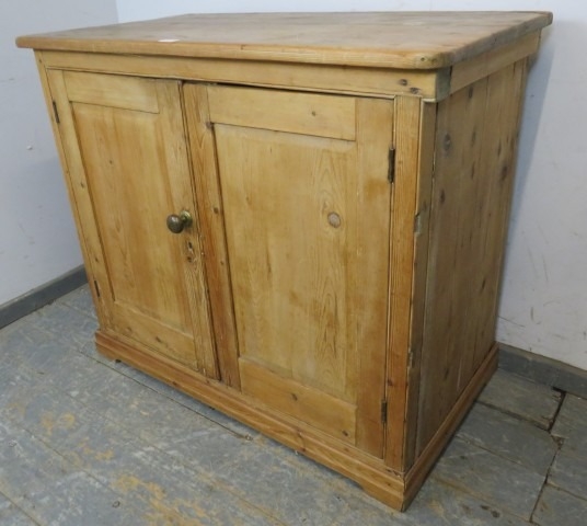 A 19th Century pine two door cupboard with a single shelf inside and a brass handle. H93cm x W108cm x D60cm approx.