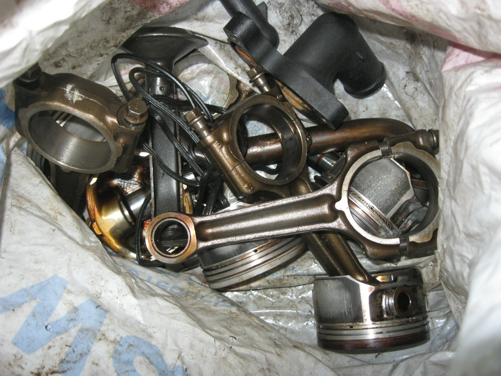 A bag of assorted pistons, conrods etc