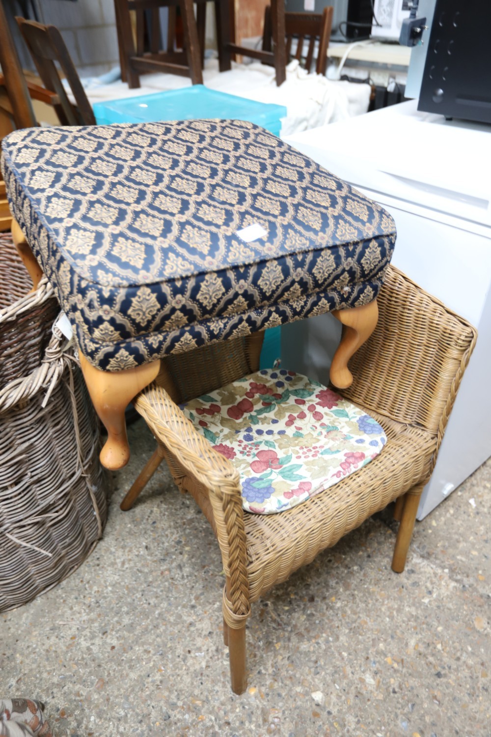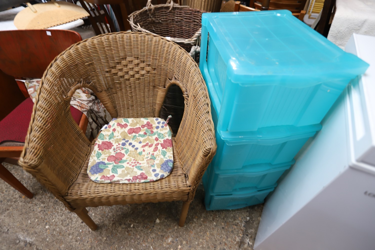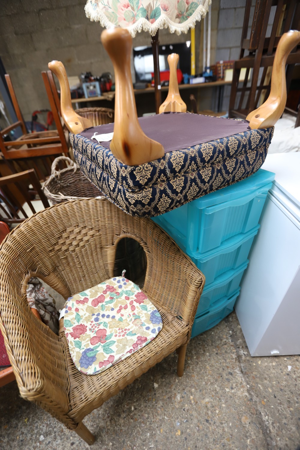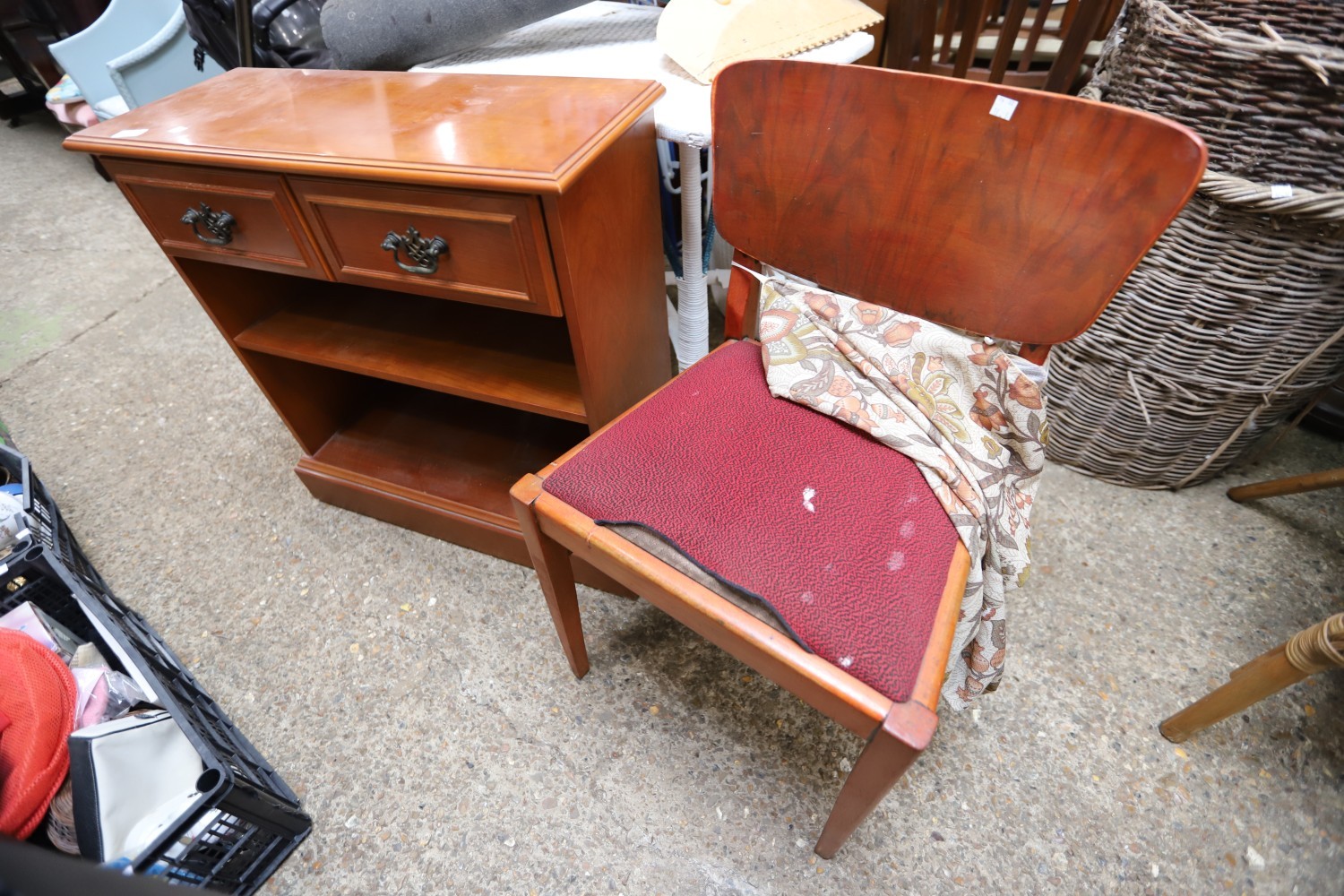Bookcase, 2 chairs, footstool, plastic storage