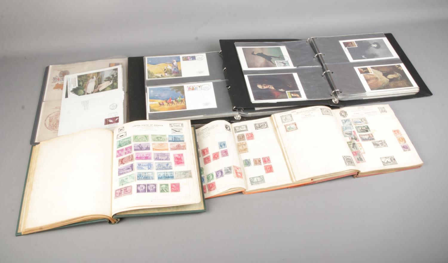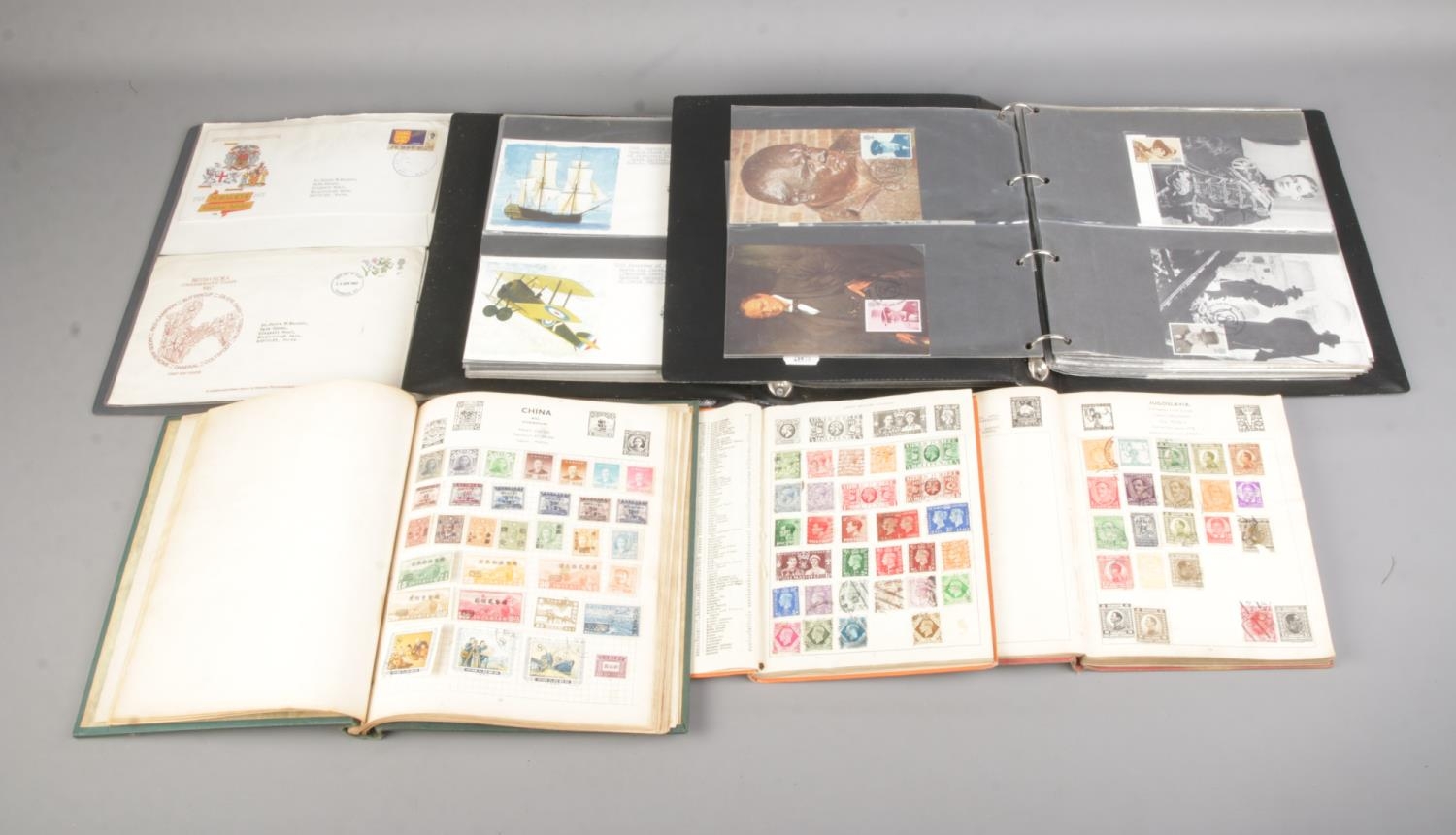 Three albums of first day covers including sailing ships, bi planes, trains, famous people, cricket etc with three partially filled albums of stamps from around the world.