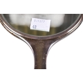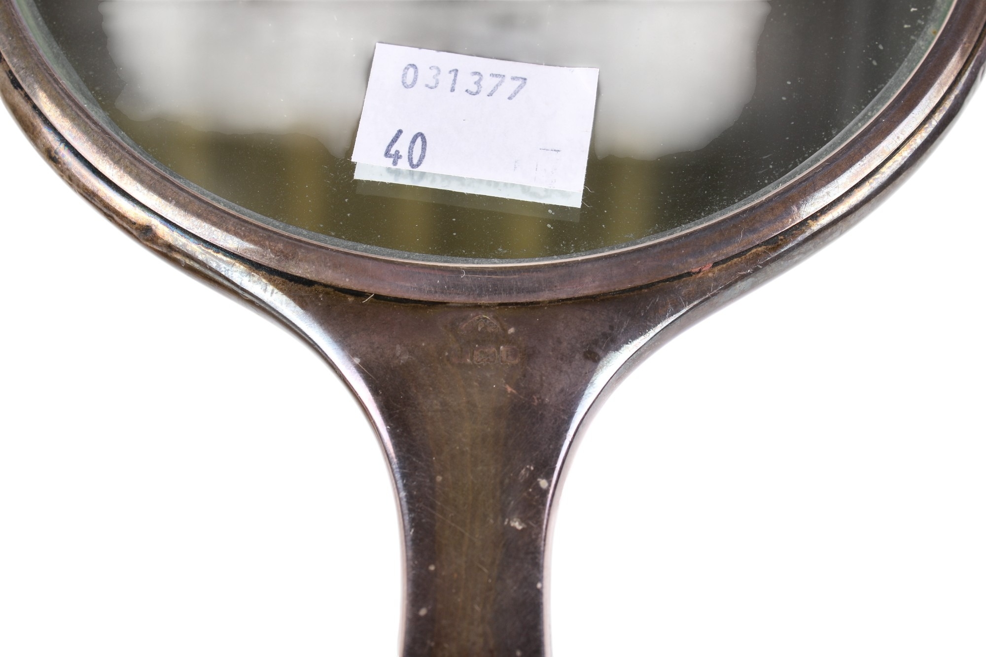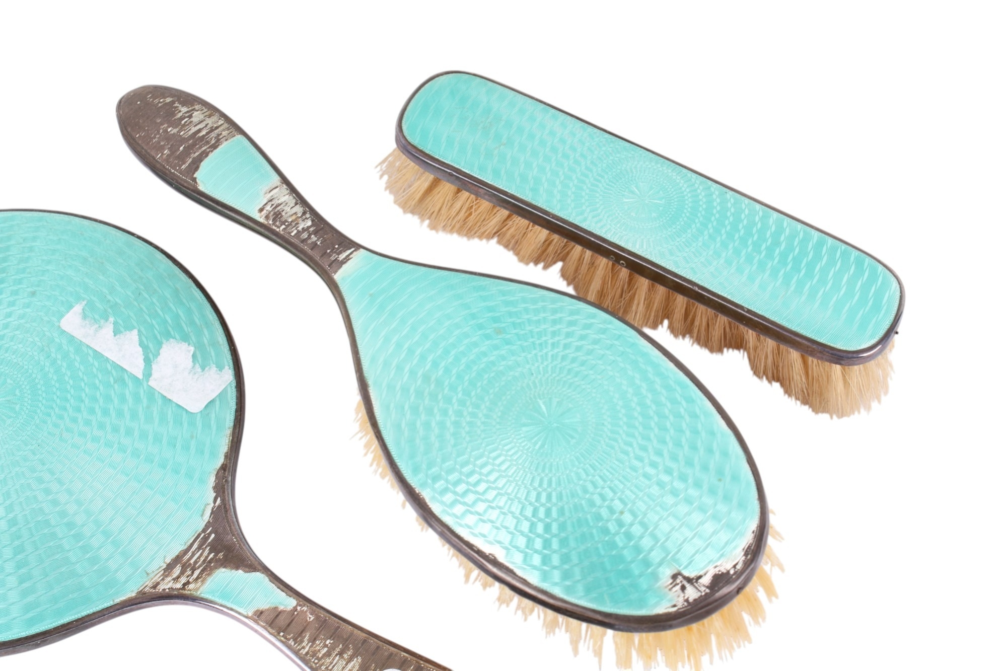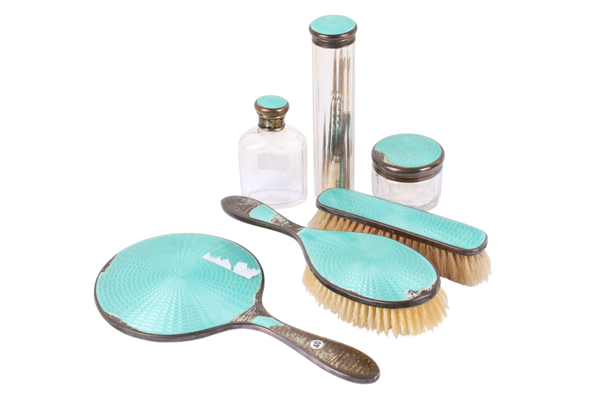 A silver and turquoise enamel dressing table set. Comprising hand mirror, two brushes, three glass pots and two manicure items, hallmarks for Birmingham 1929, together with three mother of pearl handled sewing implements. (AF)