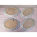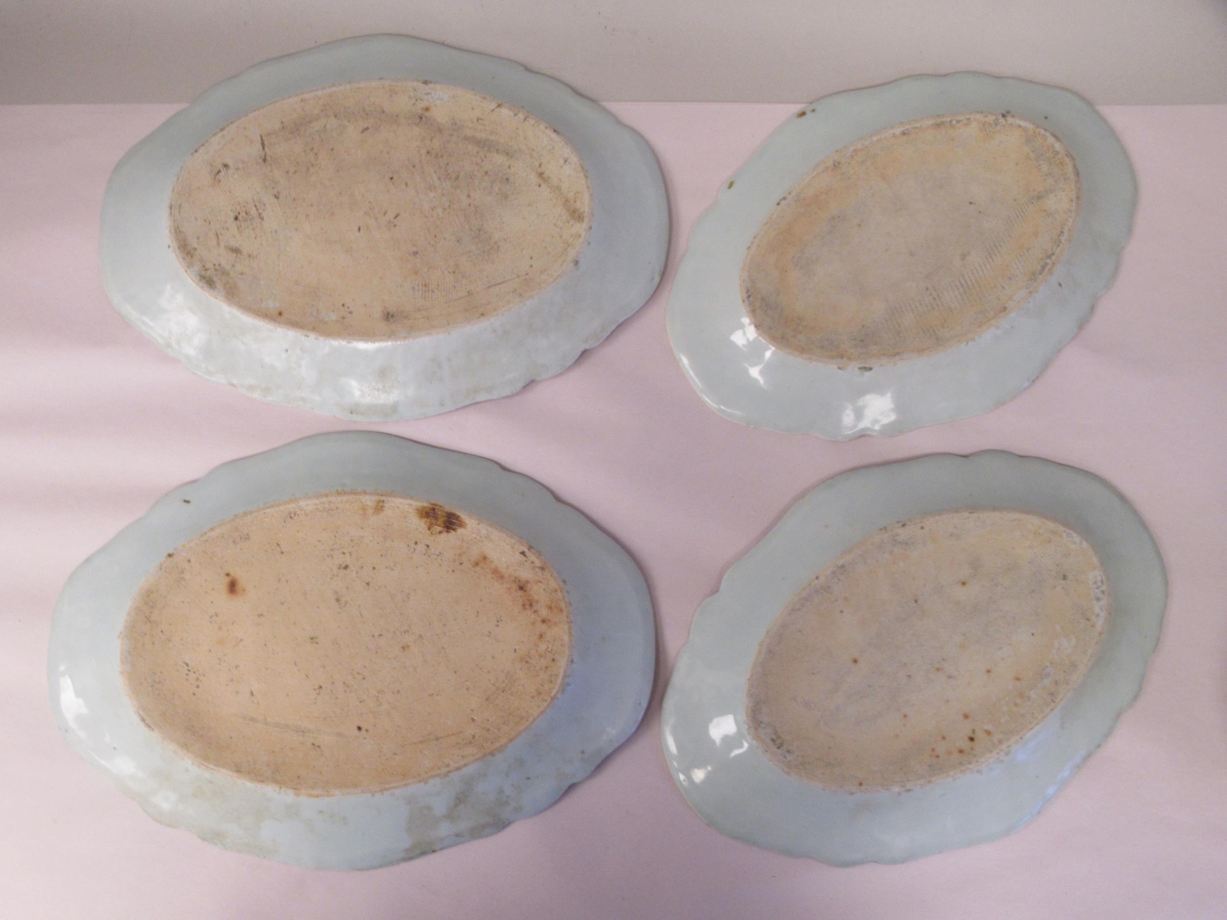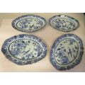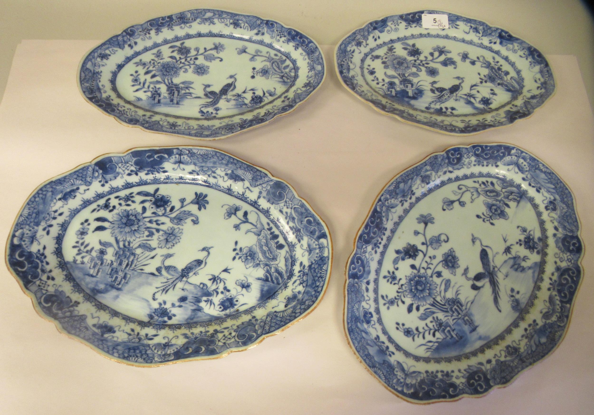 Two identical pairs of late 18thC Chinese porcelain, oval wavy edged dishes, decorated in blue and white with exotic birds and flora 13" & 12"w