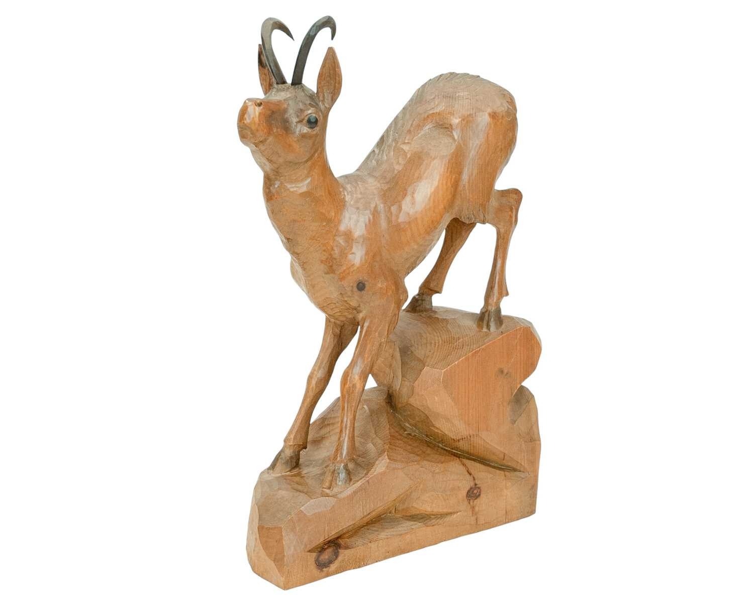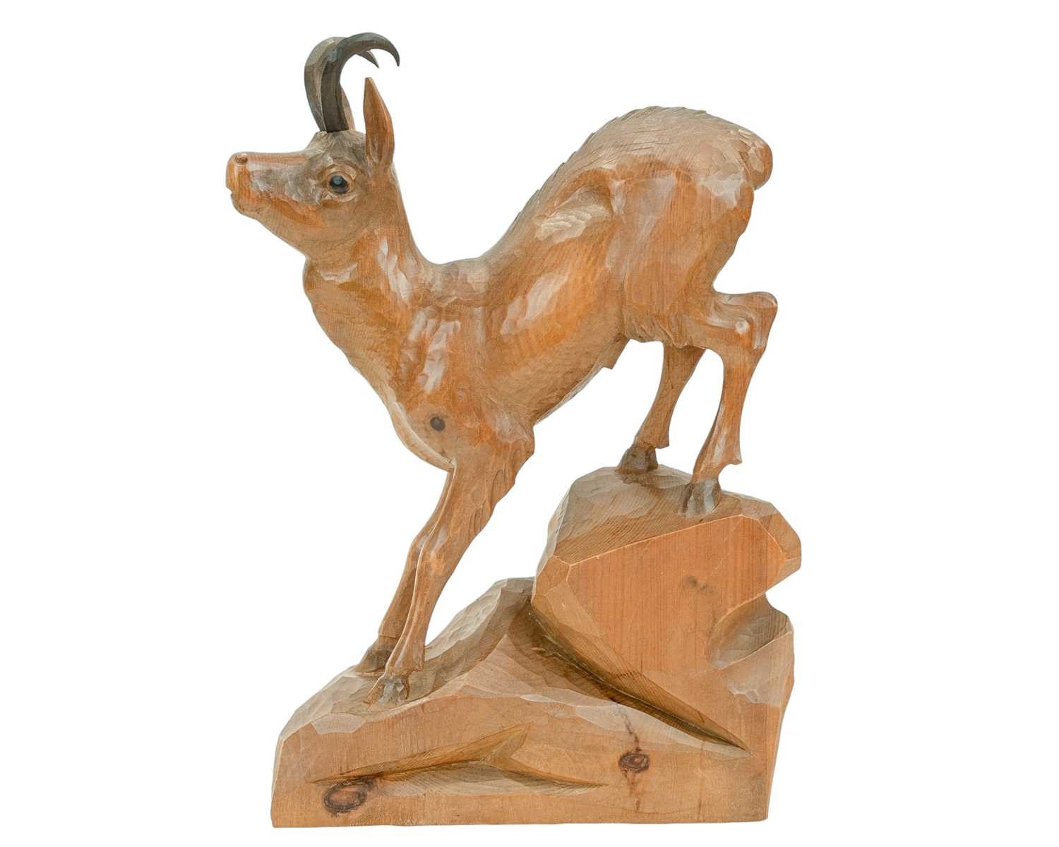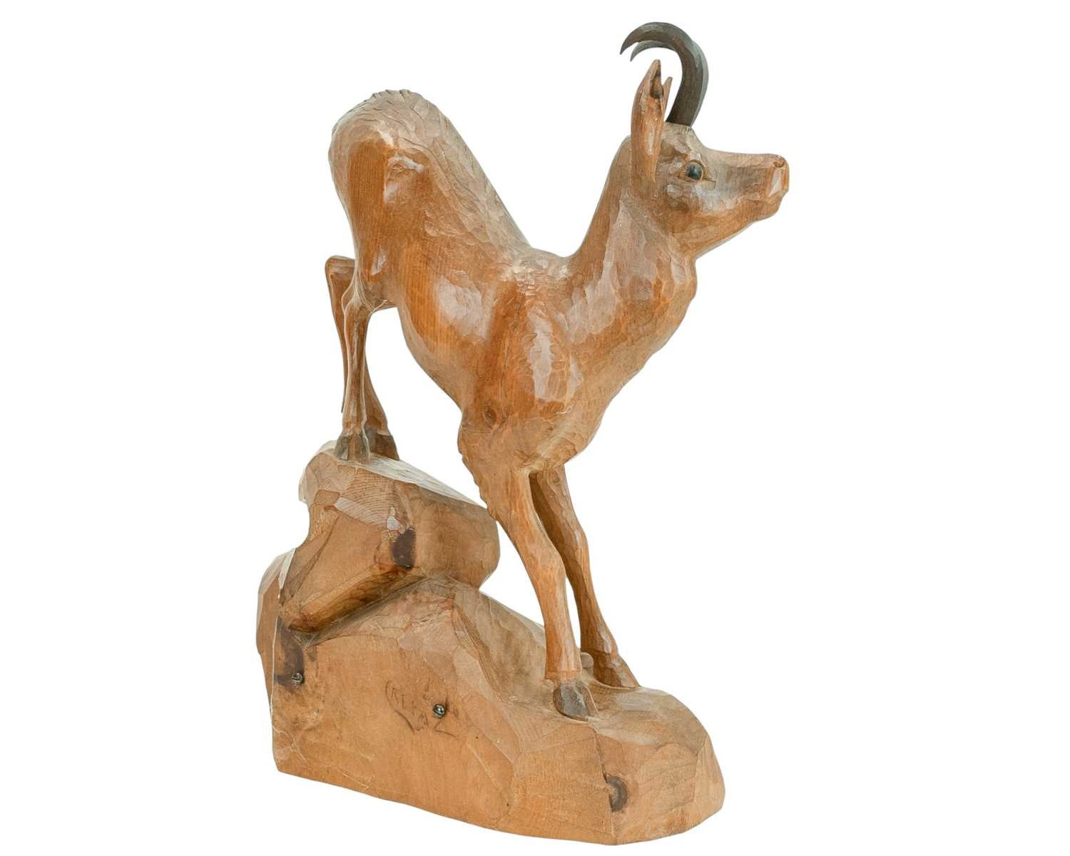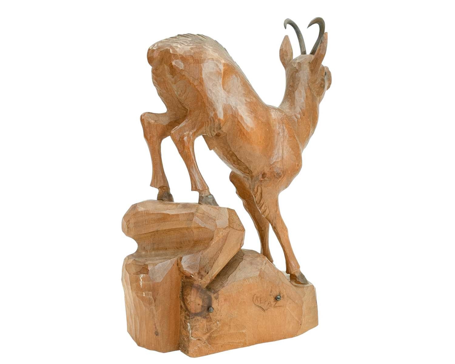 A carved wood figure of a chamois or mountain goat, signed Crepaz. 20th century. Height 45.5cm.