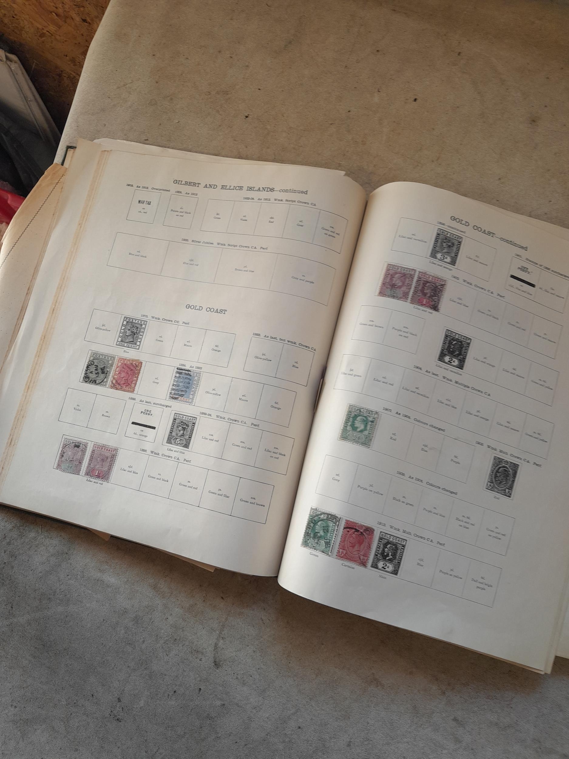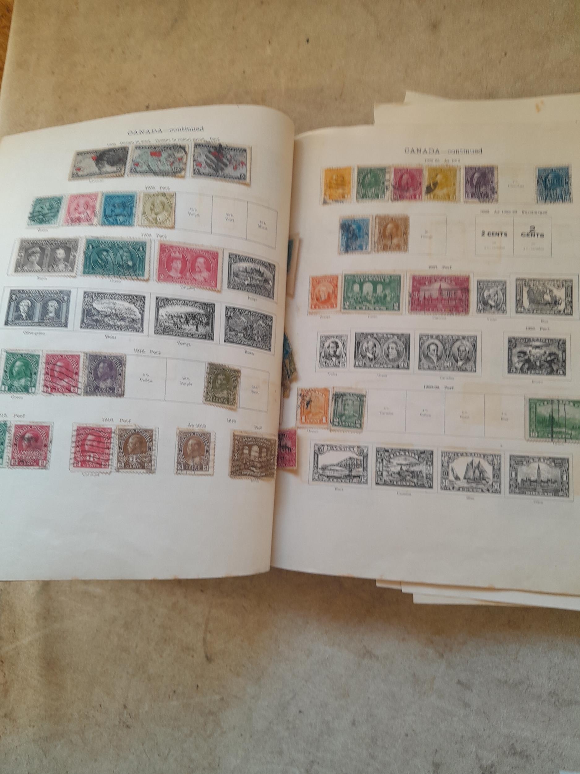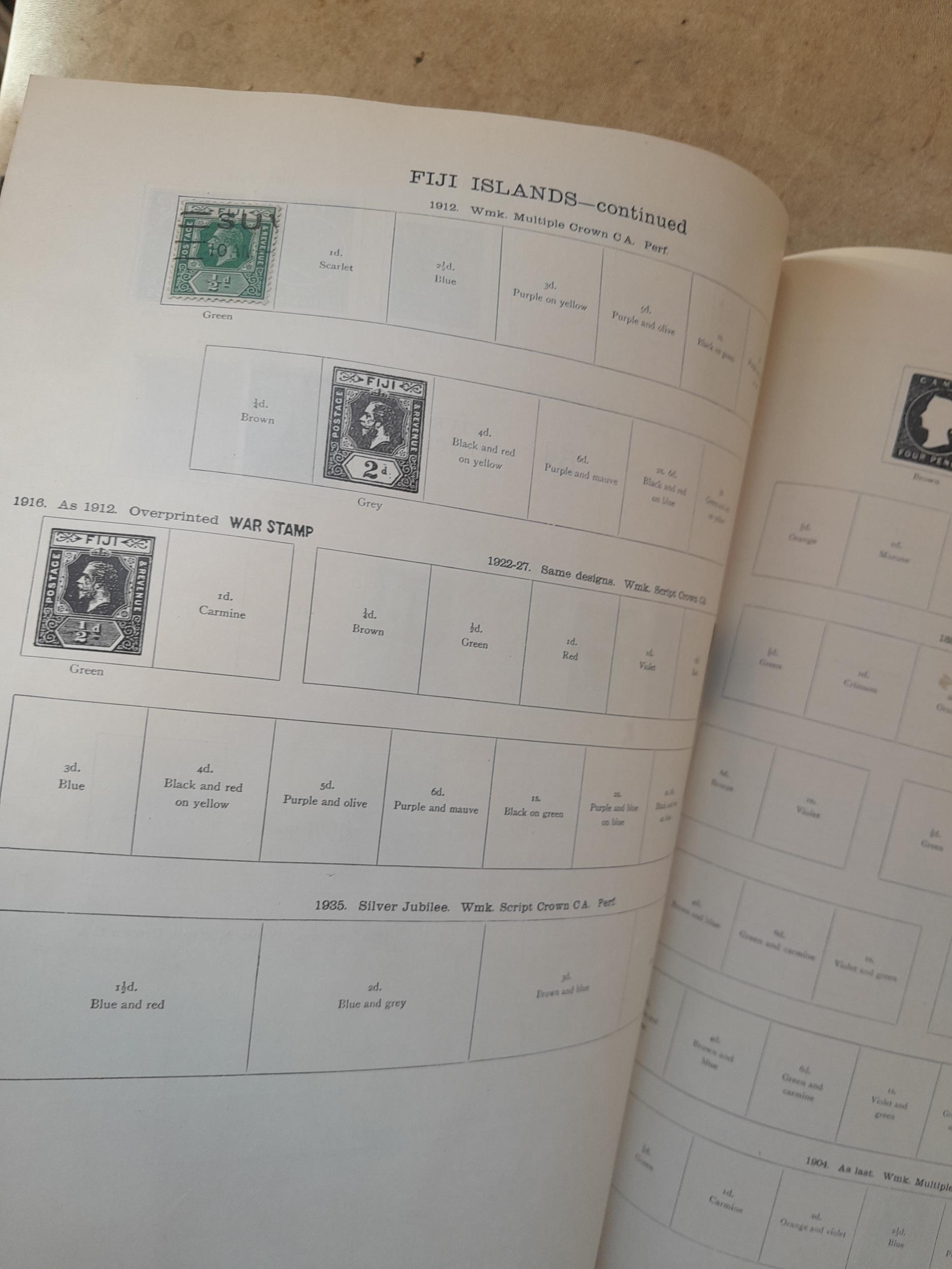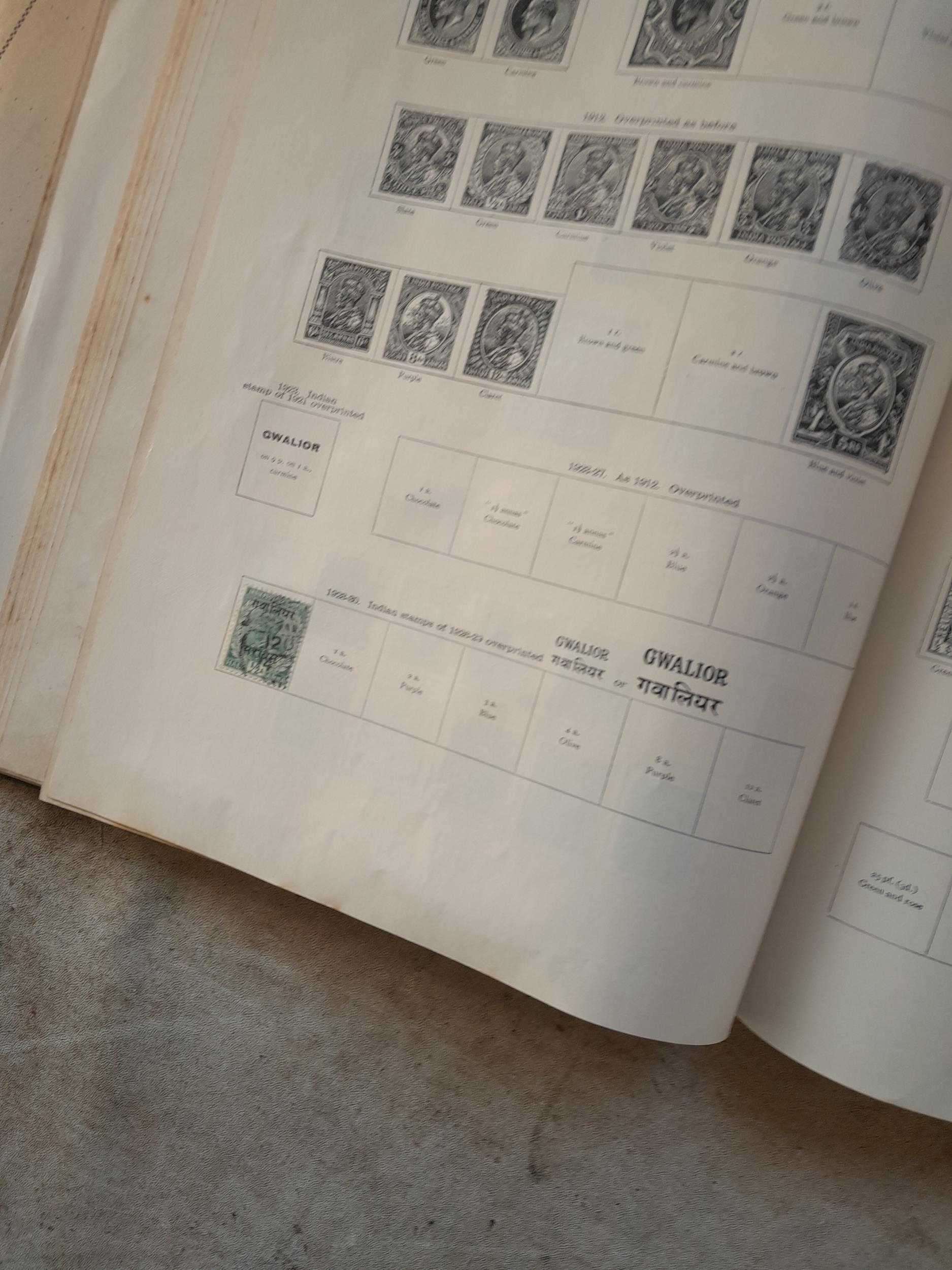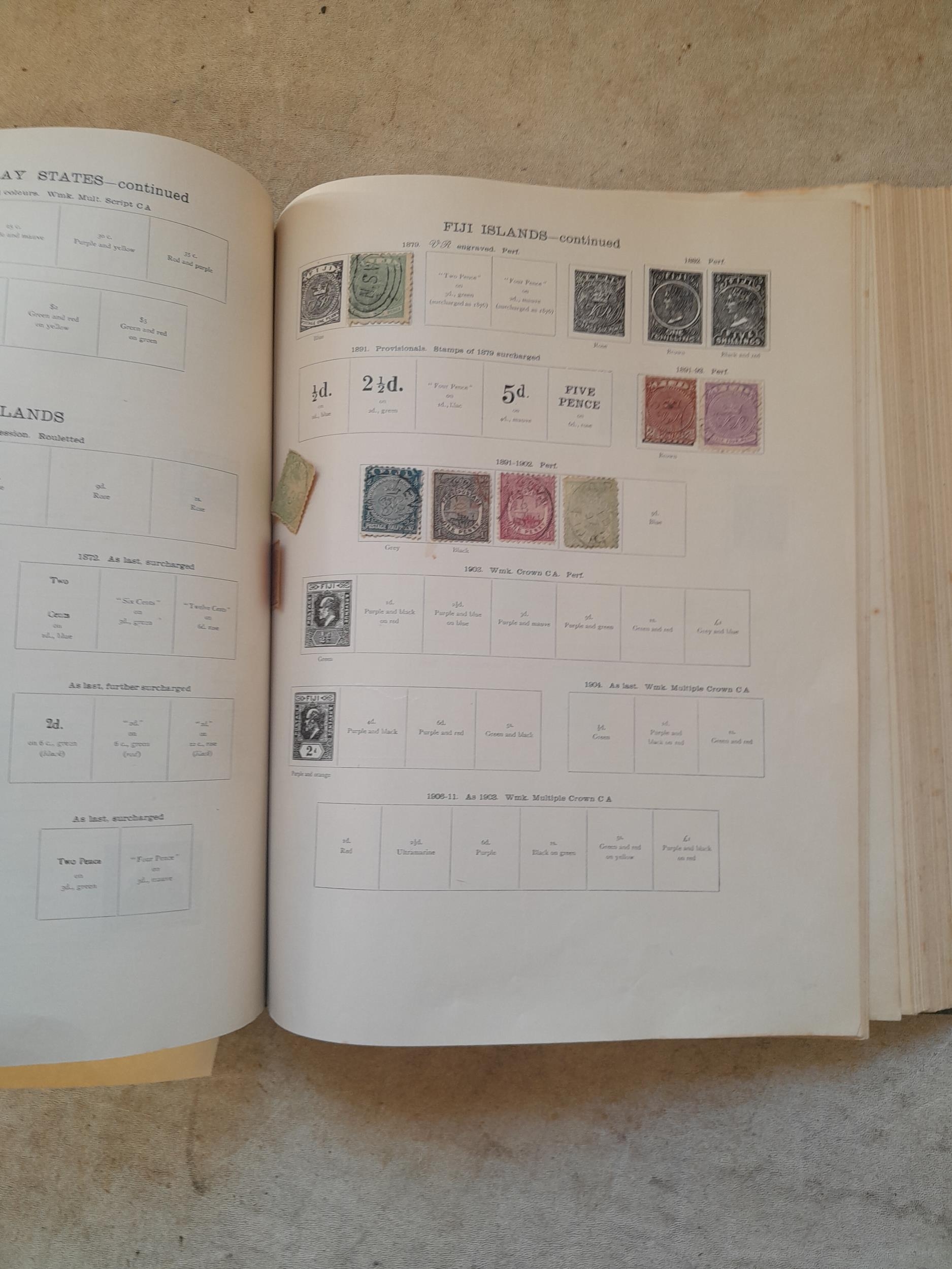 A sparsely filled Ideal Commonwealth Album. an interesting album with earlier stamps sadly let down by poor presentation and condition with some loose stamps and pages : Early Canada SG 39 & SG 60 12 1/2 C blue with faults, Cape of Good Hope Triangle with faults, interesting Fiji and Alwar, GB SG 183 with faults, trimmed and corner damage, QV 10 Shilling with Guernsey postmark , GB reds and blues, part Jubilee set, Edward VII and Seahorse