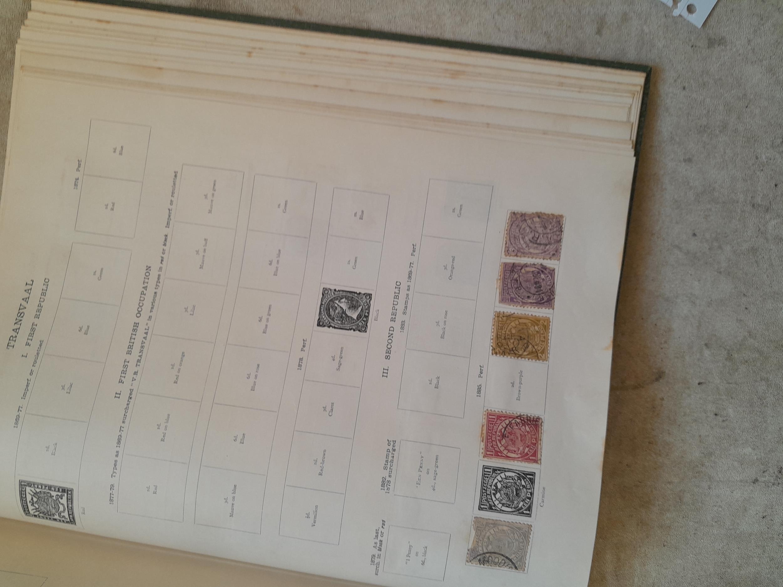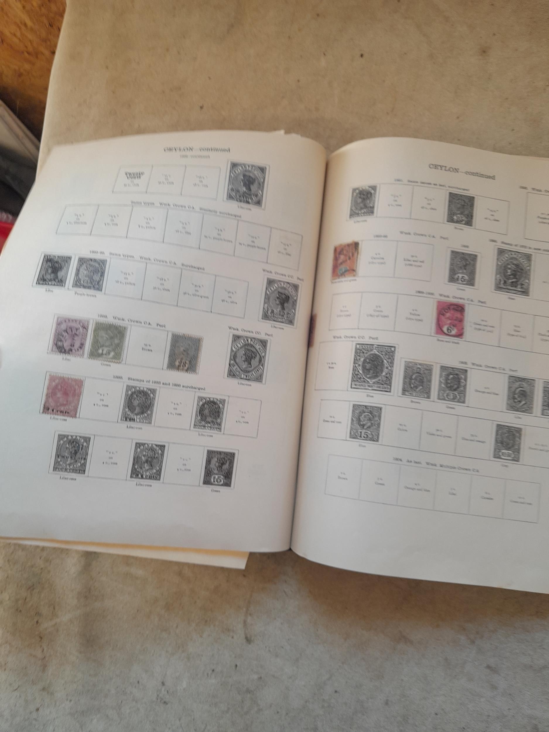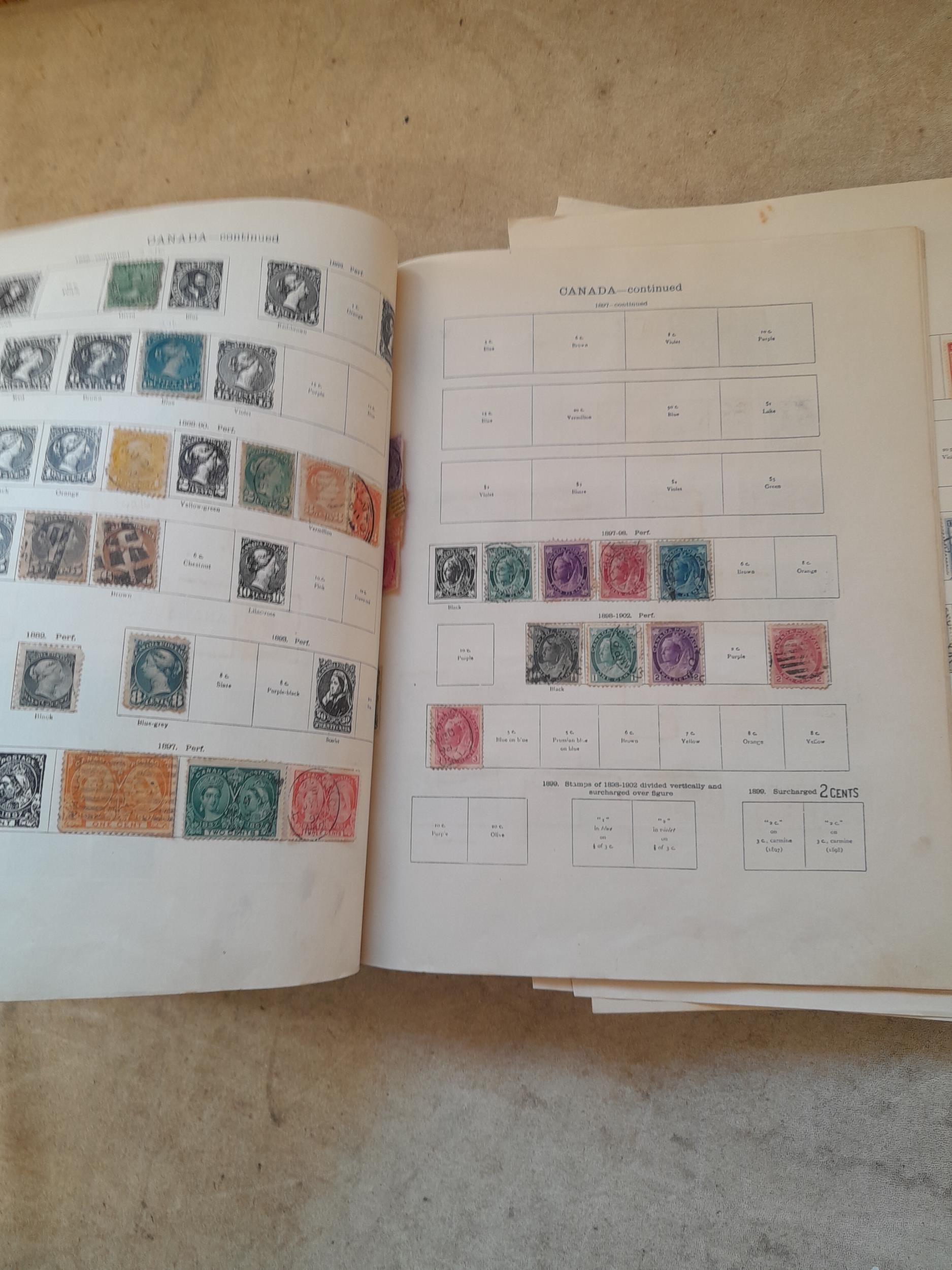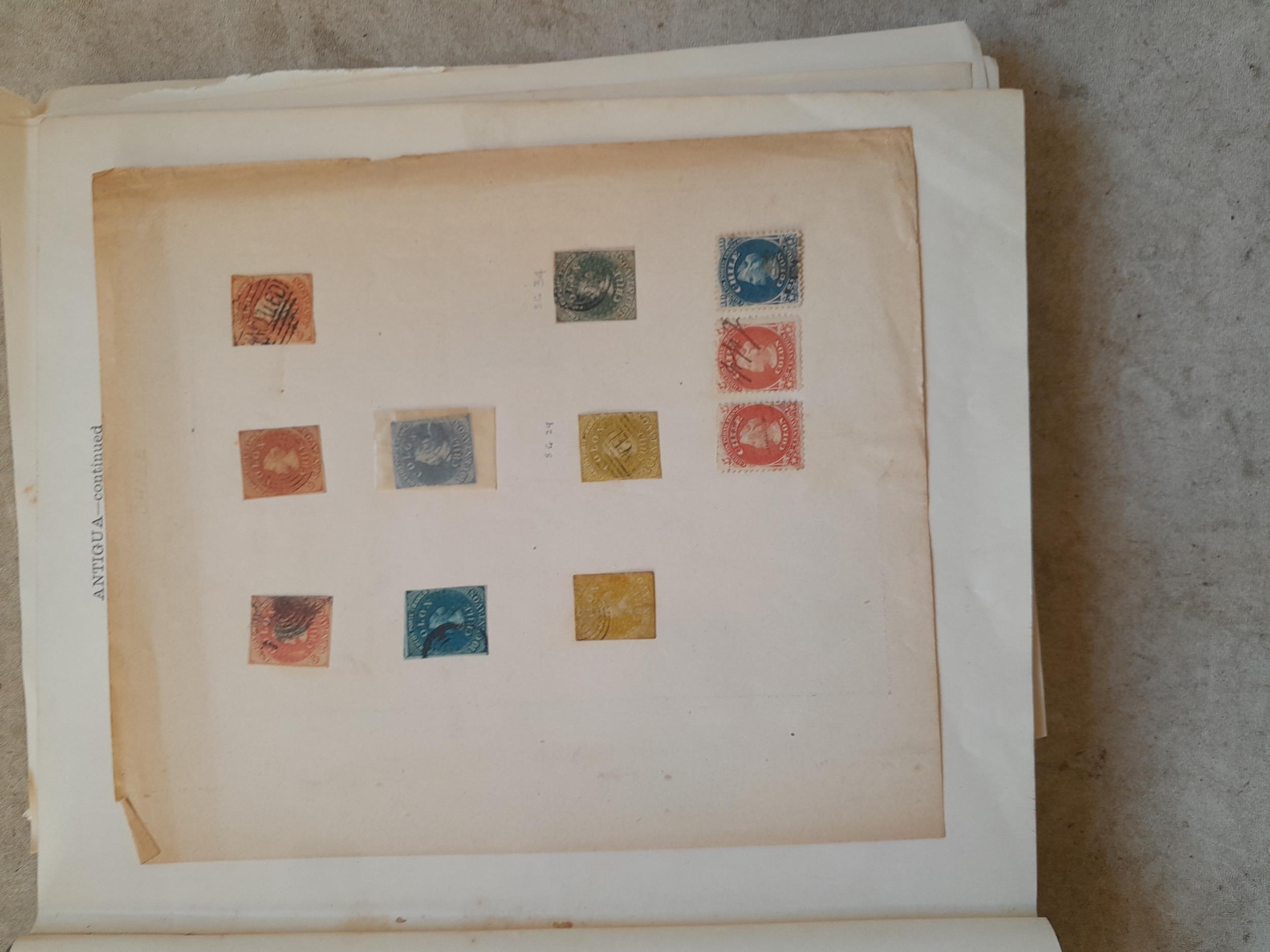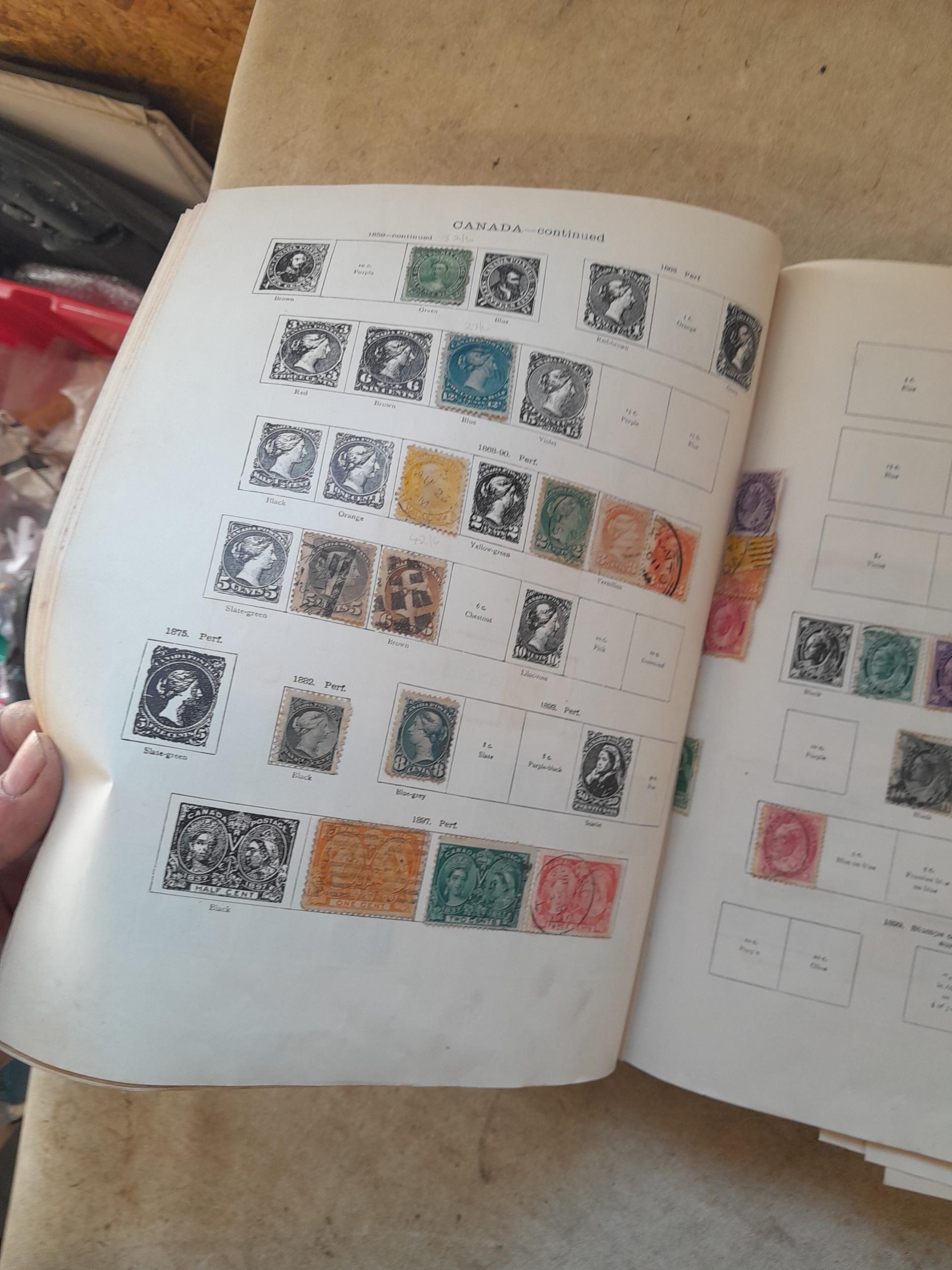 A sparsely filled Ideal Commonwealth Album. an interesting album with earlier stamps sadly let down by poor presentation and condition with some loose stamps and pages : Early Canada SG 39 & SG 60 12 1/2 C blue with faults, Cape of Good Hope Triangle with faults, interesting Fiji and Alwar, GB SG 183 with faults, trimmed and corner damage, QV 10 Shilling with Guernsey postmark , GB reds and blues, part Jubilee set, Edward VII and Seahorse