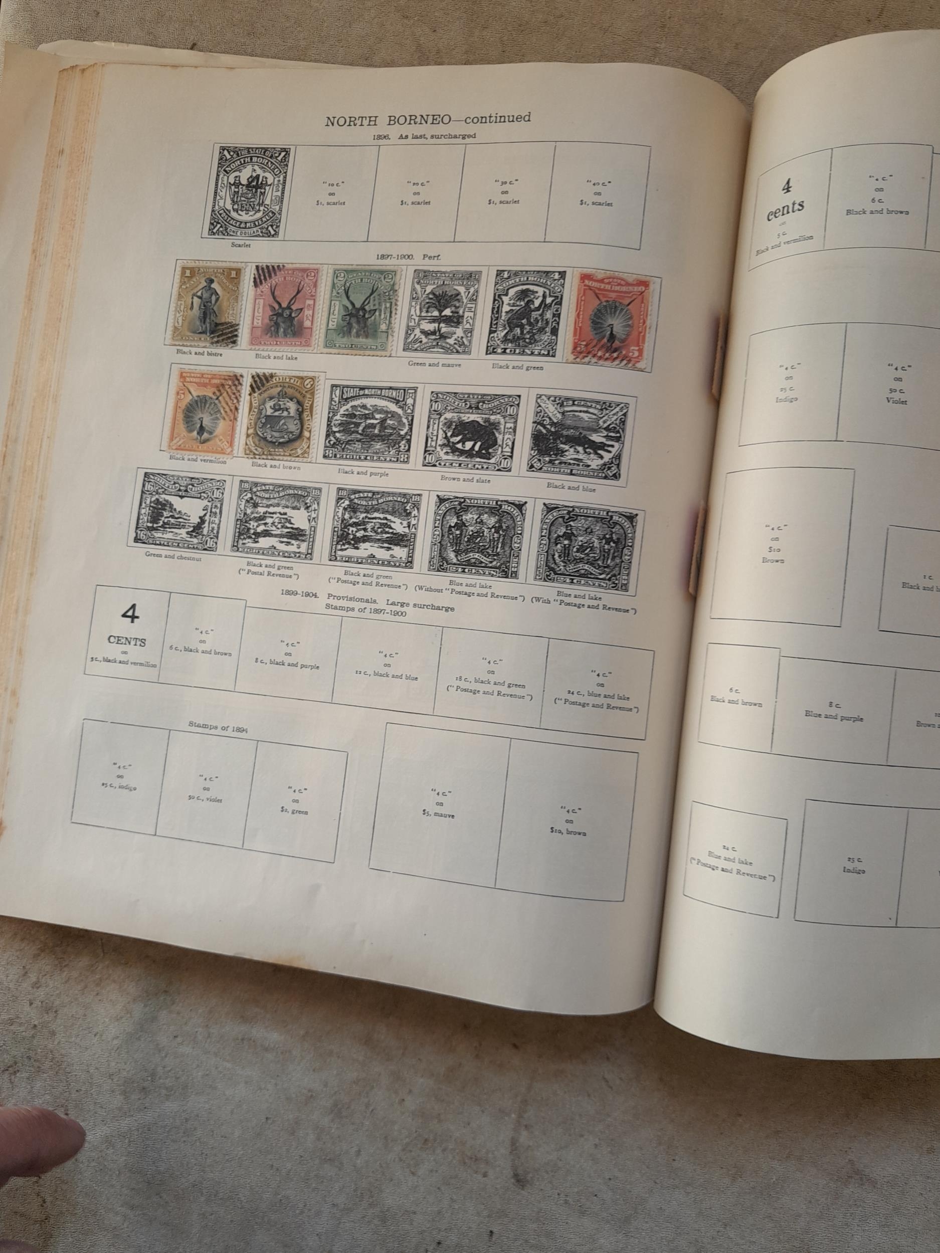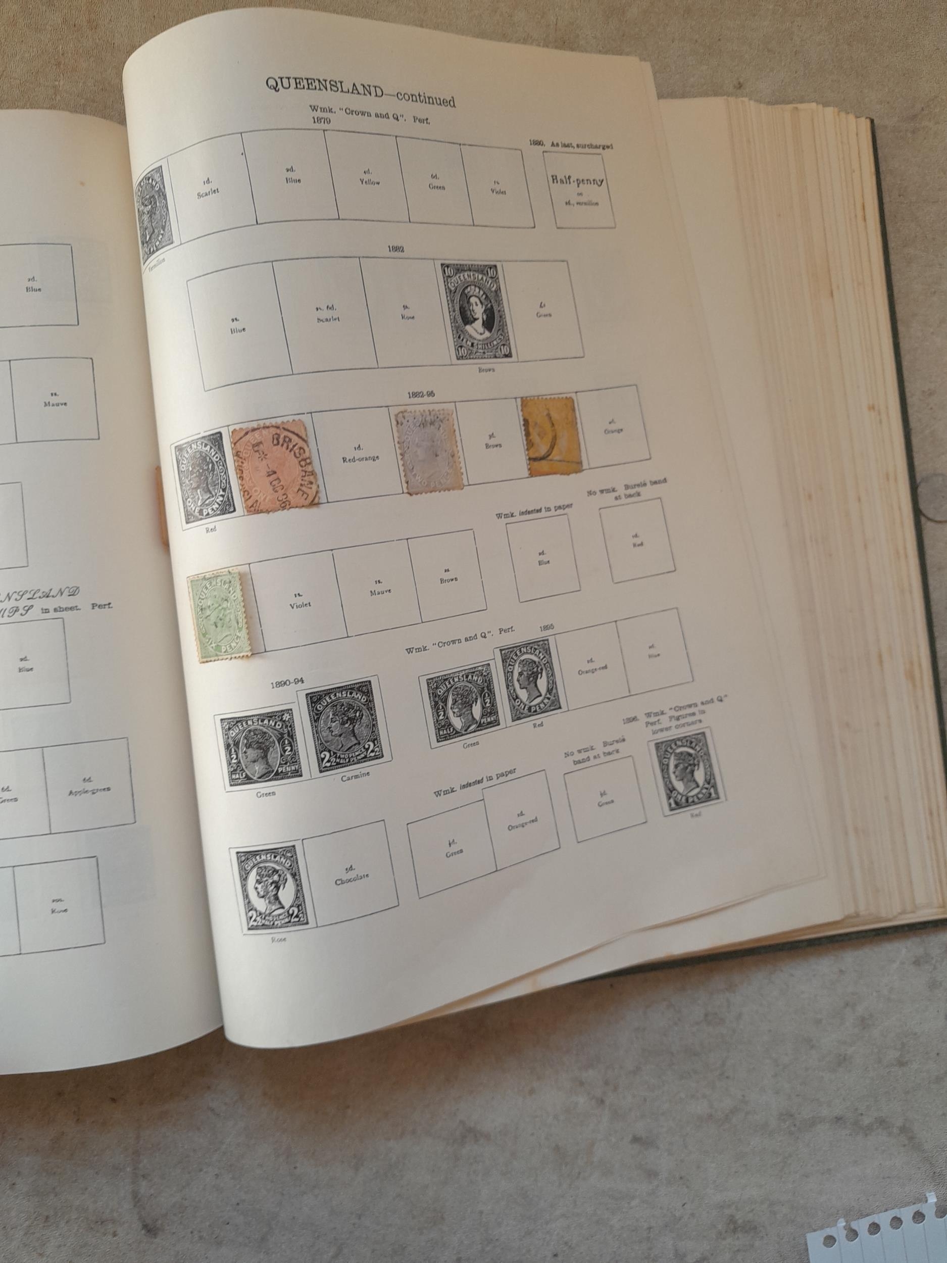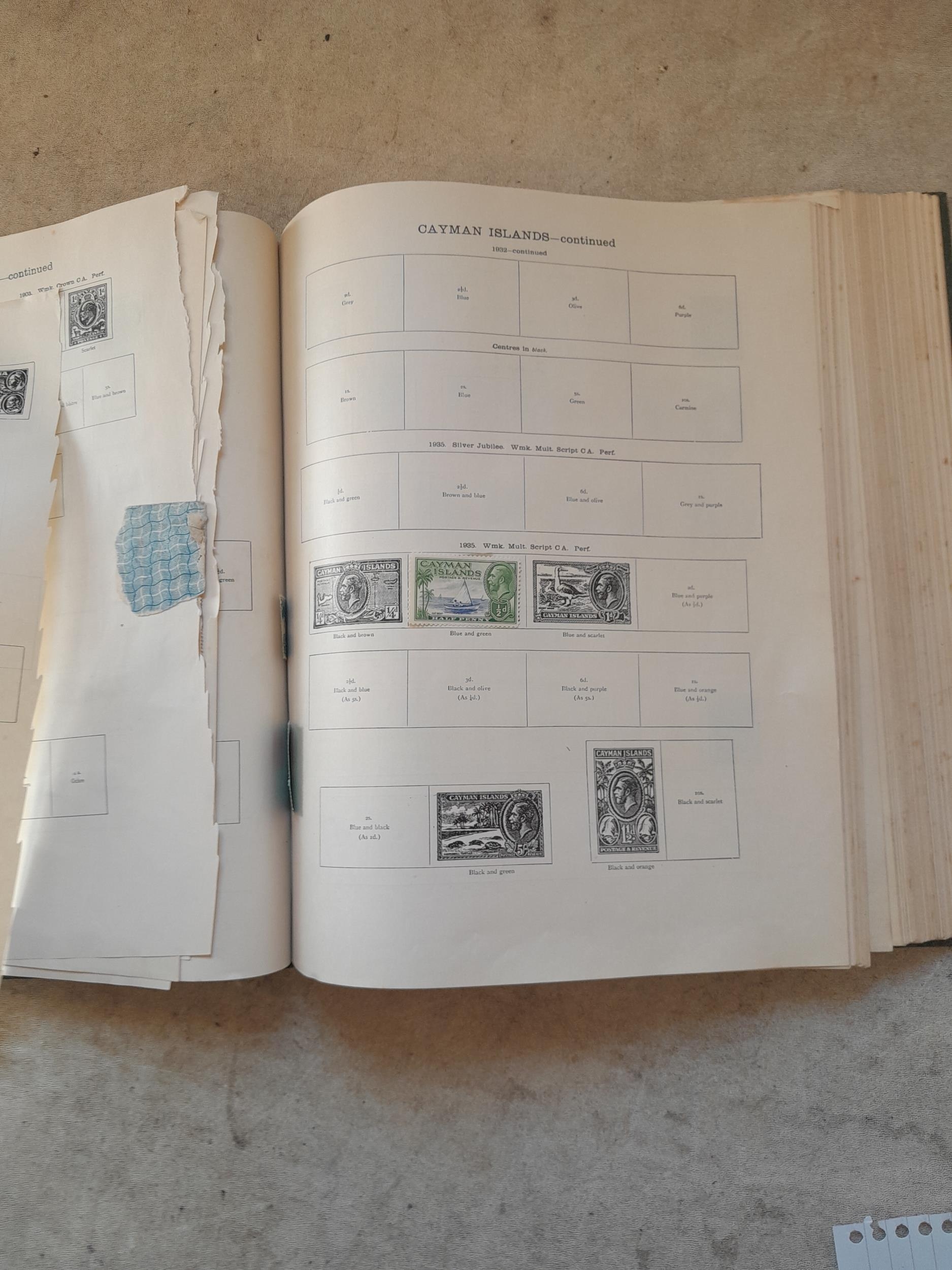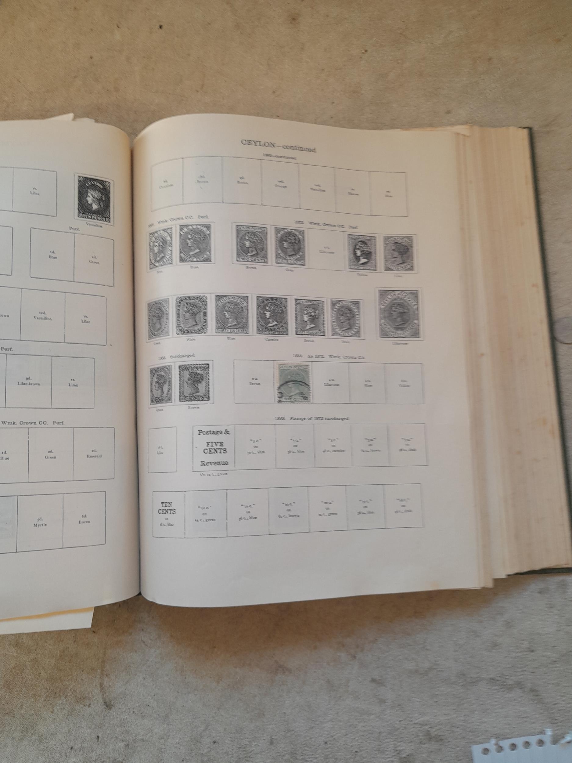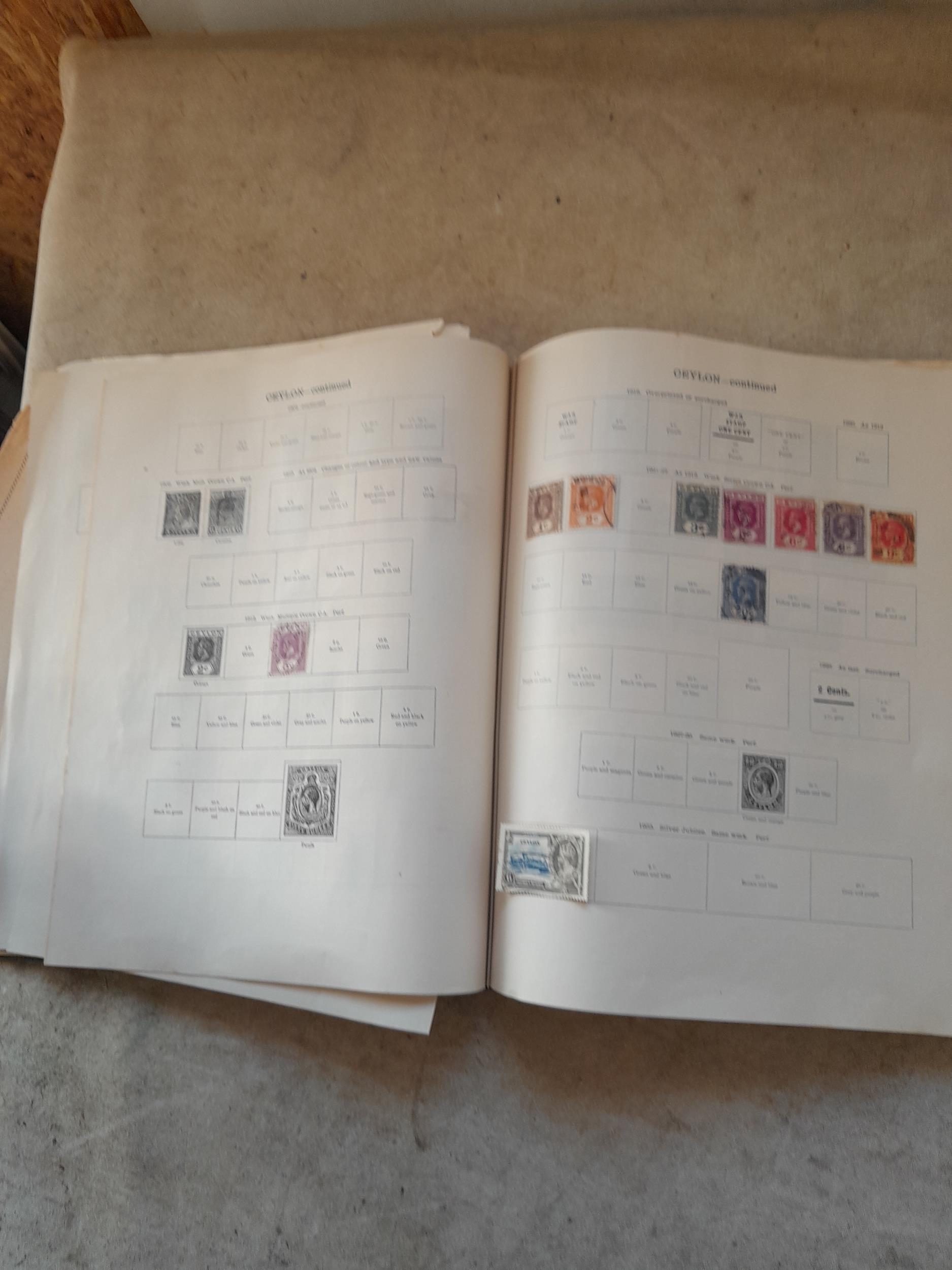 A sparsely filled Ideal Commonwealth Album. an interesting album with earlier stamps sadly let down by poor presentation and condition with some loose stamps and pages : Early Canada SG 39 & SG 60 12 1/2 C blue with faults, Cape of Good Hope Triangle with faults, interesting Fiji and Alwar, GB SG 183 with faults, trimmed and corner damage, QV 10 Shilling with Guernsey postmark , GB reds and blues, part Jubilee set, Edward VII and Seahorse