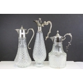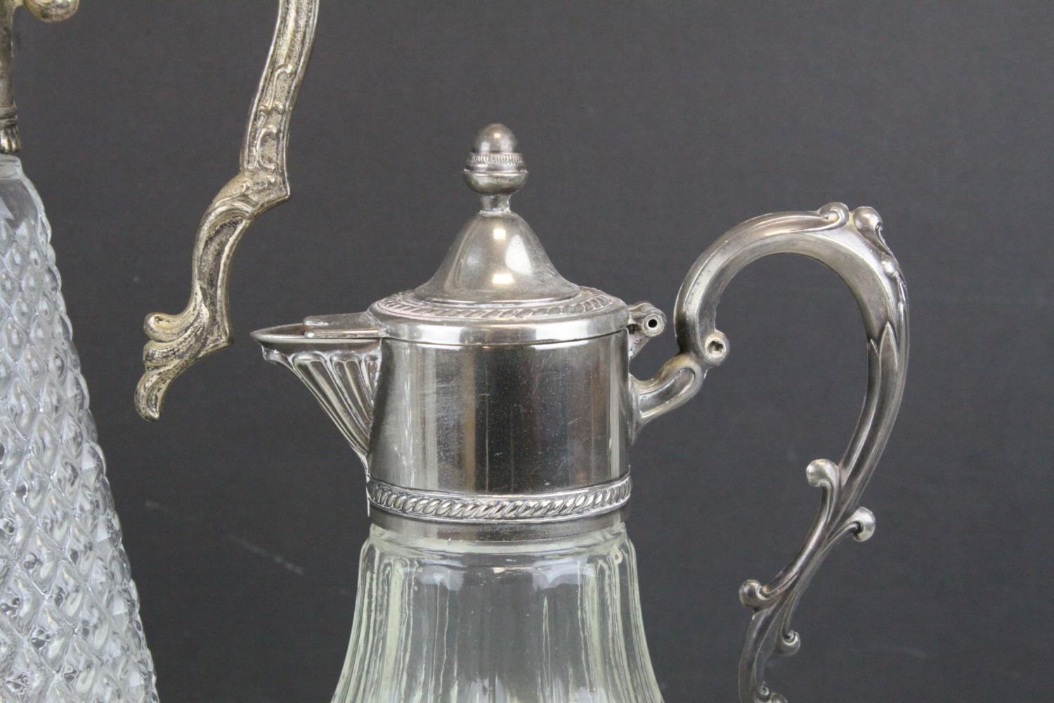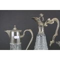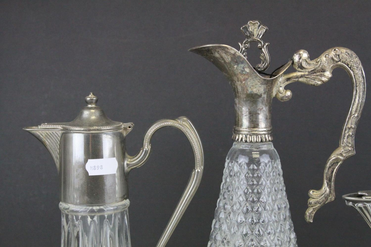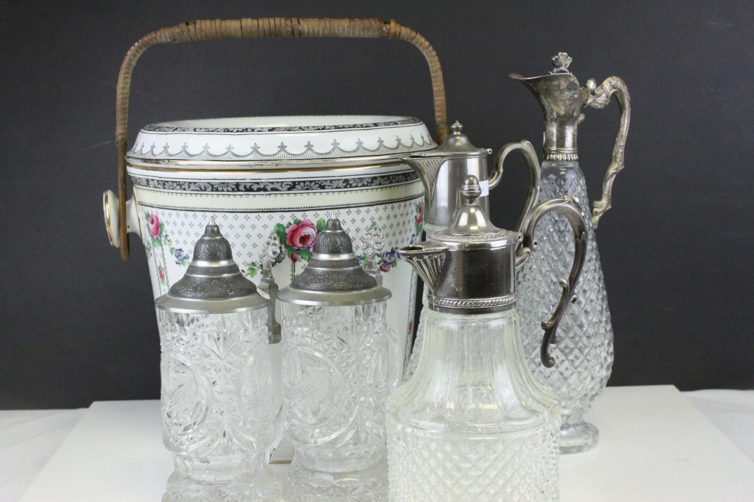 Three Glass and Silver Plate Claret Jugs, Two Glass Beer Steins with Pewter Legs and a Ceramic Slop Bucket