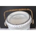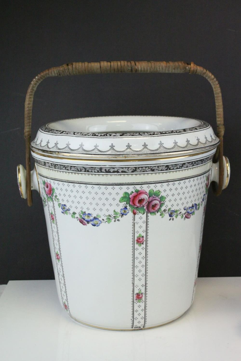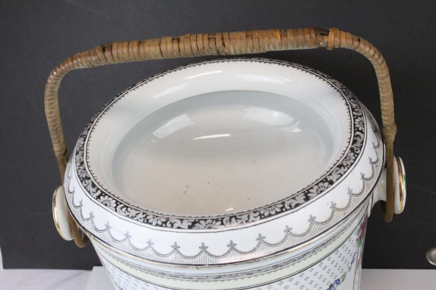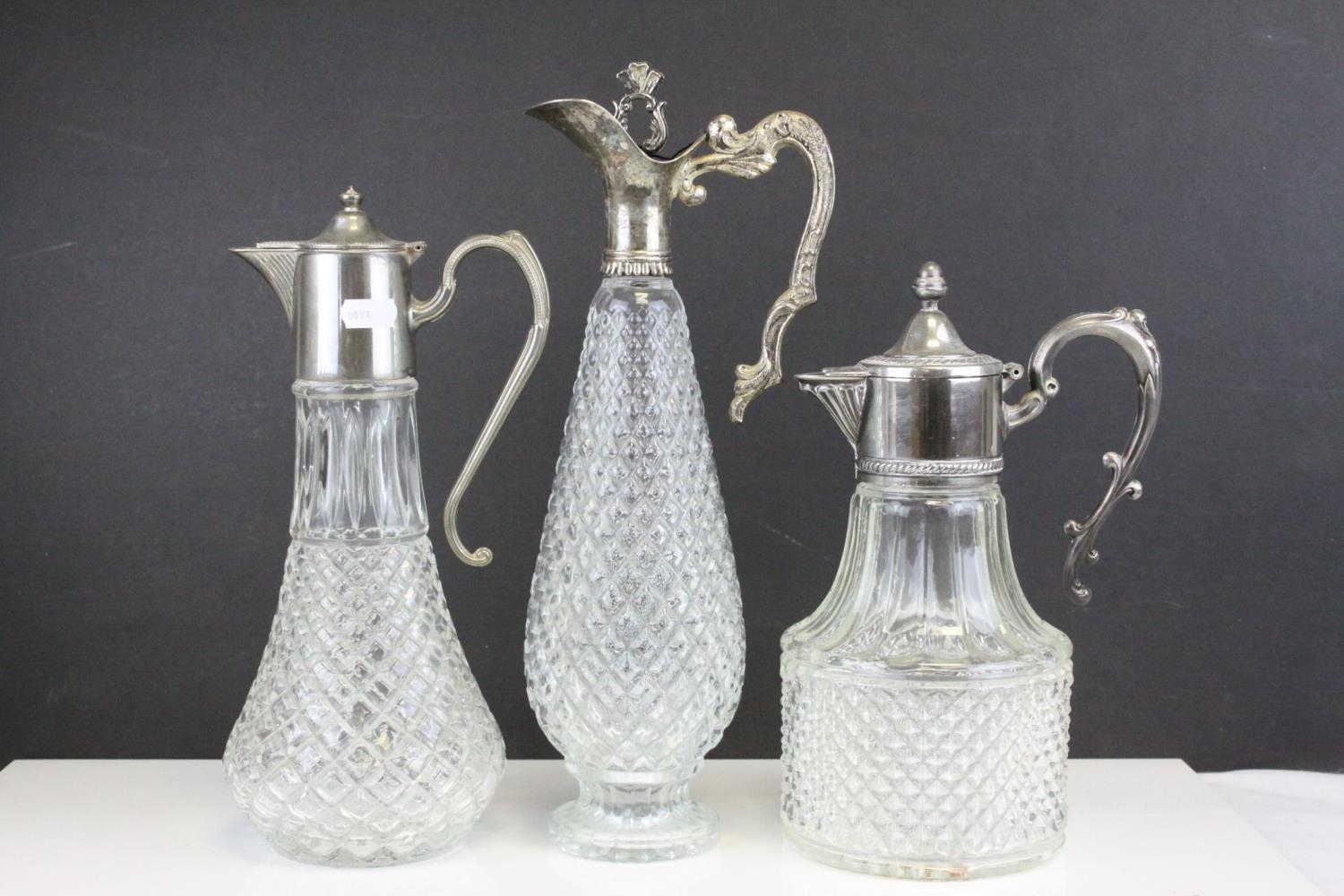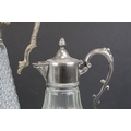 Three Glass and Silver Plate Claret Jugs, Two Glass Beer Steins with Pewter Legs and a Ceramic Slop Bucket