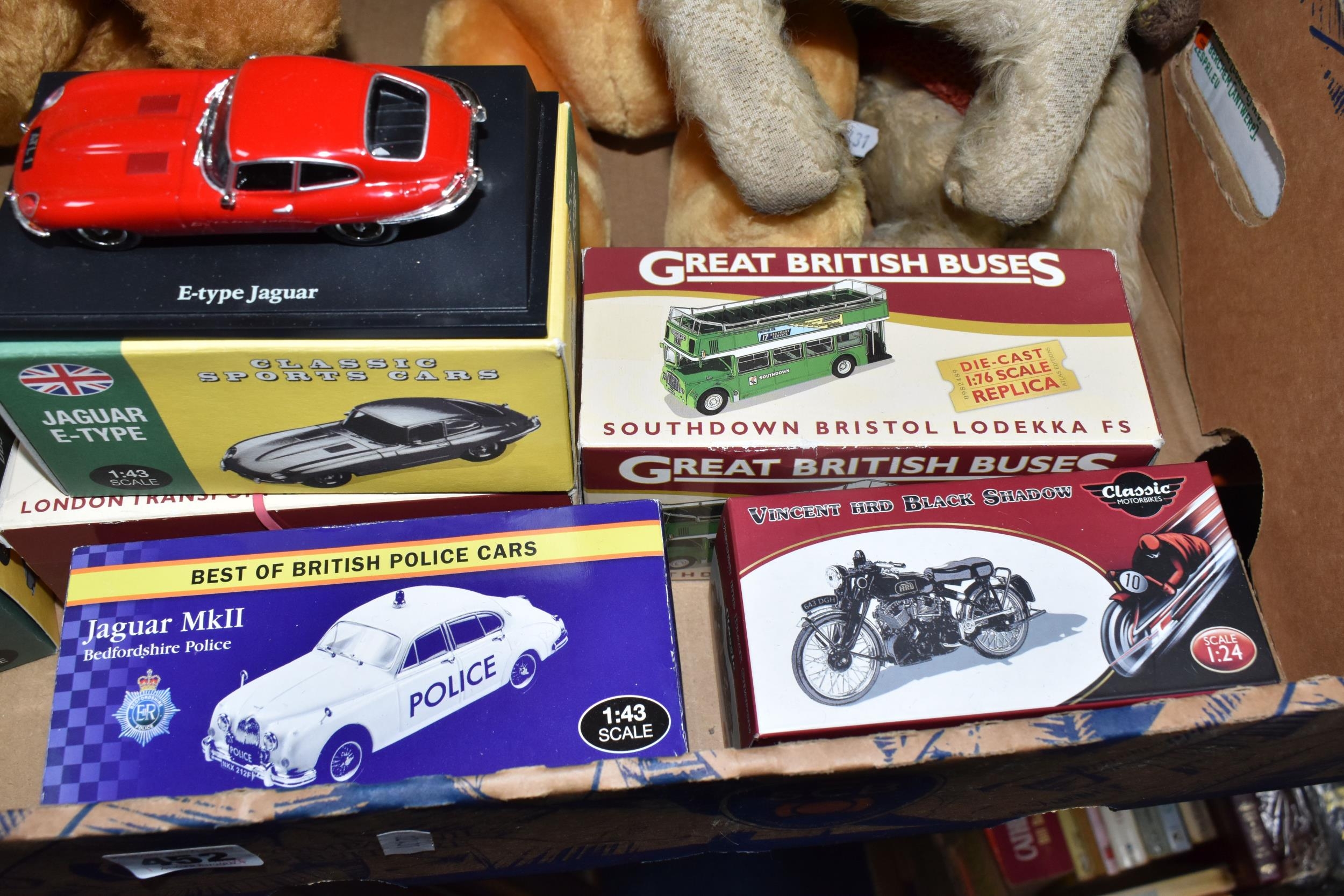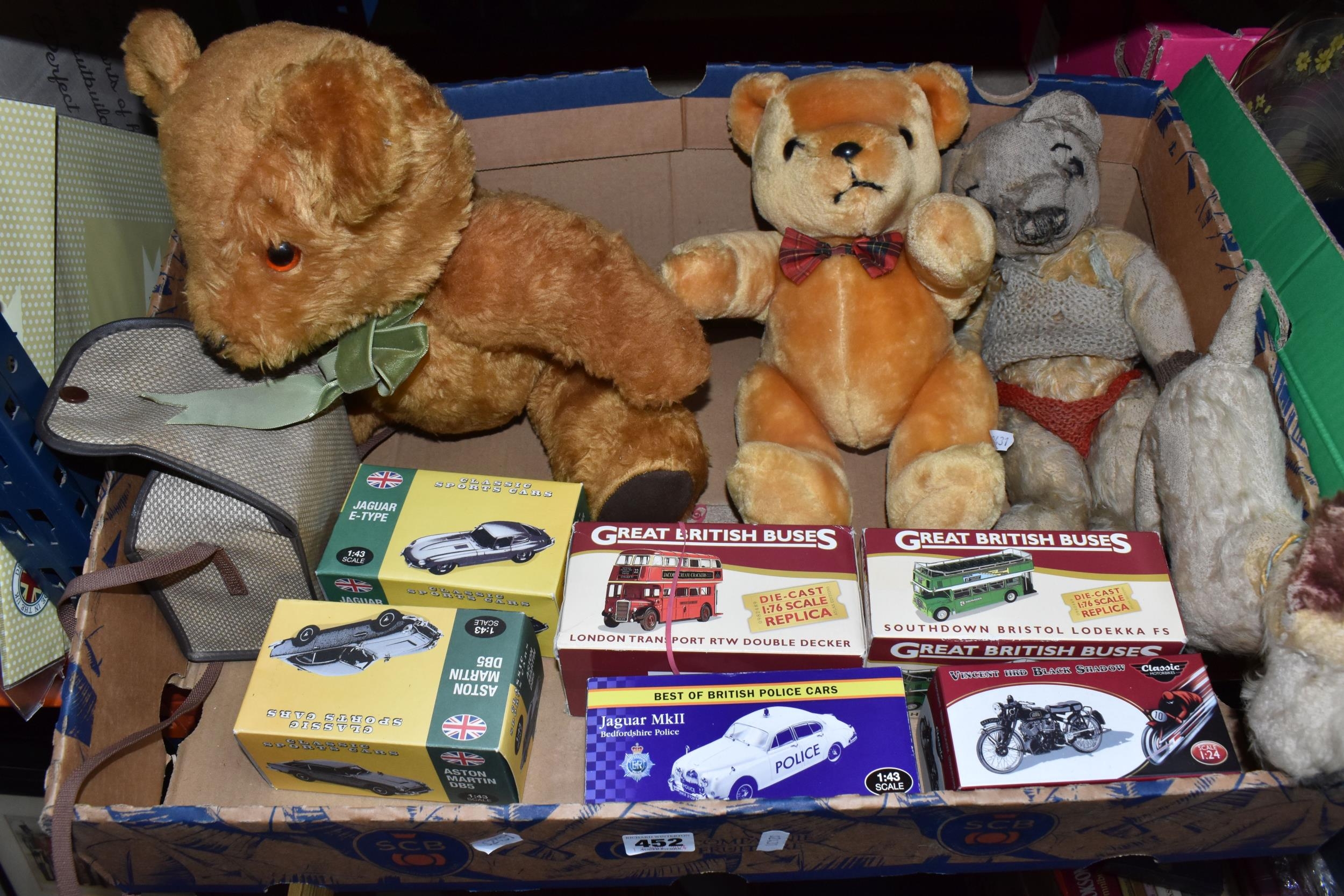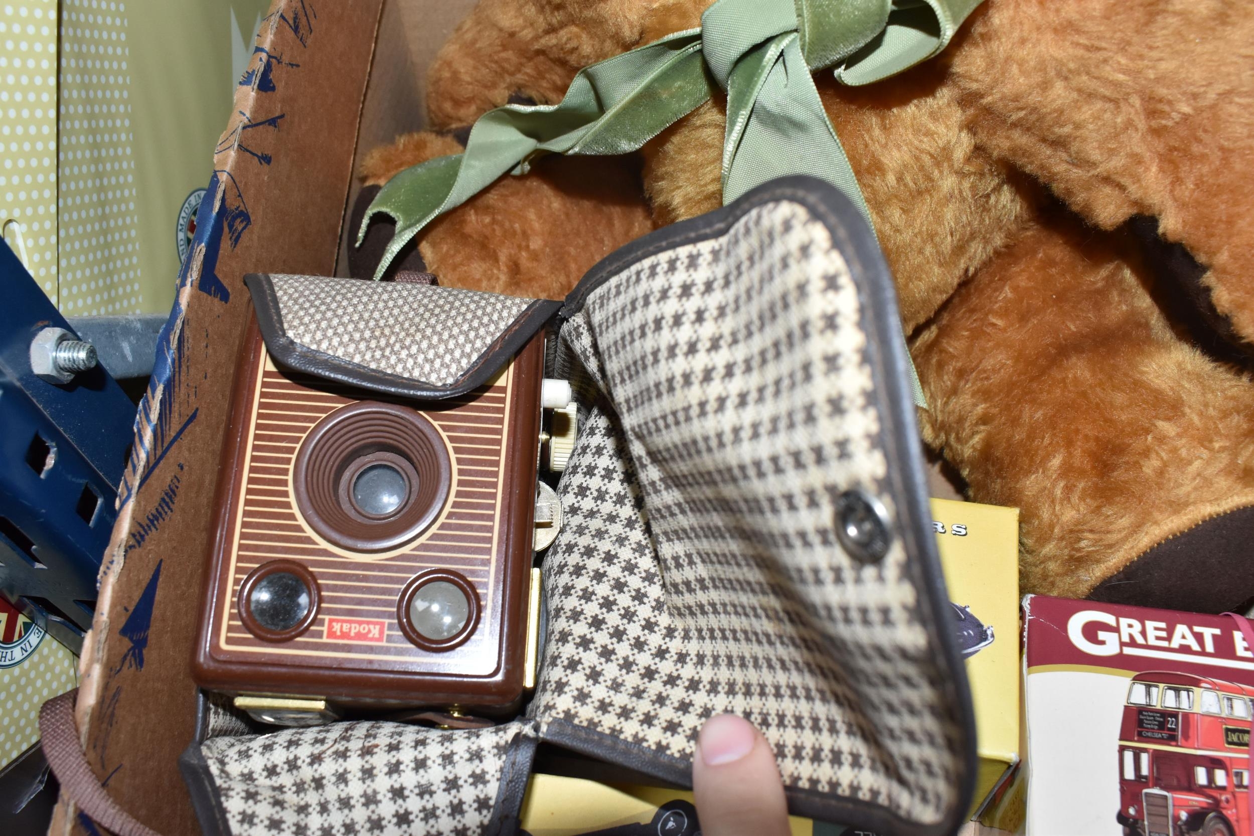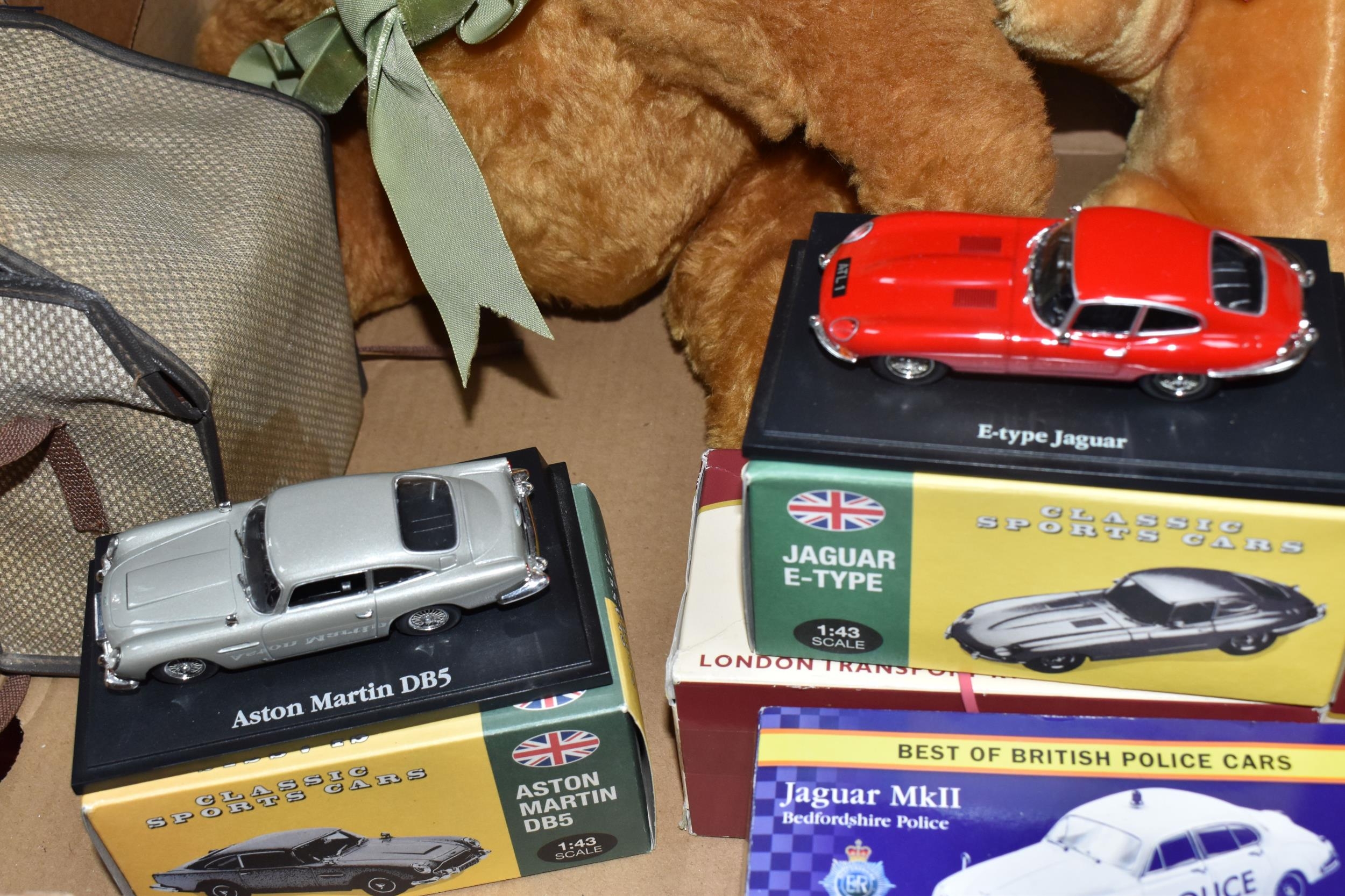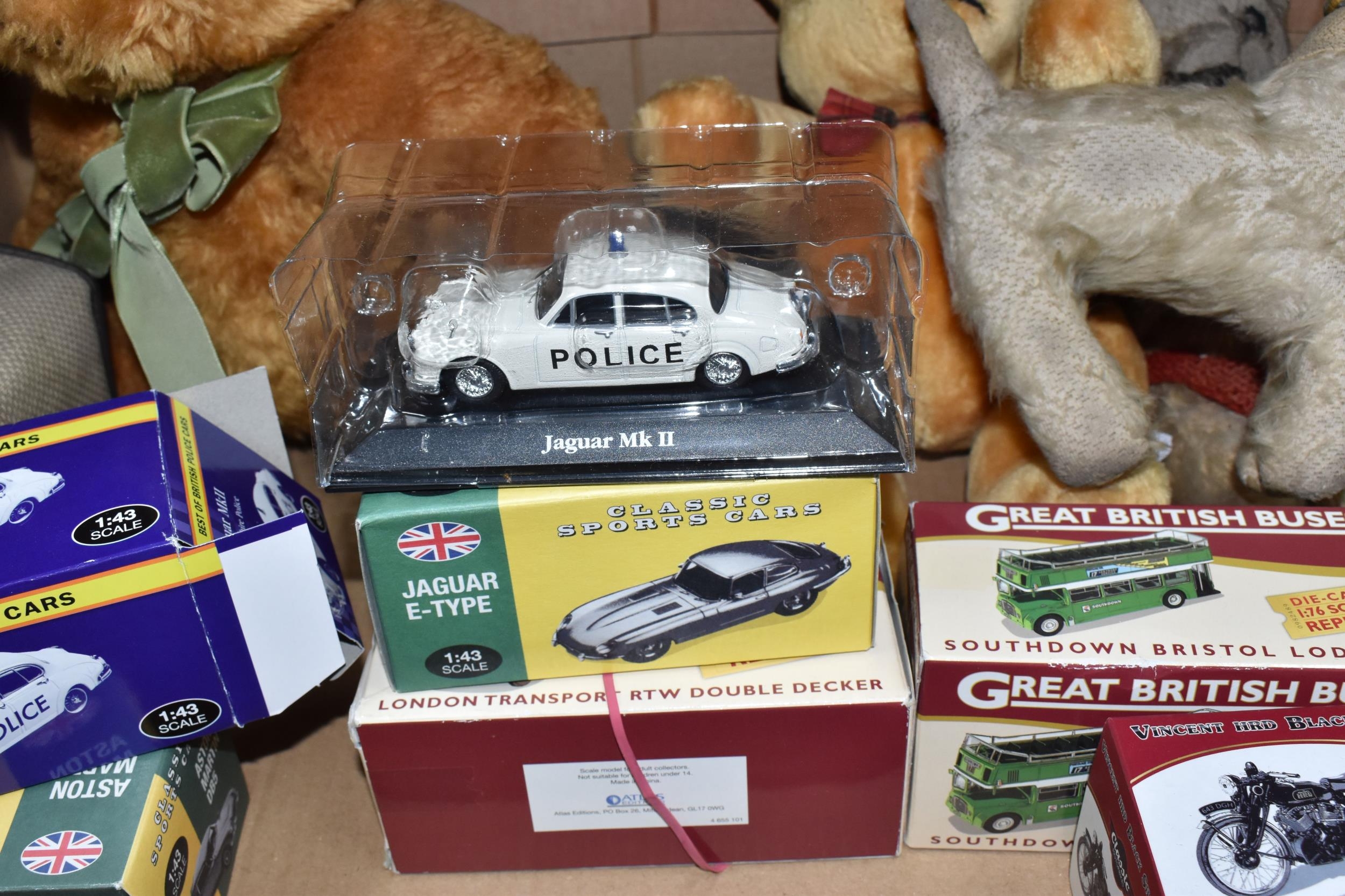 A QUANTITY OF MISCELLANEOUS TOYS, to include distressed vintage golden plush teddy bear, vintage soft toy dog, modern bears and assorted boxed Atlas Editions diecast vehicles, including models from the 'Classic Sports Cars' and 'Great British Buses' collections, cased Kodak Brownie Flash IV camera