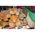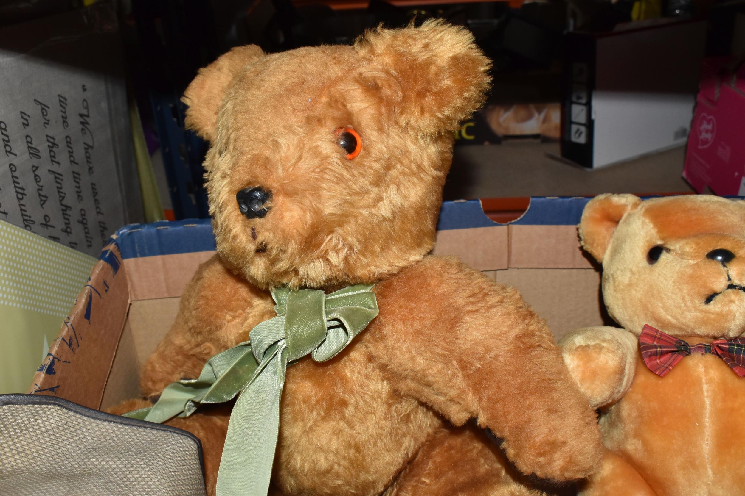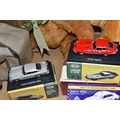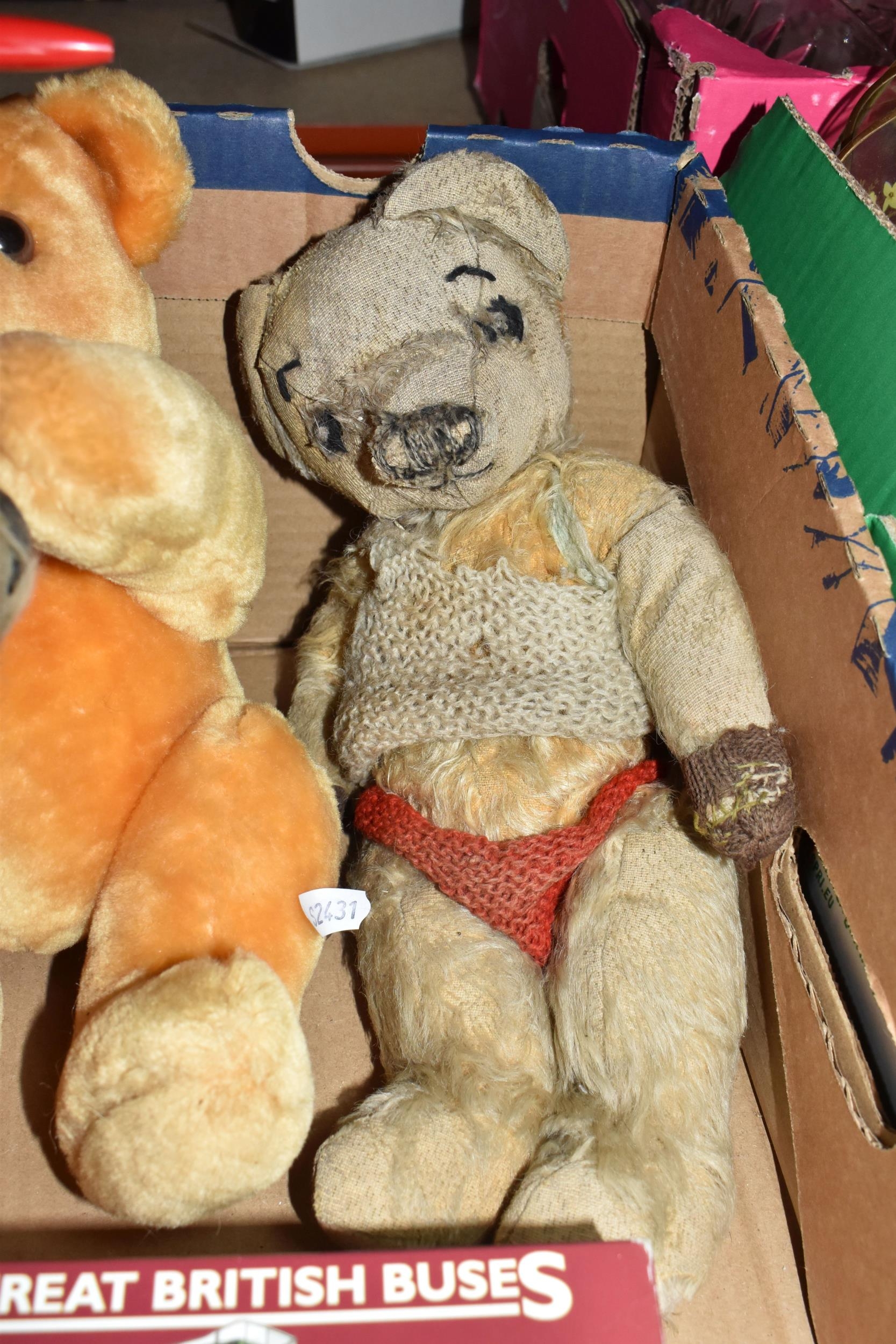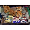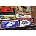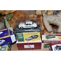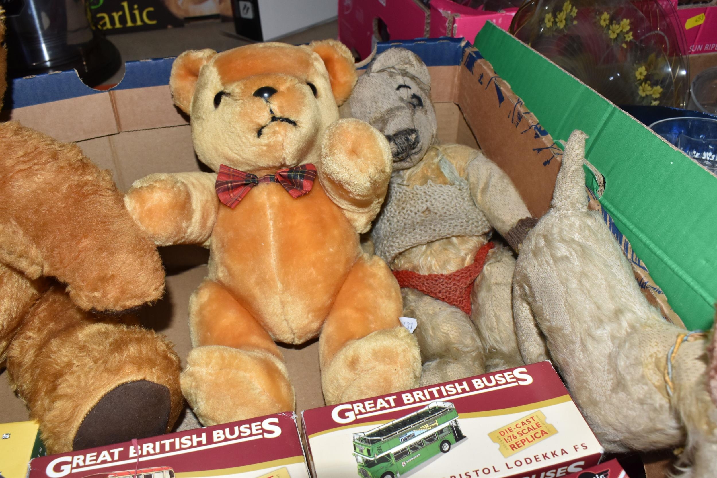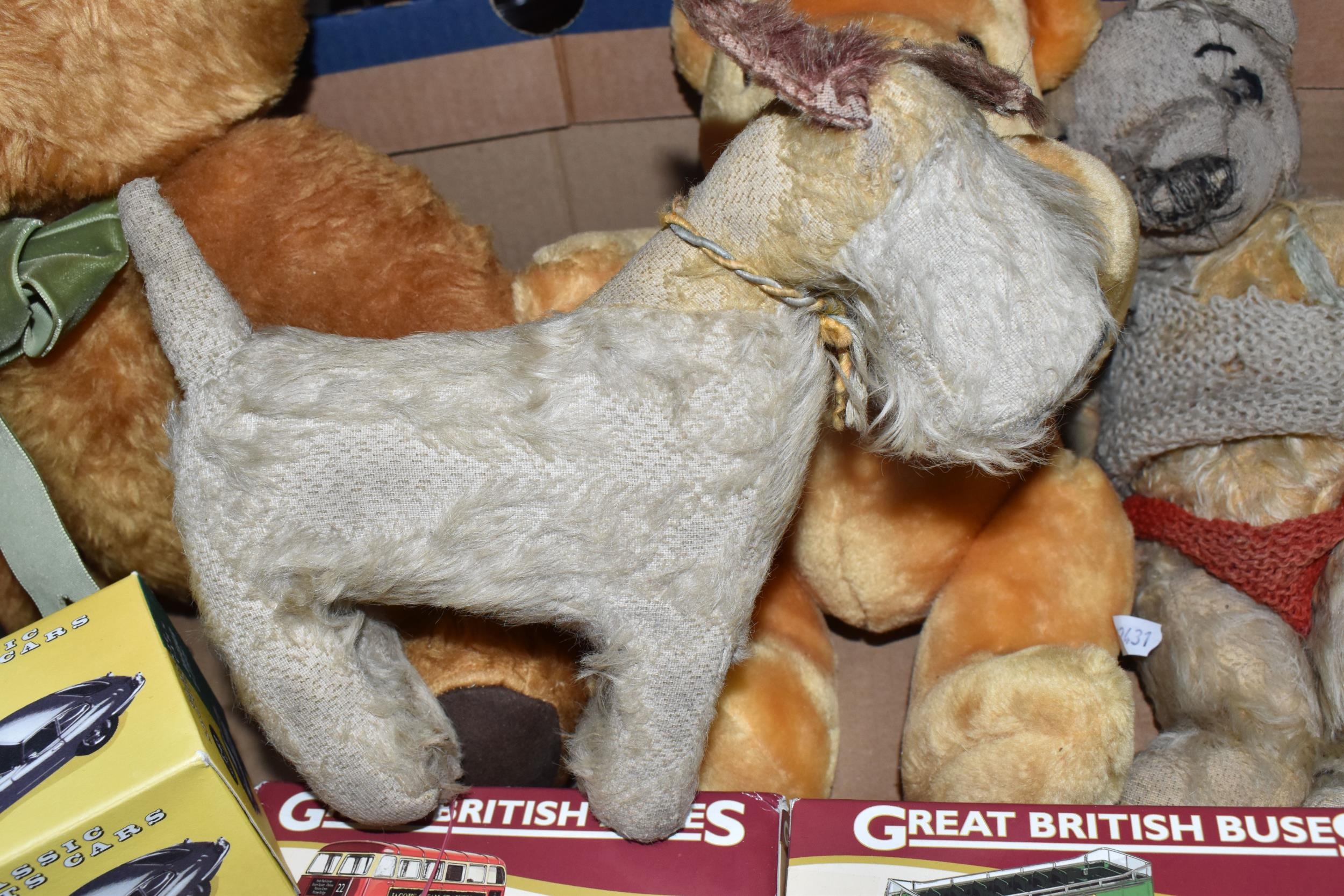 A QUANTITY OF MISCELLANEOUS TOYS, to include distressed vintage golden plush teddy bear, vintage soft toy dog, modern bears and assorted boxed Atlas Editions diecast vehicles, including models from the 'Classic Sports Cars' and 'Great British Buses' collections, cased Kodak Brownie Flash IV camera