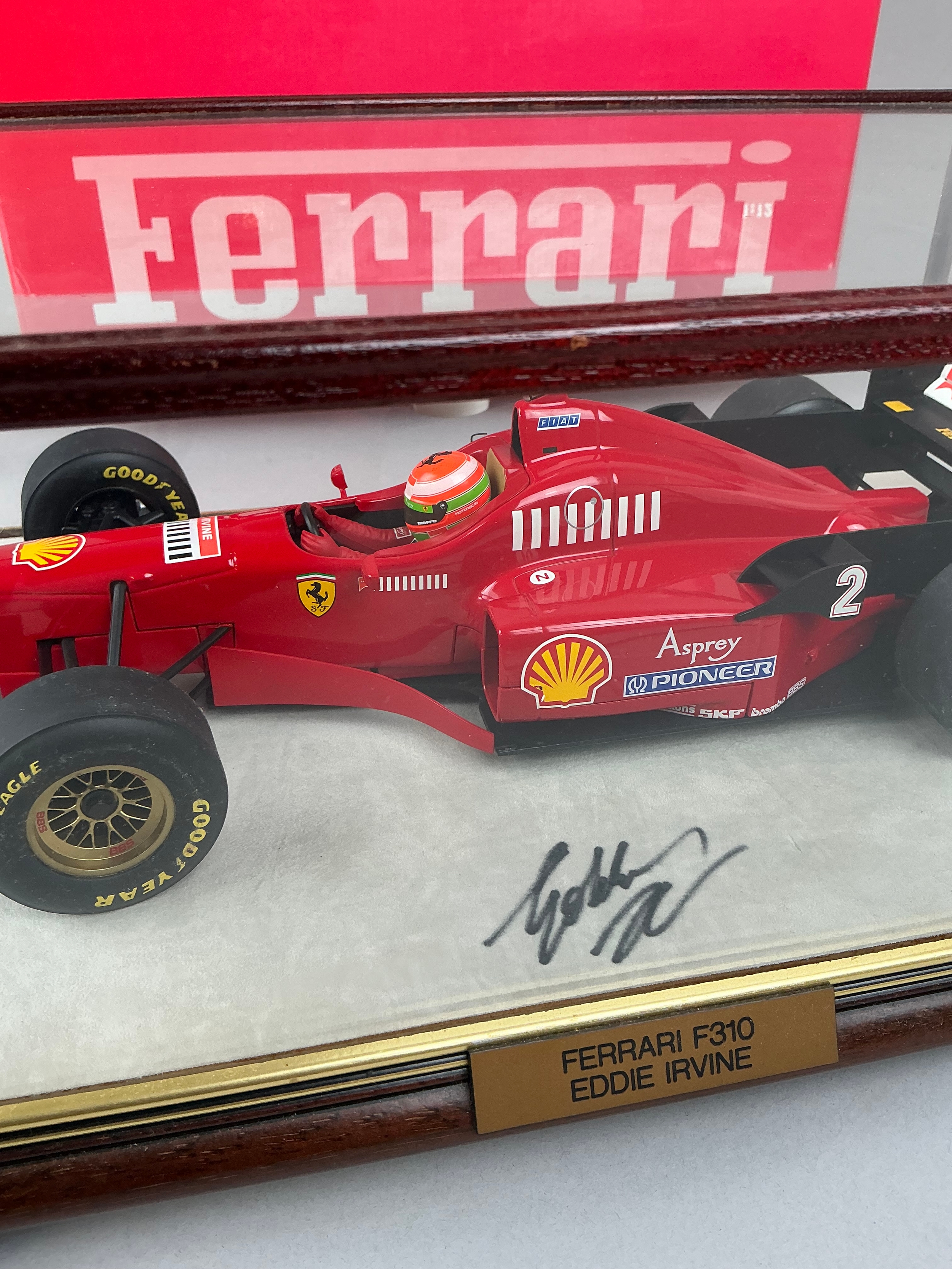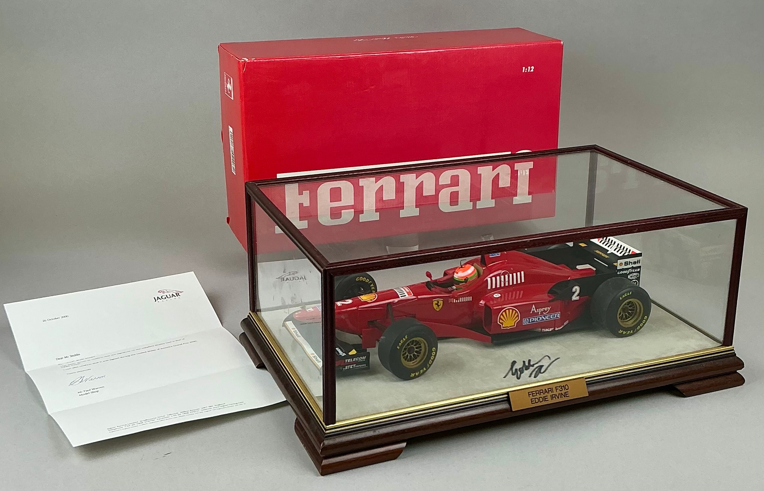 Formula 1 - a well displayed Paul's Model Art 1/12 scale Ferrari F310 Eddie Irvine F1 racing car, in a Eddie Irvine autographed case, with accompanying Jaguar racing headed letter of authenticity stating the base was signed during the United States Grand Prix 2000, boxed