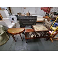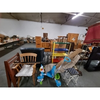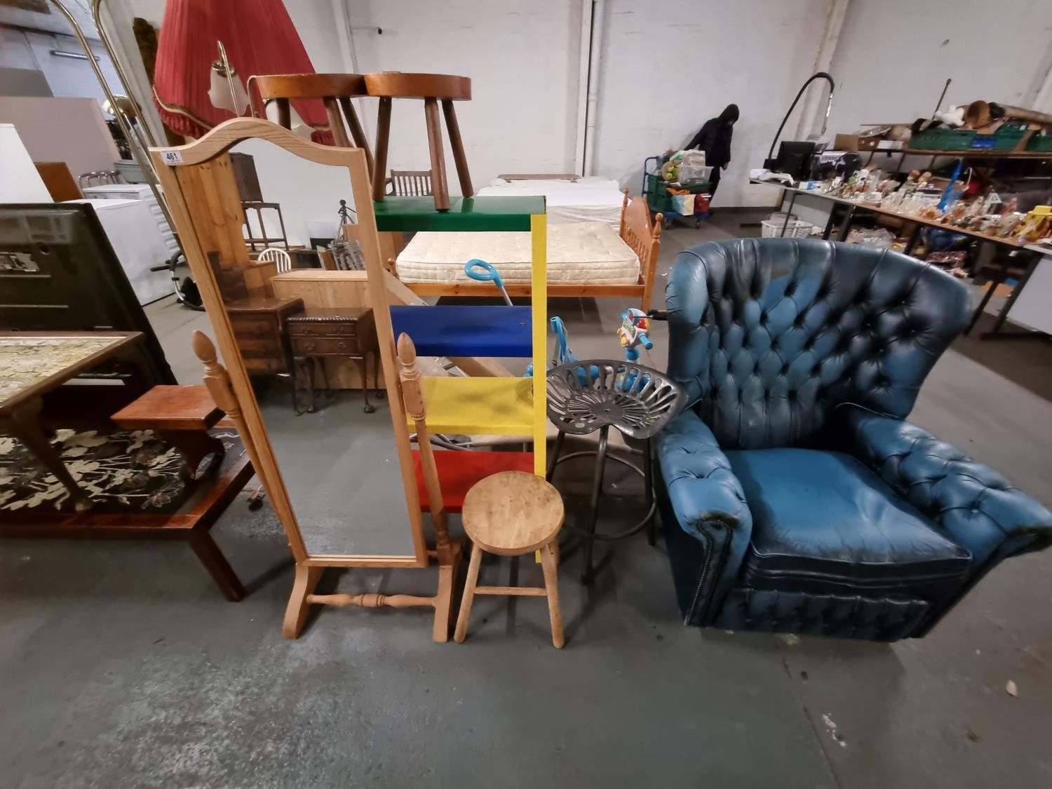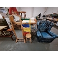 Childs metal shelving, retro stool, leather chesterfield armchair etc