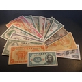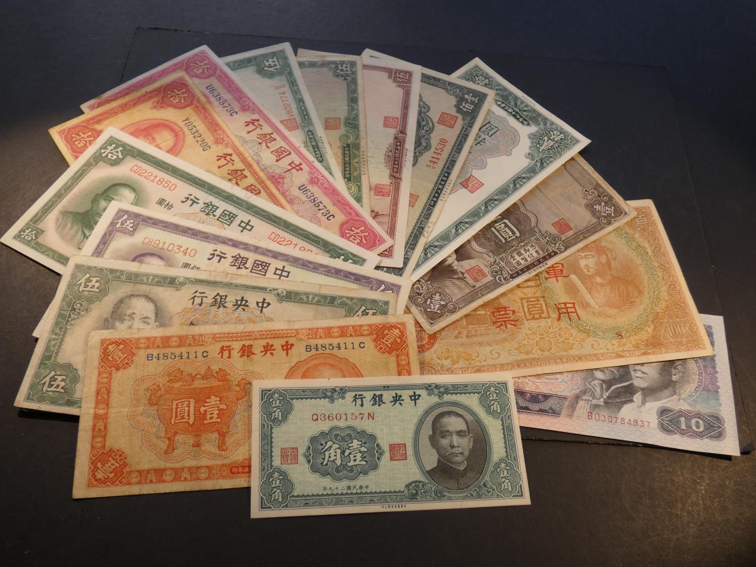 CHINA - REPUBLIC. Bank of China; $5 & $10, 1937, P-80 & P-81, and $10, 1940, P-85 & P-85b. Central Bank of China; 10 Cents, 1940, P-226. $1, 1936, P-211a. $5 [1936 de la Rue printing (P-213a & P-213c), 1936 Waterlow & Son printing (P-216a) & 1941 (P-235)], $100, 1941, P-243a. 20 Customs Gold Units, 1930, P-328, and Farmer’s Bank of China, $1, 1941, P-474, plus Japanese military, WWII Hong Kong issue, 100 Yen, ND(1945), P-M30 and People’s Republic of China, 10 Yuan, 1980, P-887a. Mixed grades and condition, VG to GVF (15)