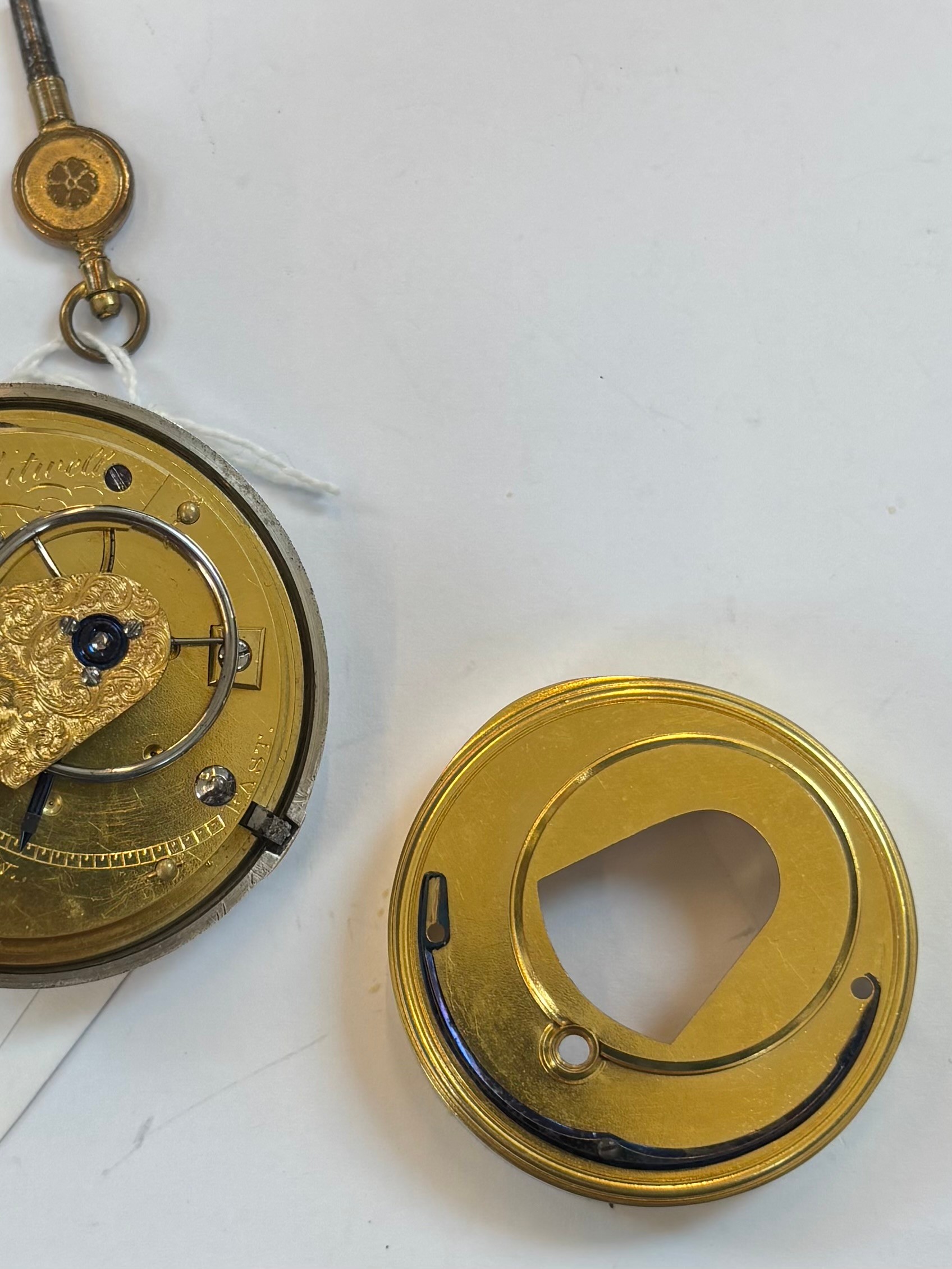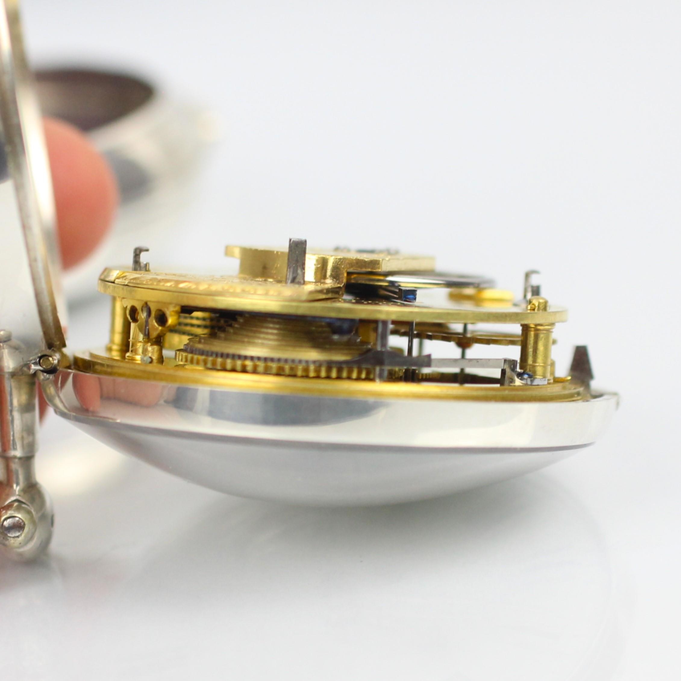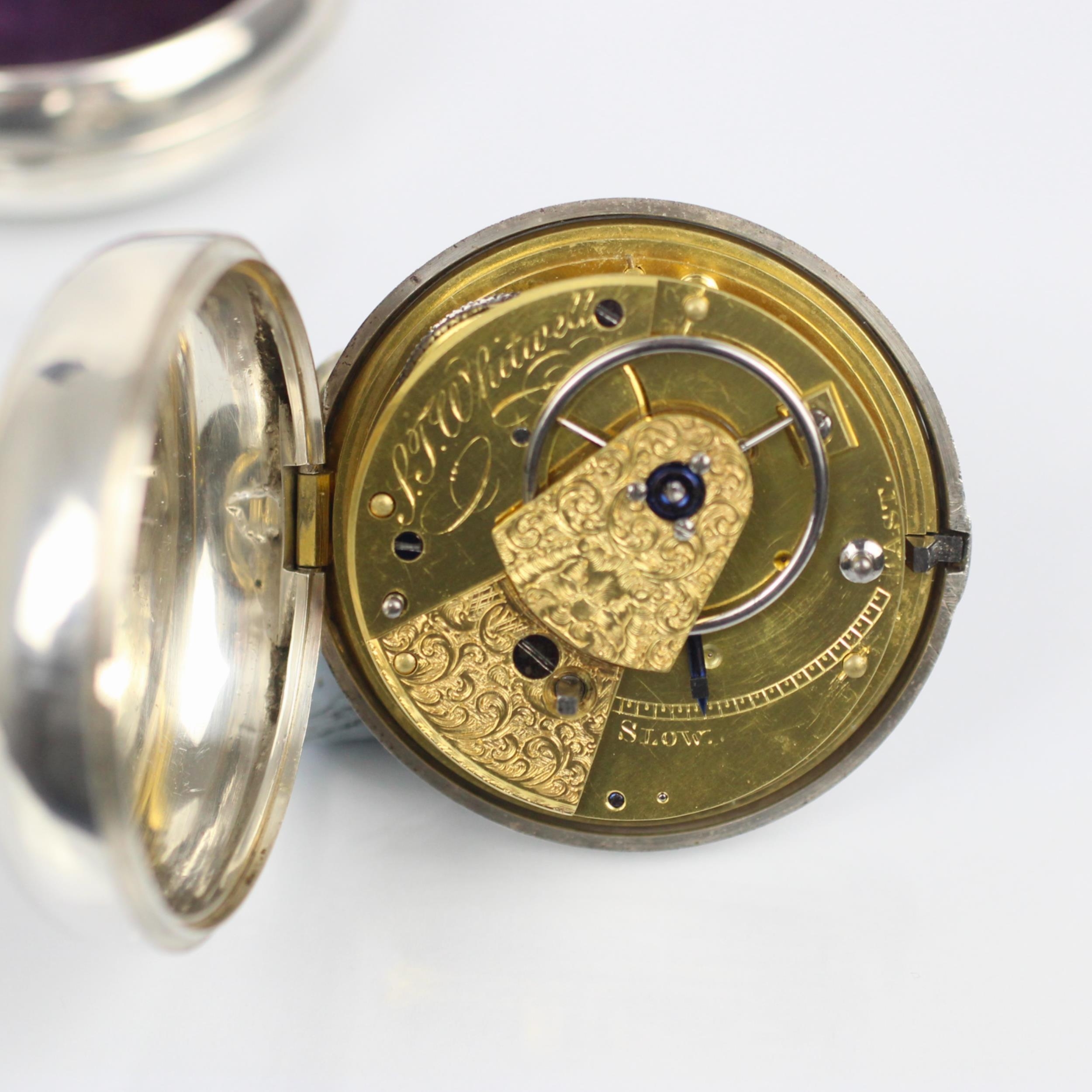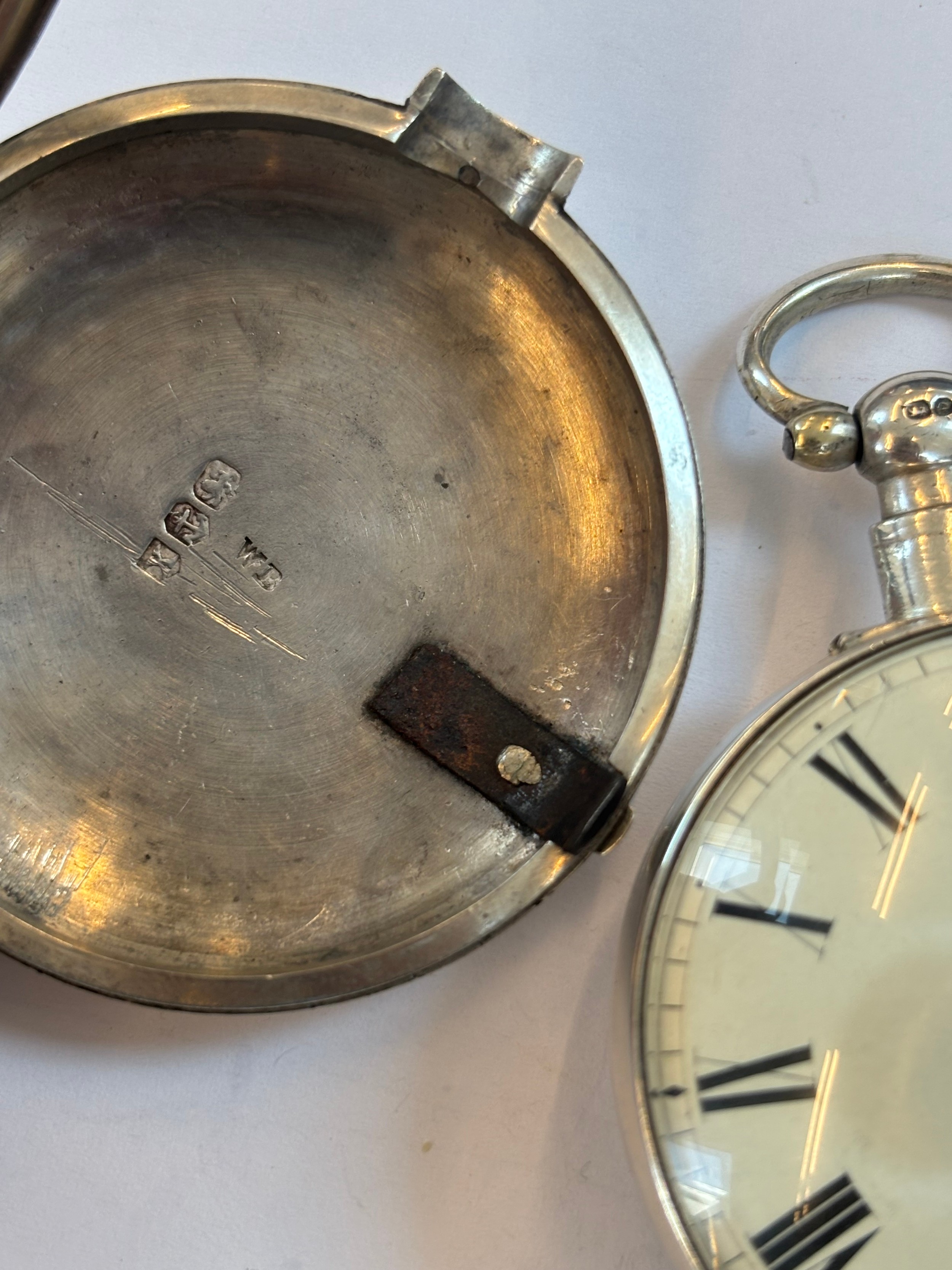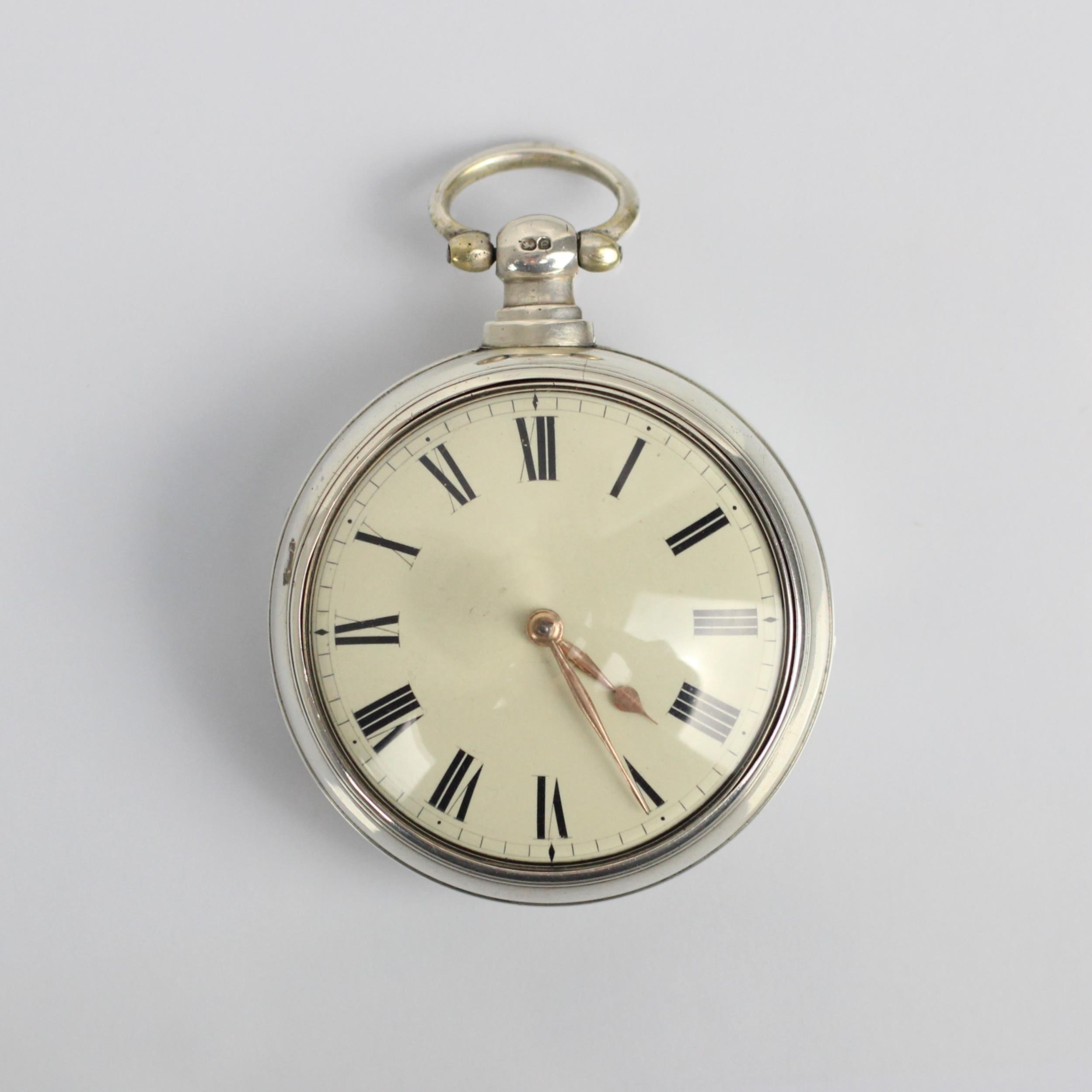 A George IV silver pair cased massey type I pocket watch, the circular white dial with Roman numerals, set to plain polished silver case, stamped to interior of case 'WB' Birmingham 1821, movement stamped 'SJ Whitwell' within silver outer case, 6cm wide, gross weight 172gms (including outer case and movement)