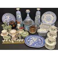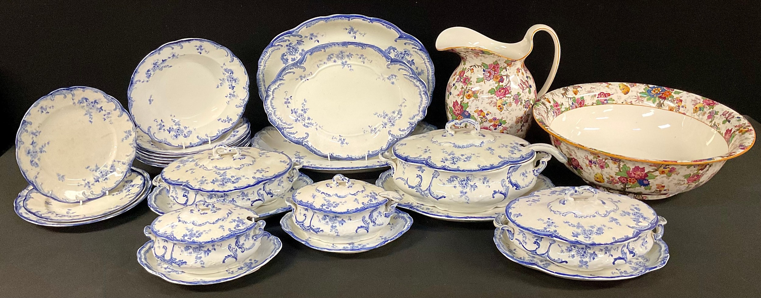 An early 20th century Ridgways Chiswick part dinner service, comprising tureens, graduated meat plates, dishes, etc, qty; a Crown Ducal wash jug and basin